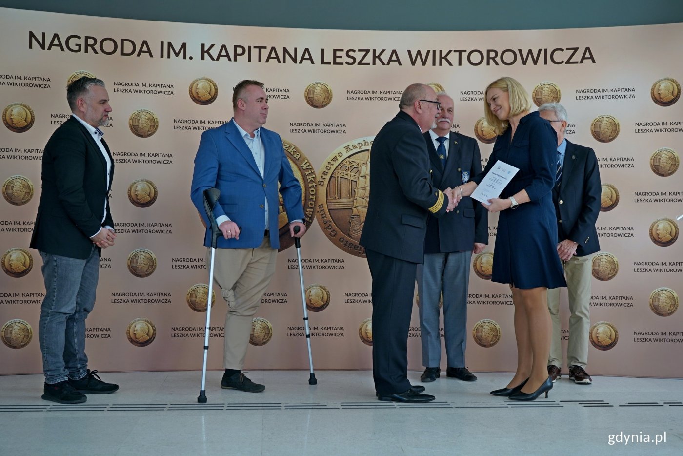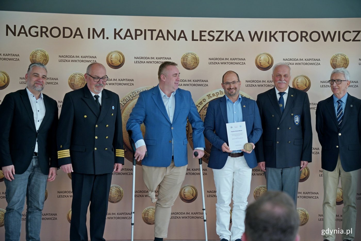 Wspólne zdjęcie laureatów, prezydent Gdyni i członków kapituły. Od lewej: Paweł Brutel - dyrektor Gdyńskiego Centrum Sportu, Arkadiusz Dzierżyński - radny Gdyni, kpt. ż. w. Mariusz Wiktorowicz – syn kpt. Wiktorowicza i przewodniczący kapituły, kpt. Magda Makowska - laureatka Nagrody Specjalnej im. Kapitana Leszka Wiktorowicza, kpt. Michał Bielski - laureat Nagrody im. Kapitana Leszka Wiktorowicza, prezydent Gdyni Aleksandra Kosiorek, Marek Padjas z Bractwa Kaphornowców oraz Waldemar Heflich z Press Clubu Polska (fot. Magdalena Czernek)