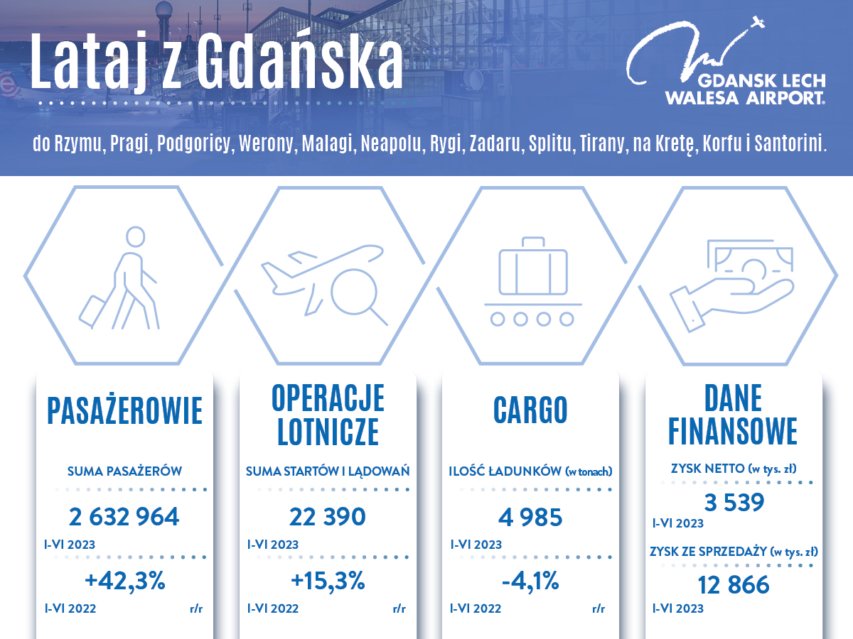 Jest dobrze, a może być jeszcze lepiej! Gdańskie lotnisko podsumowało pierwsze półrocze bieżącego roku. Statystyki jasno pokazują, że od stycznia do czerwca przez port lotniczy przewinęło się więcej pasażerów, niż w tym samym okresie czasu w poprzednich latach. Więcej wykonano również operacji lotniczych. Port Lotniczy im. Lecha Wałęsy w Gdańsku w ciągu zaledwie sześciu miesięcy 2023 roku obsłużył aż 2 632 964 pasażerów! To aż o 42,3% więcej niż w tym samym okresie roku 2022, a o 6,9% więcej niż w rekordowym dla gdańskiego lotniska roku 2019. Będzie nowy rekord? Dobre, a nawet bardzo dobre wyniki gdańskiego lotniska. Mat. pras. - Po sześciu miesiącach mamy ponad 2 miliony 600 tysięcy pasażerów, to jest prawie 7% więcej niż w rekordowym 2019 roku. Dalej podtrzymujemy nasze plany, że będziemy próbowali pobić rekord 2019, czyli przekroczyć w skali roku liczbę 5,4 mln obsłużonych pasażerów. Pierwsze półrocze pokazuje, że faktycznie idziemy na rekord. 7% więcej pasażerów zostało przewiezionych mniejszą liczbą samolotów, a to znaczy, że linie lotnicze mają lepszą efektywność i lepsze wyniki ekonomiczne, a my jesteśmy tym bardzo zainteresowani – informuje Tomasz Kloskowski, prezes Portu Lotniczego Gdańsk im. Lecha Wałęsy. Więcej pasażerów, więcej operacji lotniczych Nie tylko zwiększyła się liczba pasażerów, ale i operacji lotniczych. Przez pierwsze sześć miesięcy 2023 w Gdańsku zrealizowano aż 22 390 operacji lotniczych, czyli o 15,3% więcej niż w 2022, a zaledwie o 2,2% mniej niż w 2019. Zwiększyła się liczba pasażerów w porównaniu z latami poprzednimi. Mat. pras. Najpopularniejsze kierunki, jakie wybierali pasażerowie latający z Gdańska? Na pierwszym miejscu Londyn (243 224), potem Oslo (202 702) i Sztokholm (165 210). Najwięcej lotów do i z Gdańska realizowały dwie linie lotnicze: Ryanair (40,9%) i Wizz Air (40,6%). W sumie latało do Gdańska 9 przewoźników. - Jesteśmy już w sytuacji pełnego odbicia rynku lotniczego po pandemii. Znajdujemy się jednak w innych, trudniejszych warunkach ekonomicznych niż przed pandemią. Wskaźniki makroekonomiczne są inne, mamy kryzys energetyczny, na który wpływa także wojna w Ukrainie, w wielu krajach jest widmo recesji. Te wakacje pokażą, jaka jest faktycznie sytuacja w branży. Zależymy od klientów, ich wyborów i chęci latania. Jestem umiarkowanym optymistą, uważam, że rynek będzie się nadal rozwijał, liczba pasażerów w kolejnych latach będzie rosła, nie wiadomo jednak w jakim tempie – mówi Tomasz Kloskowski. Pozytywne wyniki finansowe mimo rosnących kosztów Po sześciu miesiącach 2023 roku Port Lotniczy Gdańsk osiągnął 3 538 770 zł zysku netto oraz 12 866 042 zł zysku ze sprzedaży. Prezes Kloskowski podkreśla, że wyniki są pozytywne, bo są na plusie, ale wypracowane w bardzo trudnych warunkach rynkowych, przy bardzo wysokich i rosnących kosztach. Lotnisko w Gdańsku przez dwa kwartały 2023 przyjęło i odprawiło 4 985 ton cargo. Było to o 4,1% mniej towarów i poczty niż w tym samym okresie 2022, ale o 43,3% więcej niż w I-VI 2019 roku. Port lotniczy - liczby i dane Pasażerowie w poszczególnych miesiącach 2023 roku: Styczeń 345 183 Luty 315 804 Marzec 369 989 Kwiecień 485 964 Maj 526 882 Czerwiec 589 142 Aktualna w 2023 roku siatka ma 84 połączenia z Gdańska, realizowane przez 9 linii lotniczych do 24 krajów, na 71 lotnisk. Linie lotnicze, operujące z gdańskiego lotniska. Mat. pras. Dokąd polecimy z Gdańska? Ryanair: Aarhus, Alicante, Barcelona-El Prat, Belfast, Billund, Bristol, Burgas, Chania/Kreta, Cork, Dublin, Edynburg, Goteborg, Hamburg, Kopenhaga, Korfu, Kraków, Leeds-Bradford, Londyn-Stansted, Lublin, Malaga, Malta, Manchester, Mediolan-Bergamo, Neapol, Newcastle, Oslo-Torp, Pafos, Paryż-Beauvais, Piza, Podgorica, Praga, Ryga, Rzym, Santorini, Sztokholm-Arlanda, Vaxjo, Wenecja, Wrocław, Zadar; Wizz Air: Aberdeen, Alesund, Alicante, Barcelona El-Prat, Bergen, Burgas, Dortmund, Edynburg, Eindhoven, Goteborg, Hamburg, Haugesund, Heraklion/Kreta, Kolonia-Bonn, Kopenhaga, Kutaisi, Larnaka, Leeds-Bradford, Liverpool, Londyn-Luton, Malaga, Malmo, Oslo-Gardermoen, Oslo-Torp, Paryż-Beauvais, Rejkiawik-Keflavik, Split, Stavanger, Sztokholm-Skavsta, Teneryfa, Tirana, Tromso, Trondheim, Turku; LOT: Warszawa, Rzeszów, Zielona Góra; Lufthansa: Frankfurt, Monachium; Norwegian: Bergen, Oslo-Gardermoen; Amsterdam KLM; Kopenhaga SAS; Zurych SWISS; Dusseldorf Eurowings. Opublikowano: 20.07.2023 11:37 Autor: Zygmunt Gołąb (z.golab@gdynia.pl) Zmodyfikowano: 21.07.2023 09:11 Zmodyfikował: Paweł Jałoszewski