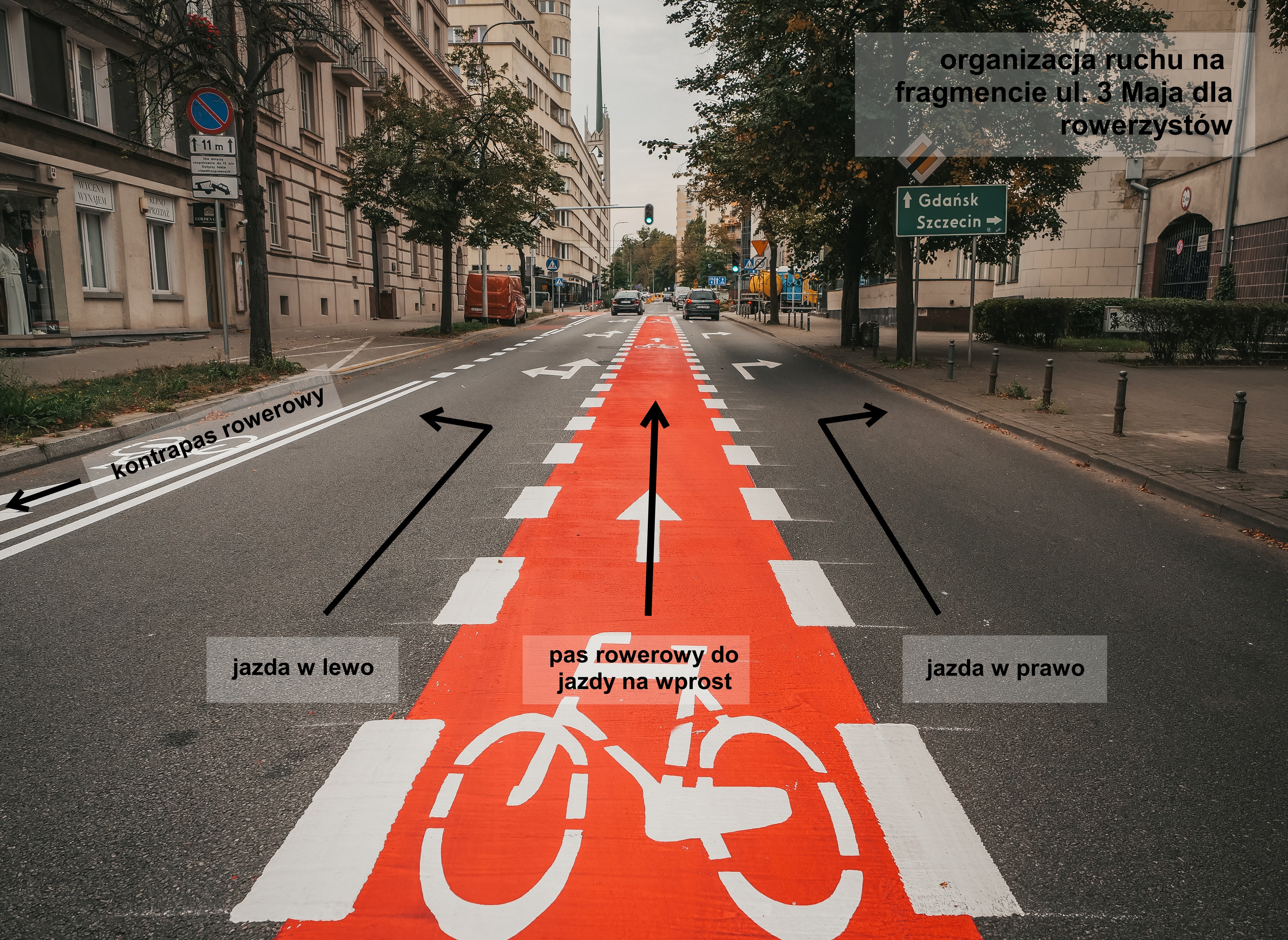 W miniony weekend na ul. 3 Maja wytyczony został nowy pas ruchu dla rowerów. Po wprowadzeniu zmian miłośnicy jednośladów mogą wykonywać te same manewry, co wcześniej, mają jednak do dyspozycji pas ruchu na wprost w kierunku ul. Armii Krajowej. Kierowcy korzystają z takiej samej liczby pasów ruchu, jak wcześniej. Oznakowanie poziome zostało uzupełnione na fragmencie ul. 3 Maja – od ul. Zgody do ul. 10 Lutego. Po wprowadzeniu zmian rowerzyści mogą skorzystać z nowego pasa ruchu, jadąc na wprost w kierunku ul. Armii Krajowej. Jeśli chcą skręcić w prawo – powinni skorzystać z pasa ruchu do jazdy w prawo, podobnie jak kierowcy. Jeśli chcą skręcić w lewo, powinni poruszać się pasem do jazdy na wprost i w lewo, razem z kierowcami. Oznakowanie na ul. 3 Maja to część większego projektu planowanego na ulicach Śródmieścia, realizowanego na wniosek mieszkańców oraz Rady Dzielnicy. Roboty będą kontynuowane. Przypomnijmy, że na fragmencie ul. 3 Maja od ul. Starowiejskiej do ul. Obrońców Wybrzeża obowiązuje również kontrapas rowerowy. Opublikowano: 11.09.2024 10:05 Autor: Magdalena Wojtkiewicz (m.wojtkiewicz@zdiz.gdynia.pl) Zmodyfikowano: 11.09.2024 16:39 Zmodyfikował: Karolina Szypelt
