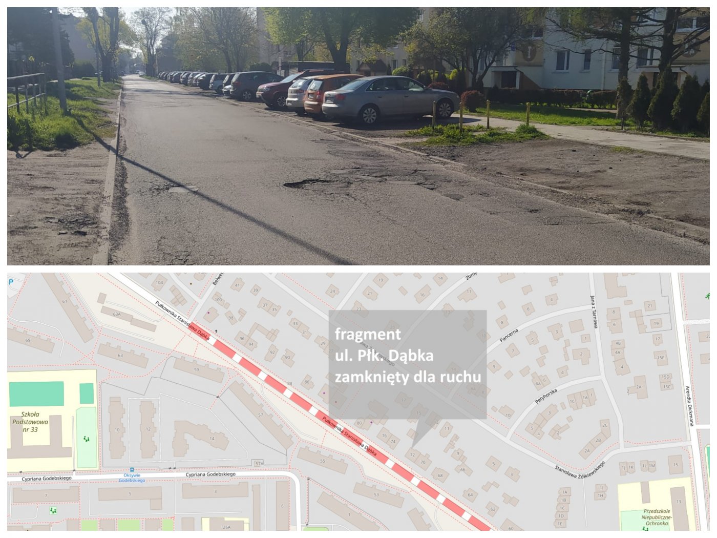 W najbliższych dniach rozpocznie się remont nawierzchni ul. Płk. Dąbka na fragmencie od ul. Belwederskiej do numeru 60. Nawierzchnia na tym odcinku będzie wymieniana odcinkowo. Prace będą wiązać się ze zmianami w organizacji ruchu – remontowany odcinek zostanie zamknięty dla ruchu. Wymiana nawierzchni na ul. Płk. Dąbka rozpocznie się 29 kwietnia i potrwa do 1 maja. Remont obejmie fragment od ul. Belwederskiej do ul. Płk. Dąbka 60. Prace drogowe celowo zaplanowane zostały w dniach, w których część mieszkańców nie będzie zmierzać do pracy/szkoły z uwagi na przedłużony weekend majowy, celem jest zminimalizowanie ew. utrudnień. Remont tego odcinka drogi jest konieczny z uwagi na liczne ubytki i wzmożony ruch wynikający z objazdu trwającej przebudowy ul. Unruga. Po remoncie, jazda na tym fragmencie będzie zdecydowanie bardziej komfortowa i bezpieczna. Na czas prac wprowadzone zostaną zmiany w organizacji ruchu, remontowany fragment ul. Płk. Dąbka zostanie zamknięty dla ruchu, objazd będzie odbywał się ul. Żółkiewskiego. Prace zostaną wykonane możliwie jak najszybciej. źródło: OpenStreetMapProsimy wszystkich uczestników ruchu o ostrożność oraz o dostosowanie się do zmian w organizacji ruchu. Roboty są realizowane przez Zarząd Dróg i Zieleni w Gdyni w ramach prac utrzymaniowych. Opublikowano: 25.04.2024 12:57 Autor: Magdalena Wojtkiewicz (m.wojtkiewicz@zdiz.gdynia.pl) Zmodyfikowano: 25.04.2024 13:35 Zmodyfikował: Agnieszka Janowicz