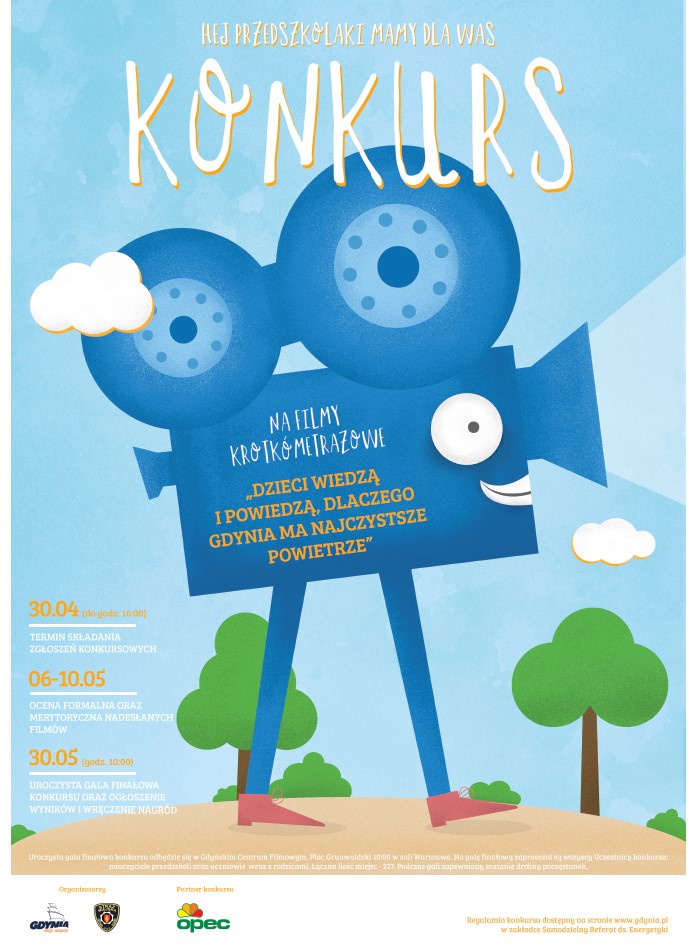 Zapraszamy na uroczystą galę rozdania nagród, która odbędzie się 30 maja 2019 o godzinie 10.00 w Gdyńskim Centrum Filmowym w sali Warszawa.Serdecznie zapraszamy gdyńskie przedszkola do udziału w II edycji konkursu na filmy krótkometrażowe pn: "Dzieci wiedzą i powiedzą, dlaczego Gdynia ma najczystsze powietrze".Przedmiotem konkursu są maksymalnie 5 minutowe filmy, na których dzieci dzielą się swoją wiedzą na temat następujących zagadnień:· jakie są zalety ciepła z miejskiej sieci ciepłowniczej?· jak oszczędzać ciepło w domu?· jak dbać o czystość powietrza? Zgłoszenia praca konkursowych następuje za pośrednictwem przedszkola do Urzędu Miasta Gdyni w Samodzielnym Referacie ds. Energetyki, ul. 10 Lutego 24, pok. 505, w godzinach 8.00-16.00 do dnia 17 maja 2019 r. do godziny 16:00. Regulamin konkursu pobierz. Do wygrania 15 nagród w formie 500 złotowego vouchera do wydania w wybranej przez placówkę hurtowni papierniczej oraz drobne upominki dla wszystkich małych aktorów. Zachęcamy do udziału! Organizatorzy konkursu:Zespół Samodzielnego Referatu ds. Energetyki UM Gdyni i Straż Miejska z Gdynioraz Partner konkursu i fundator nagród firma OPEC z Gdyni Do pobrania plakat jpg142kb Opublikowano: 01.04.2019 14:06 Autor: Hanna Górecka-Banasik (ref.energetyki@gdynia.pl) Zmodyfikowano: 24.05.2019 10:04 Zmodyfikował: Hanna Górecka-Banasik