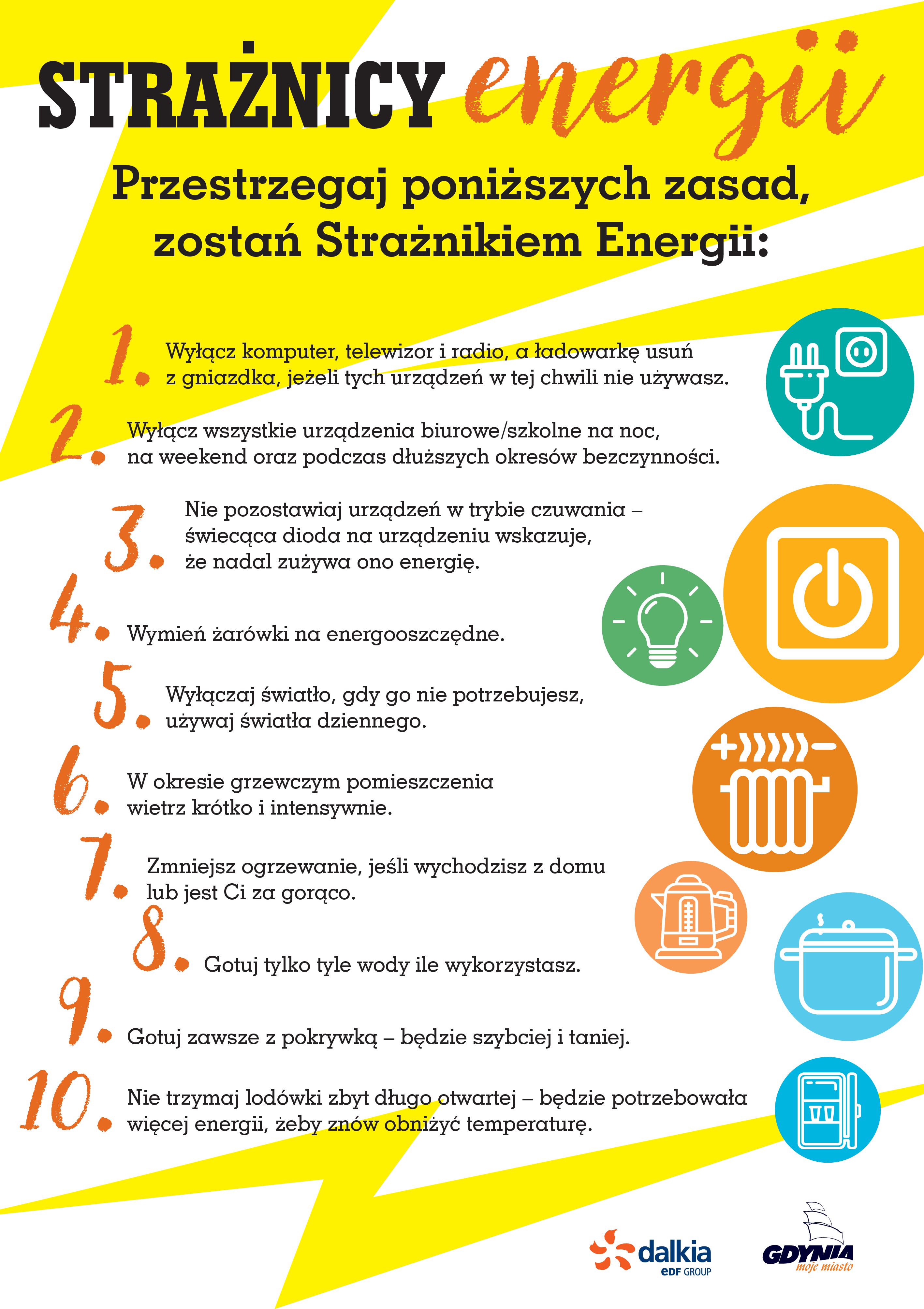 Uczniowie w dziesięciu gdyńskich podstawówkach pilnują by w szkole nie marnowała się energia. Połowa tego co uda się zaoszczędzić w bardzo namacalnej, bo pieniężnej formie wróci do placówki, która będzie mogła wydać całą kwotę na potrzeby uczniów.Szkoły biorące udział w projekcie:• SP nr 8, ul. Orłowska 27/33• SP nr 17, ul. Grabowo 12• SP nr 20, ul. Starodworcowa 36• SP nr 23, ul. Grottgera 19• SP nr 26, ul. Wolności 25• SP nr 26, ul. Tatrzańska 40• SP nr 29, ul. Ściegiennego 8• SP nr 39, ul. Unruga 88• SP nr 40, ul. Rozewska 33• SP nr 40, ul. Gospodarska 1Założeniem projektu jest edukacja ekologiczna dzieci i młodzieży w zakresie oszczędzania energii i ochrony klimatu, w oparciu o współpracę gminy z podległymi jej szkołami w ramach wdrażania tzw. metodologii 50/50. Jej wprowadzenie ma doprowadzić do ograniczenia zużycia energii poprzez aktywne zaangażowanie użytkowników budynków (uczniów, nauczycieli i administratorów) w proces zarządzania energią, a w efekcie do redukcji jej zużycia.Na ochronę środowiska i oszczędności w użyciu energii przekładają się proste działania, takie jak utrzymywanie właściwej temperatury i poprawne wietrzenie pomieszczeń, energooszczędne oświetlanie, a także zmiana codziennych nawyków. Takie właśnie prawie bezkosztowe metody przynoszą rezultaty, które mogą zadziwić. W ramach projektu, dzieci i młodzież gdyńskich szkół nauczą się właściwego gospodarowania energią elektryczną oraz ciepłem. Będzie to miało pozytywny wpływ na rozwijanie właściwych postaw ekologicznych i aktywizacji proekologicznej środowiska nauczycielskiego oraz rozwijanie wiedzy dotyczącej ochrony klimatu.Zwieńczeniem projektu jest osiągnięcie w budynkach szkół zmniejszenia zużycia energii i związanych z tym oszczędności finansowych. Połowa wysokości zaoszczędzonych środków zostanie wypłacona szkołom w formie jednorazowego grantu.Partnerem projektu jest Dalkia Polska Sp. z o.o. z siedzibą w Warszawie, z którą Gdynia zawarła w październiku 2018 roku porozumienie na rzecz zwiększenia efektywności energetycznej budynków w Gdyni, a „Strażnicy energii” są jednym z elementów tej współpracy. Cel projektu jest zgodny z dążeniem Gminy Miasta Gdyni w kierunku kształtowania postaw ekologicznych wśród dzieci i młodzieży oraz dążeniem do realizacji przedsięwzięć służących poprawie efektywności energetycznej i ochronie klimatu. Koordynator projektu:Agnieszka KotłowskaSamodzielny Referat ds. EnergetykiUrząd Miasta GdyniTel. 58 668 23 52ref.energetyki@gdynia.plProjekt pod honorowym patronatem Prezydenta Gdyni Wojciecha Szczurka Do pobrania logo projektu jpg170kb prezentacja pdf1869kb zasady udziału pdf89kb zasady wyliczania oszczednosci pdf98kb patronat honorowy pdf407kb plakat jpg831kb Opublikowano: 16.09.2019 15:21 Autor: Hanna Górecka-Banasik (ref.energetyki@gdynia.pl) Zmodyfikowano: 17.09.2019 11:28 Zmodyfikował: Hanna Górecka-Banasik