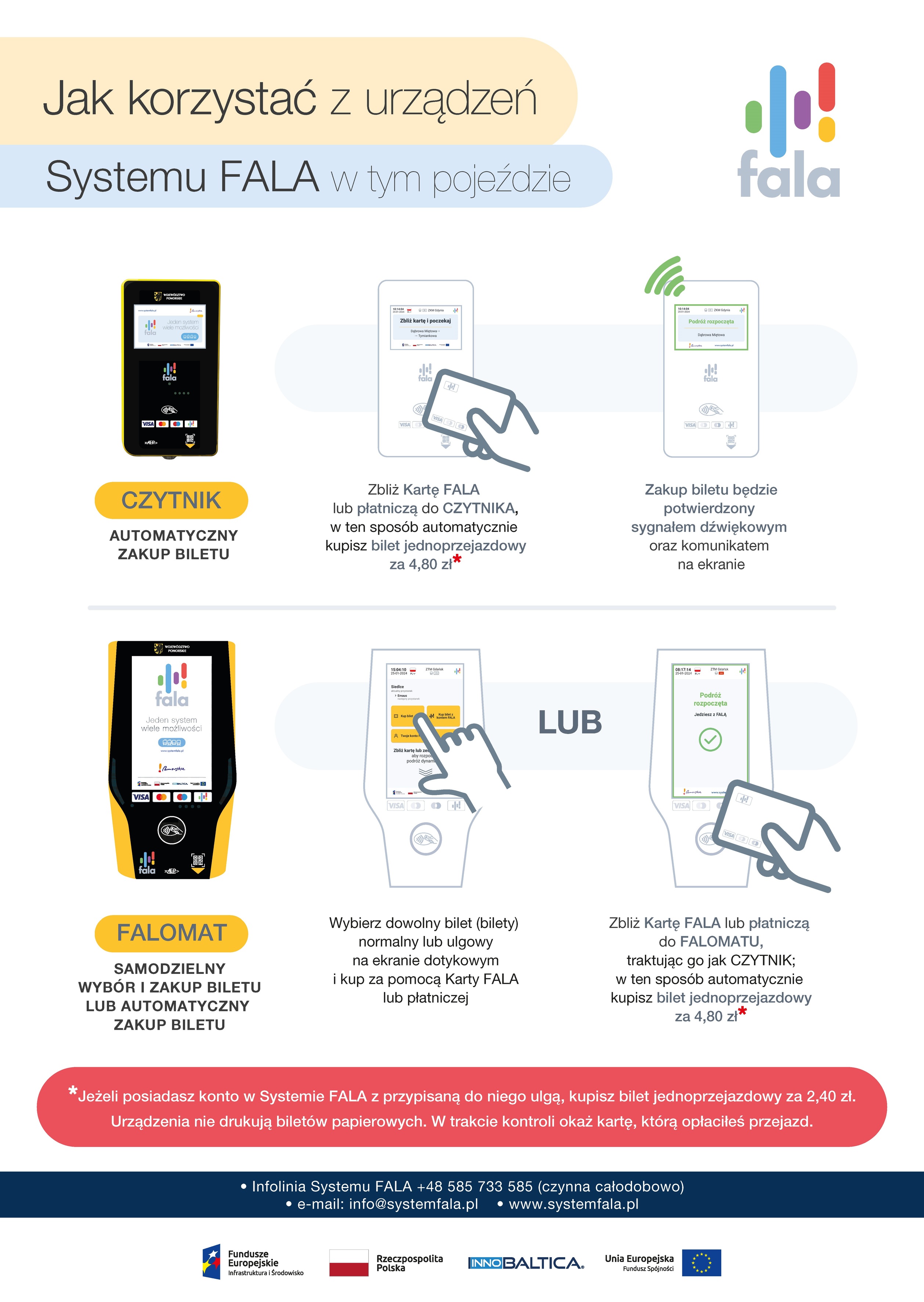 22 lutego w ramach systemu FALA zostaną włączone urządzenia w 270 autobusach ZKM Gdynia. Tym samym projekt obejmie już wszystkie kursujące w Trójmieście autobusy, trolejbusy i tramwaje. Kolejnym etapem testowego upubliczniania systemu będzie dołączenie do niego pociągów SKM i Polregio (w tym linii PKM). Został on zaplanowany na wiosnę tego roku. System FALA został testowo wdrożony już we w siedmiu miastach w Pomorskiem uczestniczących w projekcie. To Gdańsk, Gdynia, Chojnice, Puck, Władysławowo, Słupsk i Lębork, a także pośrednio objął liczne gminy ościenne, które są obsługiwane przez danego organizatora transportu. Po dołączeniu do systemu gdyńskich autobusów urządzenia systemu obsłużą pasażerów już we wszystkich pojazdach w sieci ZKM w Gdyni i ZTM w Gdańsku. - Mamy już w Trójmieście ok. 800 pojazdów w systemie. Do dyspozycji mieszkańców i turystów są nasze czytniki kart oraz falomaty, które w prosty sposób umożliwiają nabycie elektronicznych biletów jednorazowych czy czasowych – komentuje Radomir Matczak, prezes spółki InnoBaltica, odpowiedzialnej za wdrożenie projektu. – Oczywiście, na etapie testowym zdarzają się problemy czy niesprawność urządzeń, które ekipy wykonawcy, Asseco Data Systems oraz nasi specjaliści konsekwentnie usuwają. Będziemy wdzięczni za zgłaszanie usterek. Niemniej, generalnie od teraz w każdym pojeździe komunikacji miejskiej w Trójmieście pasażer powinien mieć możliwość zakupu elektronicznego biletu z wykorzystaniem swojej karty płatniczej lub Karty FALA – dodaje. System Fala już w gdyńskich autobusach. Fot. mat. prasowe InnoBaltica Wiosną testy na kolei Kolejnym kamieniem milowym w projekcie będzie kilkuetapowy proces testowego upublicznienia systemu FALA w ramach połączeń kolejowych Polregio i PKP SKM Trójmiasto na terenie całego województwa (ponad 200 stacji i przystanków). Aktualnie trwają testy wewnętrzne i konsultacje eksperckie z przewoźnikami. Jak korzystać z systemu FALA? Fot. mat. prasowe InnoBaltica System FALA to narzędzie znacząco ułatwiające korzystanie z komunikacji publicznej. Tym co, wyróżnia FALĘ od rozwiązań komercyjnych, jest obszar działania – system obejmie całe województwo pomorskie, z możliwością włączania kolejnych gmin, oraz fakt, że łączy w sobie wiele elementów i funkcjonalności rozproszonych dziś w różnych miejscach. System w docelowej wersji działać będzie według zasady „wsiadaj i jedź” – nie wymaga od pasażera znajomości cen biletów i zawiłości ponad 100 taryf obowiązujących w województwie. Wystarczy zaznaczyć swoją obecność w pojeździe poprzez proste kliknięcie w aplikacji „System FALA” lub przyłożenie karty do czytnika.Każda osoba zarejestrowana w systemie FALA będzie mogła zarządzać swoim kontem np. przypisywać własne uprawnienia do ulg, czy podpiąć do swojego konta kartę płatniczą. Umożliwi to automatyczne naliczenie ulgi i płacenie za przejazdy. Jeśli ktoś nie chce przypinać karty może zasilić swoją e-portmonetkę – także dostępną przez aplikację i portal pasażera. Co ważne – konto FALA warto mieć, ale nie jest to obligatoryjne, by korzystać z udogodnień. Opublikowano: 22.02.2024 16:00 Autor: Zygmunt Gołąb (z.golab@gdynia.pl) Zmodyfikowano: 22.02.2024 17:17 Zmodyfikował: Agnieszka Janowicz