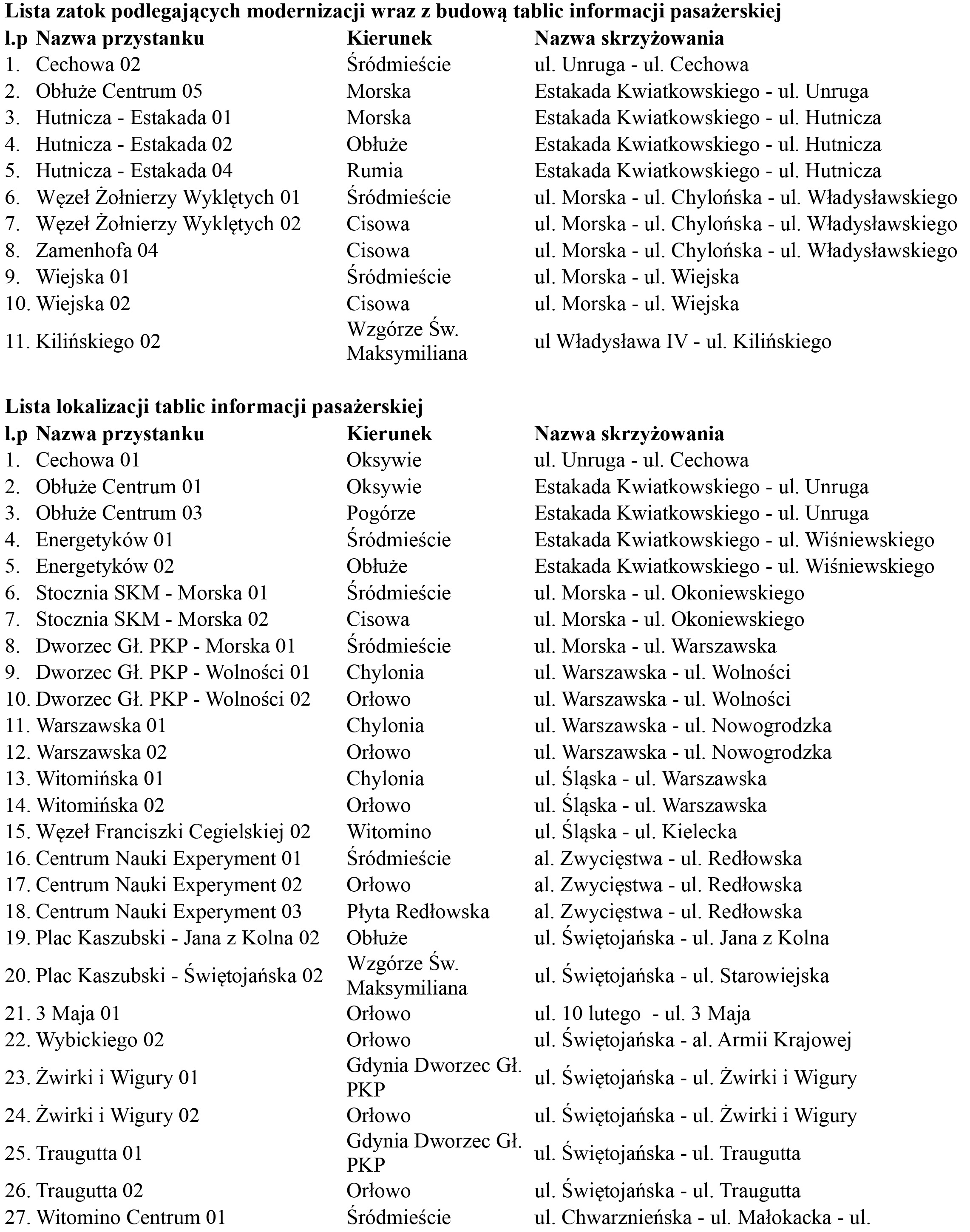 W naszym mieście zmodernizowanych zostanie 11 zatok przystankowych. Powstanie też 41 tablic informacji pasażerskiej, zintegrowanych z Systemem Zarządzania i Sterowania Ruchem TRISTAR.Modernizacja zatok przystankowych obejmować będzie przebudowę konstrukcji nawierzchni (zastosowana zostanie nawierzchnia betonowa) wraz z wymianą przyległych do nich krawężników, chodników i ścieżek rowerowych. Z myślą o osobach z niepełnosprawnościami zastosowane zostaną systemy płytek naprowadzających. Nowe tablice informacji pasażerskiej pojawią się zarówno w modernizowanych zatokach, jak i w innych lokalizacjach o intensywnym ruchu pasażerskim. Będą one funkcjonalnie tożsame z istniejącymi już urządzeniami, zainstalowanymi w ramach budowy systemu TRISTAR. Dzięki nim pasażerowie transportu zbiorowego oczekujący na przystanku, otrzymają informację o rzeczywistych czasach odjazdu pojazdów. Dodatkowym ułatwieniem dla osób z niepełnosprawnościami będzie funkcja wyzwalania informacji głosowej, odczytująca treść wyświetlaną w danej chwili na ekranie. Dzięki tej inwestycji liczba tablic przystankowych w Gdyni do końca 2018 roku wzrośnie z 34 do 75 sztuk. Celem inwestycji jest rozwój zrównoważonego transportu publicznego w Gdyni oraz integracja przestrzenna i funkcjonalna podsystemów publicznego transportu zbiorowego, a także zwiększenie konkurencyjności transportu publicznego wobec transportu indywidualnego. Przyczyni się również do zmniejszenia negatywnego wpływu transportu pasażerskiego na zanieczyszczenie środowiska oraz pozwoli na zwiększenie udziału osób z niepełnosprawnościami w życiu kulturalnym i społecznym. Poniżej lista lokalizacji planowanych robót: Zadanie stanowi część projektu „Rozwój zrównoważonego transportu publicznego w Gdyni poprzez inwestycje infrastrukturalne, m.in. utworzenie węzła integracyjnego Gdynia Chylonia”, realizowanego w ramach Programu Operacyjnego Infrastruktura i Środowisko 2014 – 2020, Osi Priorytetowej VI Rozwój niskoemisyjnego transportu zbiorowego w miastach, Działania 6.1 Rozwój publicznego transportu zbiorowego w miastach, dofinansowanego ze środków Funduszu Spójności w wysokości 75% kosztów kwalifikowalnych. Opublikowano: 31.01.2018 14:00 Autor: Marta Jaszczerska-Zawadzka (m.jaszczerska@gdynia.pl) Zmodyfikowano: 09.02.2018 09:44 Zmodyfikował: Marta Jaszczerska