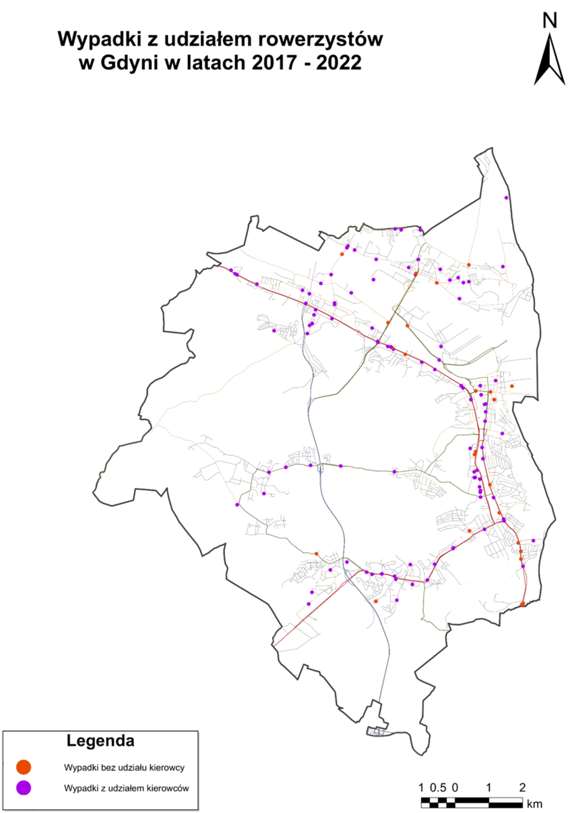 Aktywności jednośladem na terenie naszego miasta możemy zintensyfikować, zapewniając bezpieczeństwo wszystkim użytkownikom ruchu rowerowego. W tym celu Gdynia rozwija siatkę połączeń rowerowych, uspokaja ruch samochodowy i działa na rzecz zwiększania świadomości społecznej. - Stale monitorujemy sytuację ruchu rowerowego w naszym mieście, aktualnie pracujemy nad Strategią Rowerową dla Gdyni na lata 2023-2030, dokumentem który obejmie szereg działań, skupiających się na trzech głównych elementach m.in. na infrastrukturze oraz promocji i zwiększaniu rowerowej świadomości gdynian. Niewątpliwie jednym z priorytetowych celów horyzontalnych miasta w zakresie ruchu rowerowego, jest bezpieczeństwo osób korzystających z roweru jako środka transportu. - podkreśla Marek Łucyk, wiceprezydent Gdyni ds. rozwoju. W ramach diagnozy bezpieczeństwa opracowywanej Strategii Rowerowej, stworzona została mapa drogowa wypadków z udziałem rowerzystów, pozwoliło to na szczegółową analizę, wskazanie newralgicznych miejsc na mapie miasta i działanie w zakresie zwiększania bezpieczeństwa na tych obszarach.Mapa wypadków drogowych z udziałem rowerzystów w latach 2017-2022 w GdyniŹródło: Opracowanie Zarządu Dróg i Zieleni w Gdyni na podstawie danych z systemu TRISTARPowyższa mapa prezentuje wypadki drogowe z udziałem rowerzystów z lat 2017-2022, zarejestrowane w Systemie Ewidencji Wypadków i Kolizji, udostępnionych przez Komendę Główną Policji w Warszawie, w podziale na dwie grupy, wypadki bez i z udziałem kierowcy. Do wypadków z udziałem kierowców najczęściej dochodziło na głównych ciągach komunikacyjnych - na skrzyżowaniach lub zjazdach, czyli w miejscach, gdzie ruch samochodowy krzyżuje się z dobrej jakości infrastrukturą rowerową m.in. na ul. Morskiej, Puckiej, przy skrzyżowaniu z ul. Unruga, ul. Chwaszczyńska wraz z ul. Wielkopolską czy ul. Chwarznieńskiej. W drugiej połowie maja 2023 zostało także przeprowadzone badanie wśród mieszkańców Miasta Gdyni, dotyczące potrzeb i oczekiwań w zakresie ruchu rowerowego. Jedno z dwóch otwartych pytań zachęcało respondentów do wskazania max. trzech lokalizacji w mieście, wpływających negatywnie na ich poczucie bezpieczeństwa jako rowerzystów. Zdecydowana większość odpowiedzi zawiera lokalizację, które powtarzały się co najmniej kilkadziesiąt razy są to m.in. ul.Janka Wiśniewskiego, Al. Zwycięstwa oraz ul. Chwaszczyńska/Wielkopolska i pokrywają się one z miejscami na mapie wypadków. Najczęściej dotyczyły one ubytków, bądź nierówności w infrastrukturze rowerowej oraz braku poczucia bezpieczeństwa na ulicach, gdzie ruch rowerowy odbywa się w ruchu ogólnym. Na wszystkich wyróżnionych wyżej ulicach aktualnie realizowane są lub planowane inwestycje mające na celu poprawę bezpieczeństwa oraz komfortu użytkowników. Ponadto zadania realizowane w obrębie: ul.Chwarznieńskiej, na odcinkach w dwóch dzielnicach Witomino - Chwarzno-Wiczlino, ul. Chwaszczyńskiej wraz ul. Wielkopolską w Wielkim Kacku czy ul. Nowowiczlińskiej na Dąbrowie są poddawane kompleksowym inwestycjom, a trasy rowerowe na tych obszarach, są budowane, przebudowywane lub remontowane. W planie działań przewidziano uzupełnienie kolejnych brakujących fragmentów dróg dla rowerów, niektóre w ramach większych inwestycji, co wiąże się ze zmianami zarówno w układzie drogowym jak i organizacji ruchu. - Aktualnie przy każdej miejskiej inwestycji w Gdyni uwzględniamy bezpieczeństwo pieszych i rowerzystów – tak dzieje się przy okazji budowy dróg, budowy obiektów sportowych czy przestrzeni rekreacyjnych – podkreśla Arkadiusz Trzeciak, naczelnik Wydziału Inwestycji Urzędu Miasta Gdyni. Miasto stale dąży do poprawy warunków bezpieczeństwa i komfortu jazdy zarówno rowerzystów jak i przemieszczania się pieszych oraz pasażerów komunikacji miejskiej. W tym celu kładzie nacisk na należyte utrzymanie i ciągły rozwój infrastruktury, rozszerza strefy uspokojonego ruchu, a także dba o dobrą widoczność wszystkich uczestników ruchu drogowego, szczególnie w miejscu przecięcia toru ruchu samochodów z mniej chronionymi uczestnikami ruchu. Niezwykle istotnym elementem jest także uwrażliwienie mieszkańców, szczególnie w zakresie konieczności udzielenia pierwszeństwa oraz zachowania ostrożności w miejscach, w których może dochodzić do kolizji. Opublikowano: 20.09.2023 14:05 Autor: Dorota Matejczyk (dorota.matejczyk@gdynia.pl)