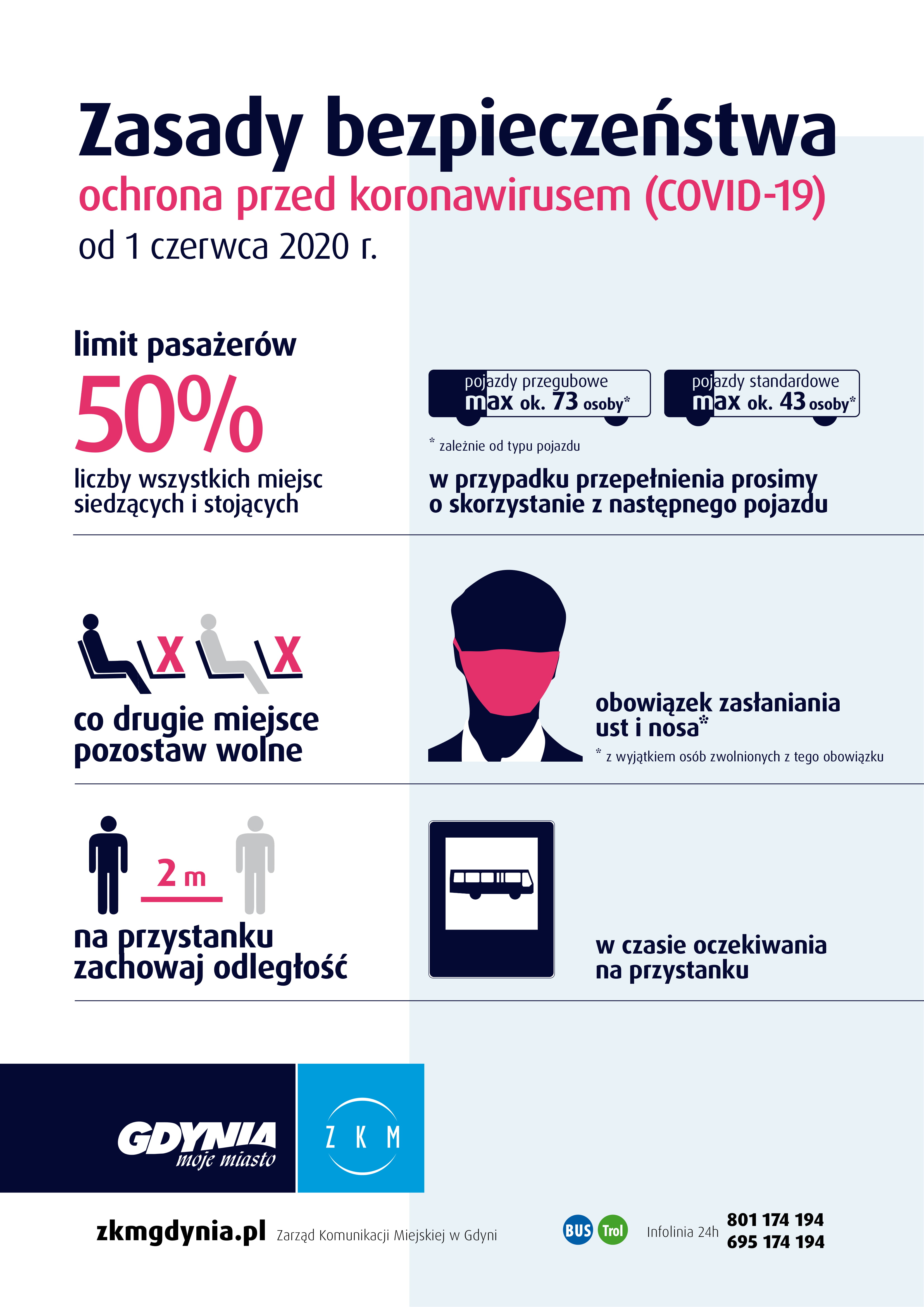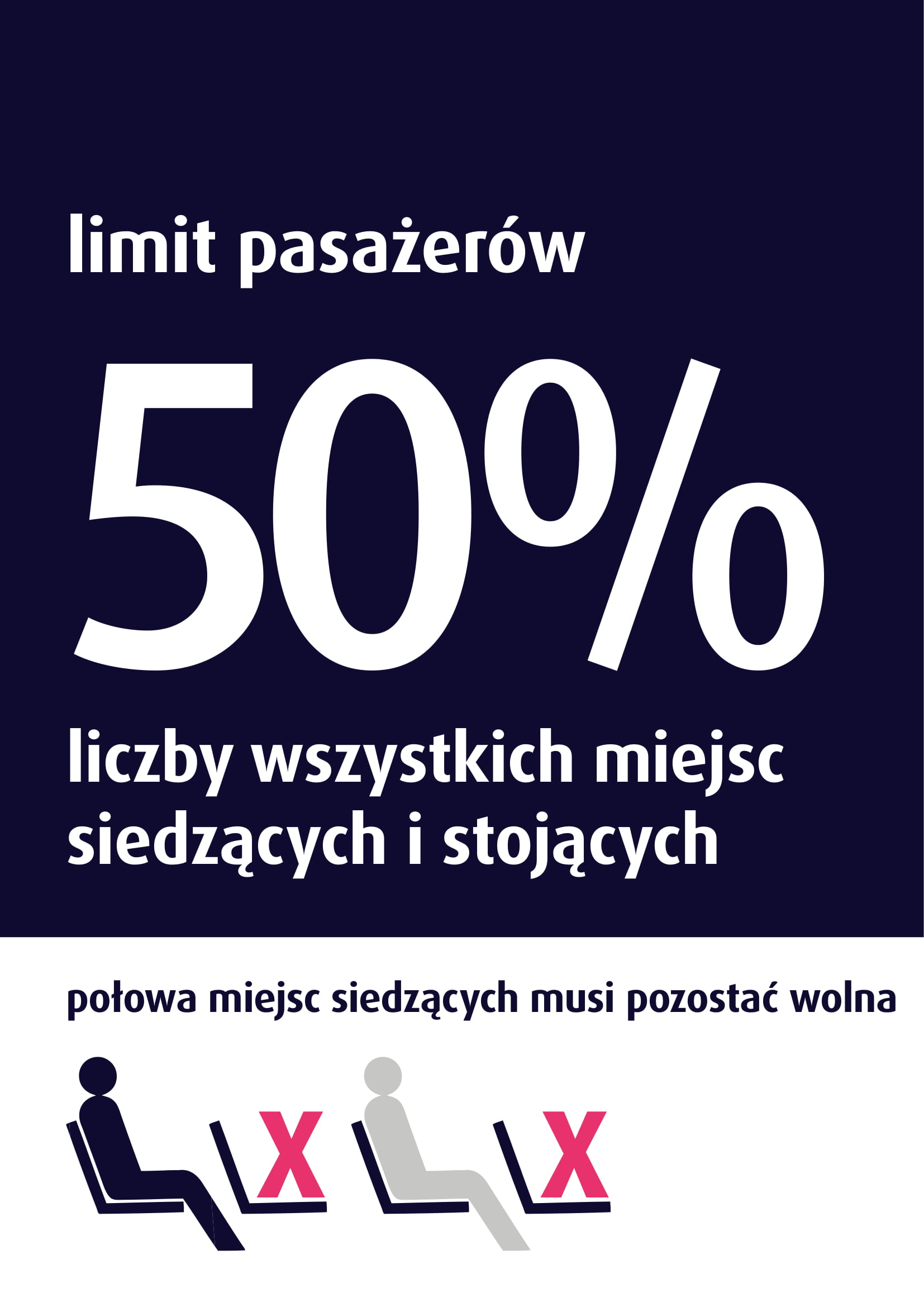 Od poniedziałku 1 czerwca limit pasażerów w pojazdach ZKM Gdynia wzrasta z 30% nominalnej liczby wszystkich miejsc siedzących i stojących do 50%. Pozwala na to opublikowane w sobotę 30 maja rozporządzenie rządu. Oznacza to, że w standardowym, 12-metrowym autobusie lub trolejbusie będą mogły podróżować średnio 43 osoby, a nie 26 jak do tej pory. Natomiast do „przegubowca” będzie mogło wejść w sumie 73 pasażerów zamiast 44. Nadal pozostaje jednak połowa wolnych miejsc siedzących. Ustawodawca dał organizatorowi transportu możliwość wyboru pomiędzy 100% liczby miejsc siedzących w pojeździe, a 50% liczby wszystkich miejsc siedzących i stojących, przy jednoczesnym pozostawieniu w środku transportu albo pojeździe co najmniej 50% miejsc siedzących niezajętych. - W Gdyni, kierując się koniecznością zapewnienia odpowiedniego dystansu pomiędzy osobami podróżującymi oraz komfortu jazdy, wybraliśmy to drugie rozwiązanie – jako zdecydowanie bezpieczniejsze dla naszych pasażerów – mówi Katarzyna Gruszecka-Spychała, wiceprezydent Gdyni ds. gospodarki. W związku z powyższym, od 1 czerwca wszystkie pojazdy gdyńskiej komunikacji miejskiej sukcesywnie oznaczane będą dwoma rodzajami plakatów informujących o nowych limitach liczby pasażerów. Na każdych drzwiach pojazdu (z wyjątkiem pierwszych) umieszczone zostaną plakaty w formacie A4 z grafiką symbolizującą obydwie nowe zasady (50% liczby wszystkich miejsc i połowa miejsc siedzących nadal wolna). Z kolei na szybie naprzeciw drugich drzwi umieszczony będzie plakat w formacie A2, szerzej informujący o zasadach bezpieczeństwa przy korzystaniu z komunikacji miejskiej. W dalszym ciągu na co drugim siedzeniu eksponuje się plakaty informujące o wyłączeniu danego siedzenia z użytku – w formacie A4. Opublikowano: 30.05.2020 15:02 Autor: Przemysław Kozłowski (p.kozlowski@gdynia.pl) Zmodyfikowano: 30.05.2020 15:56 Zmodyfikował: Przemysław Kozłowski