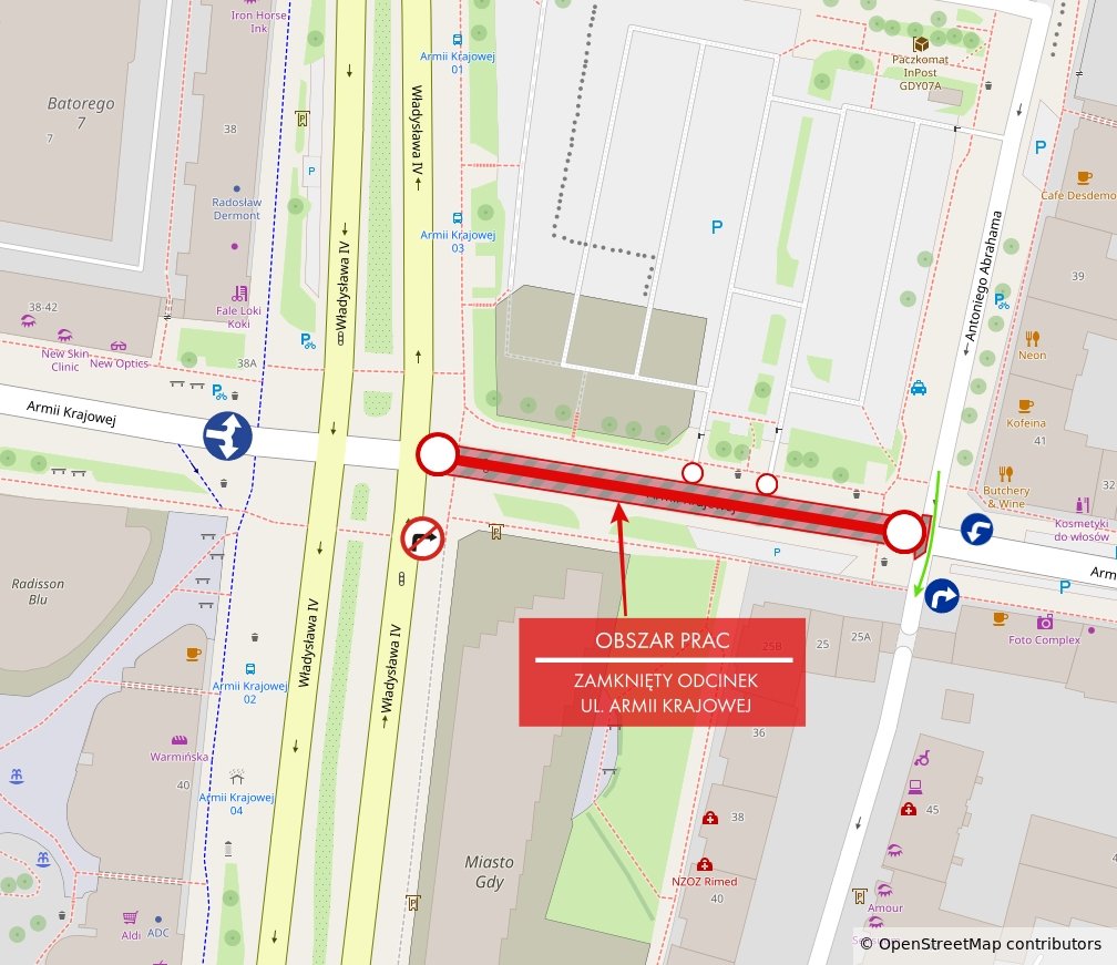 W dniach 26-27.03.2026 r. przeprowadzony zostanie remont nawierzchni ul. Armii Krajowej na odcinku od ul. Władysława IV do ul. Abrahama. Prace obejmą wymianę nawierzchni na całej szerokości jezdni. Na czas realizacji robót, przy wprowadzeniu czasowej organizacji ruchu, wspomniany odcinek ul. Armii Krajowej zostanie całkowicie zamknięty dla ruchu.Na ul. Abrahama w rejonie skrzyżowania z ul. Armii Krajowej jezdnia zostanie zawężona. Ruch pojazdów zostanie poprowadzony po istniejącym kontrapasie rowerowym. W związku z tym odcinek pasa dla rowerów zostanie czasowo wyłączony z użytkowania.Kierowców oraz pieszych prosimy o zachowanie szczególnej ostrożności i stosowanie się do wprowadzonego oznakowania.Aktualne komunikaty Zarządu Dróg Miejskich w Gdyni dostępne są na stronie: zdm-gdynia.pl. Galeria zdjęć Pobierz galerię ul. Armii Krajowej – remont nawierzchni, zamknięcie fragmentu ulicy (materiały Zarządu Dróg Miejskich w Gdyni) Pobierz zdjęcie Warunki pobierania Wszelkie prawa do zdjęć lub grafik prezentowanych w ramach portalu, należą do Prowadzącego portal lub do podmiotów z nim współpracujących i podlegają ochronie prawnej. Prowadzący portal zezwala na kopiowanie i przedstawianie utworów jedynie w celach niekomercyjnych oraz pod warunkiem zachowania go w oryginalnej postaci i zachowaniem kontekstu tematu, do którego zostało wykorzystaneprzez redakcję gdynia.pl. Opublikowane materiały powinny zawsze zawierać źródło, czyli adres strony www.gdynia.pl. Na publikowanie utworów w innych celach wymagana jest zgoda właściciela strony czyli Prowadzącego portal. Kontakt Zarząd Dróg Miejskich w Gdyni sekretariat@zdiz.gdynia.pl Opublikowano: 25.03.2026 11:00 Autor: Paweł Jałoszewski (pawel.jaloszewski@gdynia.pl) Zmodyfikowano: 25.03.2026 11:15 Zmodyfikował: Aleksandra Dylejko
