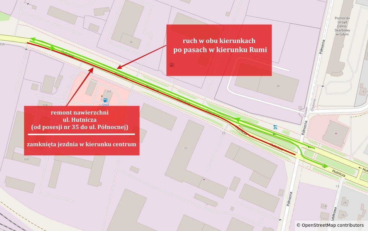 W dniach 13-16 marca 2026 r. prowadzone będą prace związane z remontem nawierzchni ul. Hutniczej na odcinku od ul. Północnej do posesji nr 35 w kierunku centrum. Na czas prowadzenia robót wdrożona zostanie czasowa organizacja ruchu. Jezdnia ul. Hutniczej w kierunku centrum zostanie zamknięta, a ruch w tym kierunku zostanie skierowany na jezdnię przeznaczoną dla przeciwnego kierunku ruchu.Ruch odbywać się będzie w obu kierunkach po pasach w stronę Rumi. Dodatkowo: zamknięty zostanie wjazd z ul. Północnej w ul. Hutniczą od strony ul. Przemysłowej – dojazd będzie możliwy przez ul. Pucką, od strony przejazdu kolejowego na ul. Północnej wprowadzony zostanie nakaz jazdy w prawo. Prosimy kierowców o zachowanie ostrożności oraz stosowanie się do wprowadzonego oznakowania tymczasowego. Galeria zdjęć Pobierz galerię ul. Hutnicza – remont nawierzchni (źódło: Zarząd Dróg Miejskich w Gdyni) Pobierz zdjęcie Warunki pobierania Wszelkie prawa do zdjęć lub grafik prezentowanych w ramach portalu, należą do Prowadzącego portal lub do podmiotów z nim współpracujących i podlegają ochronie prawnej. Prowadzący portal zezwala na kopiowanie i przedstawianie utworów jedynie w celach niekomercyjnych oraz pod warunkiem zachowania go w oryginalnej postaci i zachowaniem kontekstu tematu, do którego zostało wykorzystaneprzez redakcję gdynia.pl. Opublikowane materiały powinny zawsze zawierać źródło, czyli adres strony www.gdynia.pl. Na publikowanie utworów w innych celach wymagana jest zgoda właściciela strony czyli Prowadzącego portal. Kontakt Zarząd Dróg Miejskich w Gdyni sekretariat@zdiz.gdynia.pl Opublikowano: 12.03.2026 13:15 Autor: Paweł Jałoszewski (pawel.jaloszewski@gdynia.pl) Zmodyfikowano: 12.03.2026 13:28 Zmodyfikował: Aleksandra Dylejko
