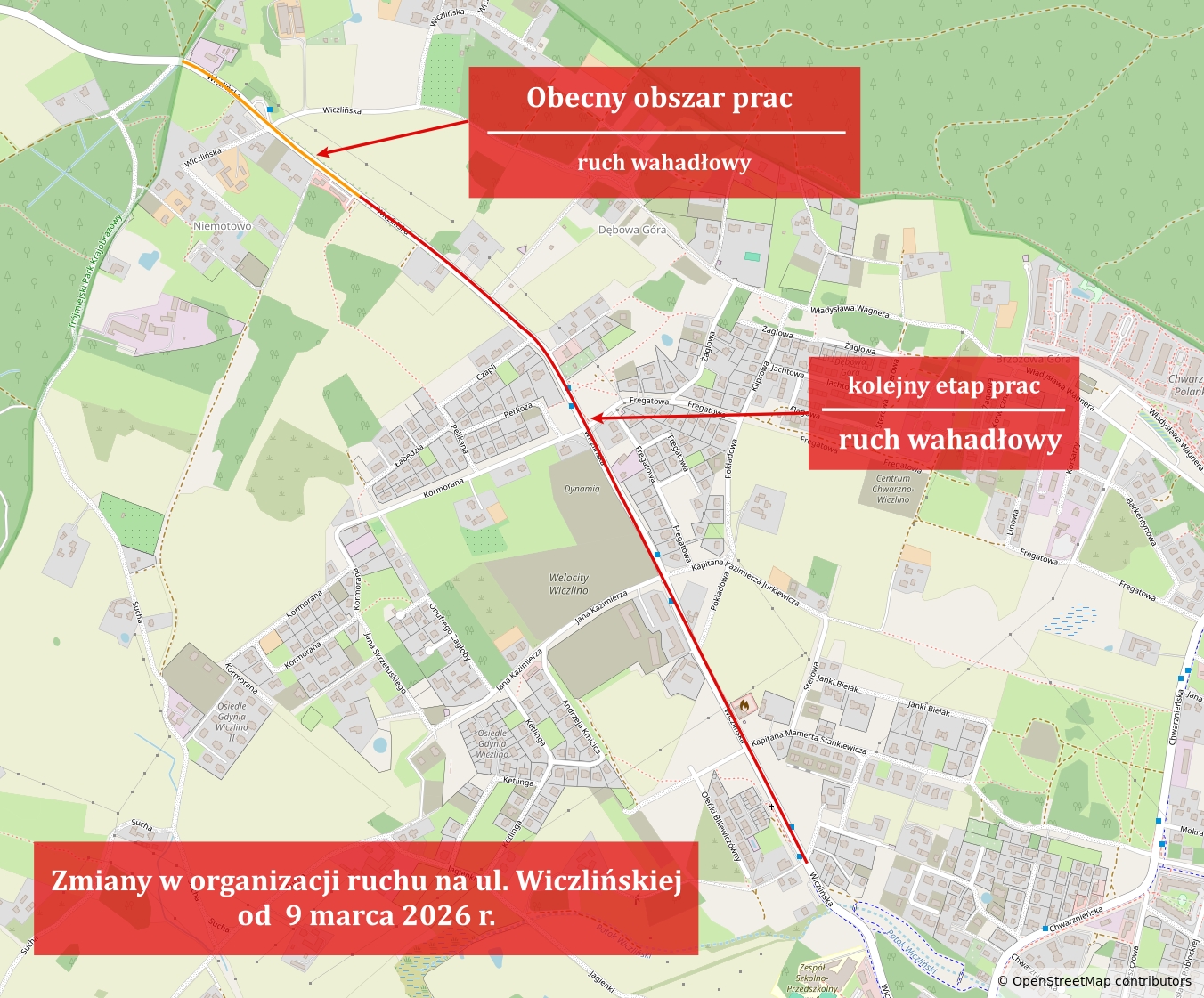 Komunikat Zarządu Dróg Miejskich w Gdyni z dn. 6.03.2026 r.: Od poniedziałku 9 marca 2026 r., od godzin porannych, na ul. Wiczlińskiej w Gdyni rozpocznie się kolejny etap prac związanych z rozbudową drogi oraz budową sieci kanalizacji sanitarnej. Roboty prowadzone będą w ramach zadania pn. „Rozbudowa ul. Wiczlińskiej na odcinku od stacji gazowej „Wiczlino” do Szkoły Podstawowej nr 37”.W związku z pracami wprowadzona zostanie czasowa organizacja ruchu. Najważniejsze zmiany: zamknięty będzie pas jezdni ul. Wiczlińskiej w kierunku ul. Marszewskiej, ruch na ul. Wiczlińskiej odbywać się będzie wahadłowo i będzie sterowany sygnalizacją świetlną, w godzinach 7:30–9:00 oraz 15:00–17:00 ruch będzie sterowany ręczne, zamknięty zostanie wylot z ul. Stankiewicza, Jurkiewicza i Pokładowej z ul. Kurcewiczówny możliwy będzie wyjazd jedynie w ul. Stankiewicza i dalej w kierunku ul. Chwarznieńskiej, objazd z ul. Stankiewicza do ul. Wiczlińskiej poprowadzony zostanie przez ul. Sterową i ul. Jurkiewicza, zamknięte zostaną wloty z ul. Pokładowej oraz z posesji nr 95E–L, wyjazd z ul. Pokładowej możliwy będzie przez ul. Jurkiewicza, przejścia dla pieszych na odcinku objętym pracami zostaną zamknięte – wyznaczone zostaną dwa tymczasowe przejścia, w rejonie tymczasowych przejść funkcjonować będą tymczasowe przystanki komunikacji miejskiej. Zakończenie tego etapu robót planowane jest na 15 maja 2026 r.Prace uzależnione są od warunków pogodowych.Prosimy kierowców i pieszych o zachowanie ostrożności oraz stosowanie się do wprowadzonego oznakowania i sygnalizacji świetlnej.Zmiany w organizacji ruchu na ul. Wiczlińskiej od 9 marca 2026 r. (źródło: Zarząd Dróg Miejskich w Gdyni) Uwaga: Nadal obowiązuje czasowa organizacja ruchu na ul. Wiczlińskiej wprowadzona od 16 lutego 2026 r. Komunikat Zarządu Dróg Miejskich w Gdyni z dn. 13.02.2026: Zmiany w organizacji ruchu na ul. Wiczlińskiej w Gdyni w związku z rozbudową drogi oraz budową sieci kanalizacji sanitarnej. Roboty prowadzone będą w ramach zadania pn. „Rozbudowa ul. Wiczlińskiej na odcinku od stacji gazowej „Wiczlino” do Szkoły Podstawowej nr 37”. Na czas prowadzenia prac wprowadzona zostanie czasowa organizacja ruchu. Zamykane będą odcinkowo pasy jezdni wraz z przyległym poboczem: od początku zakresu prac do pętli „Niemotowo” zamknięty będzie pas w kierunku ul. Marszewskiej, od pętli „Niemotowo” do posesji nr 115A zamknięty będzie pas przeciwległy. Na odcinku objętym robotami ruch odbywać się będzie wahadłowo i będzie sterowany sygnalizacją świetlną. Zmiany obejmą również rejon pętli „Niemotowo” Przejście dla pieszych zostanie przesunięte w sąsiedztwo pętli, a na tymczasowym przejściu oraz na wylotach z drogi wewnętrznej i z pętli autobusowej ustawiona zostanie sygnalizacja świetlna.Na pętli odwrócony zostanie kierunek ruchu, a wjazd będzie odbywał się w miejscu dotychczasowego wyjazdu. Wyjazd z drogi wewnętrznej przy pętli zostanie zamknięty, a objazd poprowadzony zostanie alternatywną drogą wewnętrzną.Dojazd do posesji zlokalizowanych wzdłuż odcinka objętego robotami będzie zachowany. Wyjazd spod sklepu oraz z pobliskiej drogi nieutwardzonej odbywać się będzie skrajnym zjazdem zlokalizowanym na końcu zakresu robót.Zakończenie robót planowane jest do 13 kwietnia 2026 r.Prosimy kierowców i pieszych o zachowanie ostrożności oraz stosowanie się do wprowadzonego oznakowania i sygnalizacji świetlnej.Planowany termin rozpoczęcia prac może ulec zmianie w zależności od warunków pogodowych, które mają istotny wpływ na możliwość prowadzenia robót.ul. Wiczlińska - zmiany w organizacji ruchu od 16 lutego 2026 r. (źródło: Zarząd Dróg Miejskich w Gdyni) Kontakt Zarząd Dróg Miejskich w Gdyni sekretariat@zdiz.gdynia.pl Opublikowano: 06.03.2026 12:52 Autor: Paweł Jałoszewski (pawel.jaloszewski@gdynia.pl) Zmodyfikowano: 06.03.2026 12:59 Zmodyfikował: Aleksandra Dylejko
