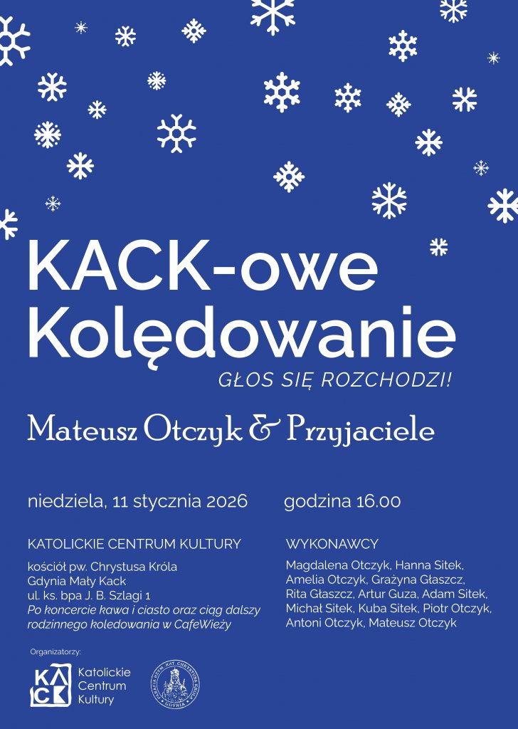 Stowarzyszenie Katolickie Centrum Kultury w Gdyni zaprasza do udziału w dwóch koncertach kolęd pt. „Głos się rozchodzi”. Wydarzenie będzie okazją do wspólnego przeżywania radości Bożego Narodzenia, spotkania w duchu wspólnoty oraz kultywowania polskiego dziedzictwa muzycznego. W atmosferę świątecznej refleksji przeniosą nas wspaniali muzycy m.in. Mateusz Otczyk – gitarzysta, aranżer i pomysłodawca projektu „Głos się rozchodzi”, Grażyna Głaszcz, Artur Guza i ich Przyjaciele. Pierwszy z koncertów odbędzie się w niedzielę 11 stycznia o godzinie 16:00 w kościele pw. Chrystusa Króla w Gdyni Małym Kacku. Po koncercie wydarzenie będzie miało ciąg dalszy w klimacie rodzinnego kolędowania przy dobrej kawie w CafeWieży Katolickiego Centrum Kultury. Drugi koncert odbędzie się w sobotę 17 stycznia o godzinie 16:00 w kościele pw. św. Mikołaja w Gdyni Chyloni. Wstęp na oba koncerty jest bezpłatny. Spotkajmy się, aby razem kultywować bożonarodzeniową tradycję rodzinnego kolędowania. Zapraszamy. Kontakt Stowarzyszenie Katolickie Centrum Kultury w Gdyni www.kackmalykack.pl zarzad@kackmalykack.pl 693 947 213 Opublikowano: 07.01.2026 11:41 Autor: Paweł Jałoszewski (pawel.jaloszewski@gdynia.pl) Zmodyfikowano: 07.01.2026 12:04 Zmodyfikował: Paweł Jałoszewski