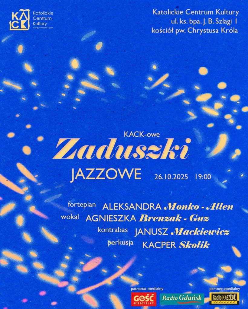 Stowarzyszenie Katolickie Centrum Kultury w Gdyni Małym Kacku zaprasza na KACK-owe Zaduszki Jazzowe. Wydarzenie odbędzie się w niedzielę, 26 października, o godzinie 19:00, w kościele pw. Chrystusa Króla w Gdyni Małym Kacku. KACK-owe Zaduszki Jazzowe to wyjątkowy koncert łączący jazz, soul i gospel. W programie autorskie utwory Aleksandry Mońko-Allen, napisane w USA podczas współpracy z My.Calvary Gospel Choir oraz znane standardy jazzowe i soulowe. Wystąpią znani trójmiejscy muzycy: Aleksandra Mońko-Allen – fortepian Agnieszka Brenzak-Guz – wokal Anthony Allen – wokal Janusz Mackiewicz – kontrabas Kacper Skolik – perkusja Tego dnia mieszkańcy dzielnicy i parafianie z parafii pw. Chrystusa Króla w Małym Kacku dodatkowo pragną uczcić pamięć Sługi Bożego ks. Stefana Radtkego – swojego byłego proboszcza i męczennika II wojny światowej. Wstęp wolny.(materiały promocyjne organizatora) Opublikowano: 21.10.2025 10:13 Autor: Paweł Jałoszewski (pawel.jaloszewski@gdynia.pl) Zmodyfikowano: 21.10.2025 10:13 Zmodyfikował: Paweł Jałoszewski