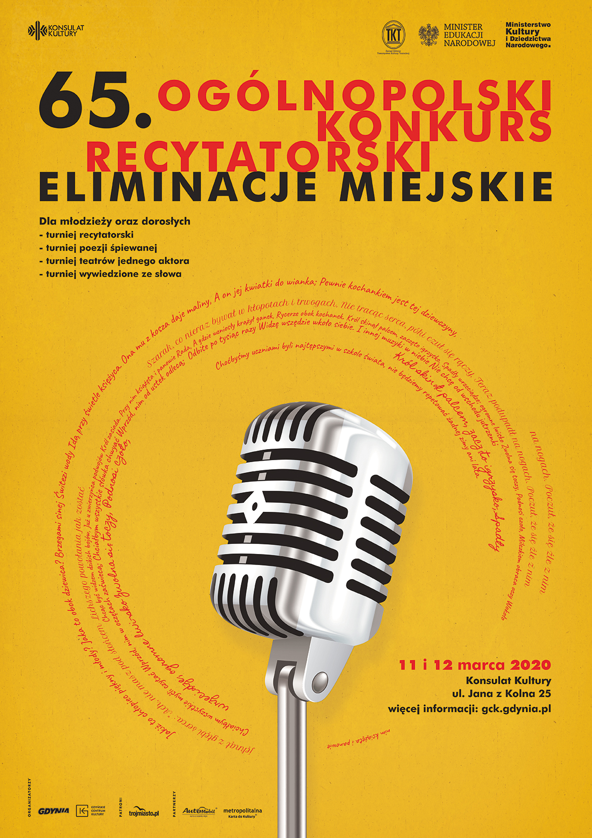 Lubisz interpretować poezję i prozę? Realizujesz się twórczo i chciałbyś zaprezentować swoje umiejętności? Weź udział w 65. Ogólnopolskim Konkursie Recytatorskim. Miejskie eliminacje odbędą się 11 i 12 marca w Konsulacie Kultury. Swoich sił można spróbować w czterech turniejach: recytacja, wywiedzione ze słowa, teatr jednego aktora oraz poezja śpiewana. Konkurs jest skierowany do amatorów. Zgłoszenia będą przyjmowane do 6 marca.W konkursie mogą wystartować uczniowie szkół ponadpodstawowych, studenci oraz dorośli. Są jednak wyjątki. To wydarzenie adresowane do amatorów. Dlatego w rywalizacji nie mogą uczestniczyć studenci kierunków artystycznych wyższych uczelni teatralnych i muzycznych oraz kierunku pedagogika muzyki lub wychowanie muzyczne na wyższych uczelniach artystycznych i nieartystycznych.Uczestnicy będą walczyć o zwycięstwo w kilku kategoriach: recytacja - dla młodzieży i dorosłych, wywiedzione ze słowa, teatr jednego aktora oraz poezja śpiewana. W zależności od wybranego rodzaju turnieju, zawodnicy muszą zaprezentować swoje umiejętności w różny sposób.Konkurs recytatorski zostanie przeprowadzony osobno dla młodzieży ze szkół ponadpodstawowych i dorosłych. Repertuar, który należy przygotować, aby wziąć udział w tej kategorii to w sumie 3 utwory (w całości lub fragmentach) – 2 poetyckie oraz 1 pisany prozą. Podczas prezentacji każdy uczestnik wybiera 2 pozycje – prozę oraz utwór poetycki. Łączny czas wykonania nie może w tym turnieju przekroczyć 10 minut.W turnieju poezji śpiewanej mogą się zaprezentować wyłącznie soliści. W tym przypadku nie ma podziału na kategorie. Repertuar obejmuje 3 utwory śpiewane oraz 1 recytowany. Wykonywane mogą być wiersze, które zostały opublikowane w książkach lub prasie literackiej. Przynajmniej jeden utwór musi być oryginalny – tzn. mieć nowo skomponowaną muzykę. Uczestnicy mogą też wykonać trzeci utwór z własnym tekstem. Do konkursowej prezentacji każdy zgłasza 2 utwory śpiewane i 1 recytowany oraz ewentualnie jako trzeci – śpiewany utwór z tekstem własnym. Łączny czas wykonania nie może przekroczyć 10 minut. Do akompaniamentu można wykorzystać 1 instrument lub mały zespół muzyczny (do 3 osób) albo półplayback.Turniej teatrów jednego aktora to konkurencja, w której uczestnicy występują bez podziału na kategorie. Każdy z nich przygotowuje spektakl w oparciu o dowolny materiał literacki. Czas prezentacji nie może przekroczyć 30 minut.Natomiast wywiedzione ze słowa to turniej dla poszukujących nowych form wypowiedzi. Tutaj również uczestnicy występują bez podziału na kategorie. Repertuar jest dowolny. Może to być wiersz, monolog czy miks różnych tekstów. Tak samo dowolna jest forma prezentacji. Uczestnicy mogą wystąpić w formie teatru jednego wiersza czy połączenia recytacji ze śpiewem, dźwiękiem lub ruchem. Łączny czas występu to maksymalnie 7 minut.Pierwszy etap rywalizacji to eliminacje miejskie. W Gdyni odbędą się one 11 i 12 marca w Konsulacie Kultury (ul. Jana z Kolna 25). Aby wziąć w nich udział należy pobrać i wypełnić kartę zgłoszeniową dla danego turnieju. Gotowy dokument trzeba przesłać do 6 marca na adres: edukacja@gck.gdynia.pl lub dostarczyć osobiście do Konsulatu Kultury.Formularze zgłoszeniowe są dostępne tutaj.Po wysłuchaniu wszystkich uczestników przeglądu zostaną wybrani zwycięzcy poszczególnych konkurencji. O tym, kto wygra, zdecyduje Sąd Konkursowy. Laureaci przejdą do kolejnych etapów rywalizacji. Przeglądy wojewódzkie odbędą się do 10 maja. Natomiast finałowe zmagania, połączone z warsztatami, zaplanowano w czerwcu.Ogólnopolski Konkurs Recytatorski prowadzi Towarzystwo Kultury Teatralnej. Opublikowano: 28.02.2020 09:31 Autor: Magdalena Czernek (magdalena.czernek@gdynia.pl) Zmodyfikowano: 28.02.2020 13:29 Zmodyfikował: Agnieszka Janowicz