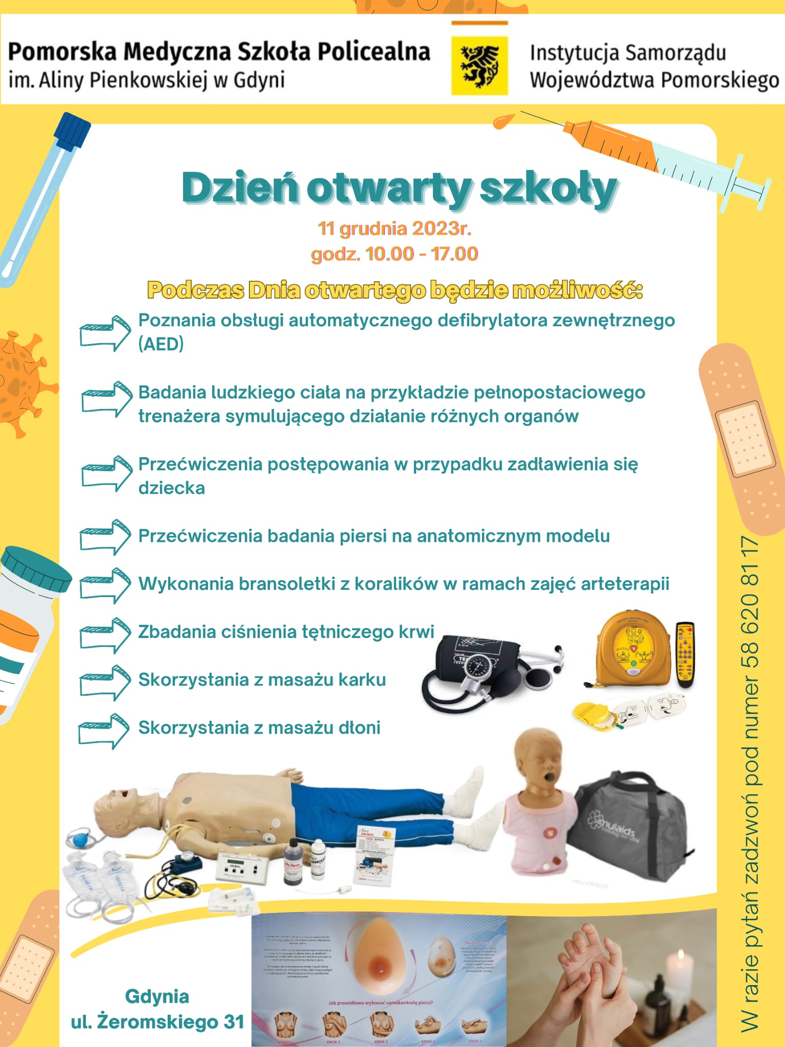 Przed nami pierwsze Dni Otwarte w gdyńskich placówkach edukacyjnych. Właśnie w grudniu rozpoczynają się one od Pomorskiej Medycznej Szkoły Policealnej im. Aliny Pieńkowskiej w Gdyni. Nauka tutaj jest bezpłatna, a placówka kształci w zawodach przyszłości. Zainteresowani mogą wybrać się na Dzień Otwarty, który zaplanowano na 11 grudnia. Rekrutacja już się rozpoczęła. Zainteresowanie zawodami medycznymi wciąż rośnie, ale nadal niewiele osób wie, że w Gdyni można je zdobyć w krótkim czasie, a do nauki nie jest konieczna matura. Pomorska Medyczna Szkoła Policealna jest jedyną w Gdyni szkołą bezpłatną, w której kształcą się przyszli opiekunowie medyczni, terapeuci zajęciowi, higienistki stomatologiczne, masażyści, a od niedawna również podolodzy. - Na medyczne zawody techniczne zapotrzebowanie na rynku pracy stale rośnie – mówi Bartosz Bartoszewicz, wiceprezydent Gdyni ds. jakości życia. – W Gdyni zdrowie mieszkańców to jeden z priorytetów samorządu. Dlatego cieszy nas fakt, że przyszli pracownicy służby zdrowia, mogą zdobywać wykształcenie na miejscu. Szybka droga do uzyskania zawodu to również doskonała opcja dla gości z doświadczeniem uchodźczym, którzy właśnie w Gdyni rozpoczynają swoją drogę zawodową od nowa. Pomorska Medyczna Szkoła Policealna jest jedną z niewielu placówek, w której można rozpocząć kształcenie również w semestrze zimowym. Daje to szansę osobom, które chcą szybko zmienić kierunek, a nie chcą tracić całego roku. Właśnie rozpoczął się nabór na kierunki podolog i opiekun medyczny. - To otwiera nowe możliwości osobom pracującym, które chcą uzupełnić wykształcenie, bądź zmienić zawód – mówi Monika Engler-Jastrzębska, dyrektor szkoły. – Wszystkich zainteresowanych zapraszamy 11 grudnia będzie można nie tylko obejrzeć szkołę, porozmawiać z nauczycielami i słuchaczami, ale także wziąć udział w wielu ciekawych aktywnościach. W programie między innymi: badanie ludzkiego ciała na przykładzie pełnopostaciowego trenażera stymulującego działanie różnych organów, badanie piersi na anatomicznym modelu, zajęcia z arteterapii, masaże karku i dłoni. W zależności od kierunku, czas kształcenia w szkole trwa rok, bądź dwa lata. Placówka posiada doskonale wyposażone pracownie, nauczycieli – praktyków i współpracuje z wieloma specjalistycznymi instytucjami, gdzie uczniowie mogą odbywać praktyki.W ostatnim czasie w szkole przybywa uczniów ukraińskich. Nawet przy słabej znajomości języka polskiego, otrzymują oni wsparcie i pomoc w trakcie nauki. Opublikowano: 28.11.2023 12:06 Autor: Aneta Marczak (aneta.marczak@gdynia.pl) Zmodyfikowano: 28.11.2023 14:36 Zmodyfikował: Agnieszka Janowicz