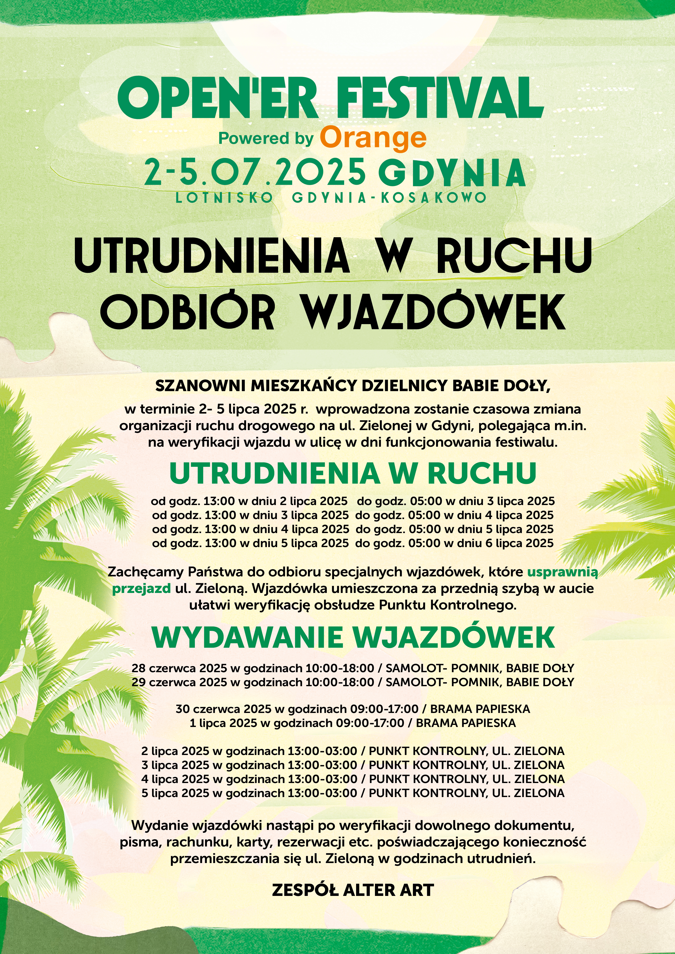 Wielkimi krokami zbliża się jeden z największych festiwali muzycznych w Europie – Open’er Festival 2025. Na scenie pojawią się m. in. Linkin Park, Gracie Abrams, Camila Cabelo, Doechii i David Kushner. Muzyczne święto potrwa od 2 lipca do 5 lipca. Jakie zasady obowiązują na terenie festiwalu? Jak bezpiecznie dojechać? Sprawdź poradnik z praktycznymi informacjami i wskazówkami. Open’er Festival 2025 – sprawdź, co musisz wiedzieć: Miasteczko festiwalowe Camping Dojazd i parkingi Autobusy Pociągi SKM Samochody osobowe Wjazdówki dla mieszkańców na ulicę Zieloną Inne środki transportu Wymiana biletów na opaski Punkty informacyjne Płatność bezgotówkowa Osoby z niepełnosprawnościami Bezpieczeństwo Depozyt Gwiazdorski line-up, różnorodne strefy aktywności i niepowtarzalna atmosfera od lat przyciągają fanów muzyki z całej Europy. Open'er Festival tradycyjnie potrwa 4 dni, a w miasteczku festiwalowym na uczestników będą czekać różnorodne aktywności: strefy mody, NGO, Dom Qultury, Kids Zone, namiot teatralny, przestrzeń gastronomiczna, miejsca relaksu i rozrywki, pole namiotowe czy parkingi. Koncerty będą odbywać się na czterech scenach – Orange Main Stage, Tent Stage, Alter Stage oraz Flow Stage. Miasteczko festiwalowe Teren jest otwarty w dniach festiwalowych, w godz. 15:30-03:30.Aby wejść na teren festiwalu, każdy uczestnik powinien mieć przy sobie ważny dokument tożsamości ze zdjęciem (dowód osobisty, legitymację szkolną/studencką, prawo jazdy, paszport – mTożsamość w aplikacji mObywatel będzie również akceptowana).Wejście na teren festiwalu od ul. Zielonej w Gdyni. (Fot. materiały prasowe Alter Art)Drugie wejście do miasteczka festiwalowego od strony Kosakowa.(Fot. materiały prasowe Alter Art) Camping Open'er oferuje festiwalowiczom przestrzenie noclegowe. Można skorzystać m.in. z pola namiotowego i glampingu.(Fot. materiały prasowe Alter Art)Pole namiotowe:Wstęp tylko dla osób z biletem na pole namiotowe. Bilety można wymienić na opaski wyłącznie w punkcie wymiany przy polu namiotowym czynnym 24h/dobę, od 1 lipca, godz. 12:00 do 5 lipca, godz. 15:00.Okres obowiązywania biletu: karnet 4-dniowy z polem: od 1 lipca, od godz. 12:00 do 6 lipca, godz. 14:00, karnet 2-dniowy z polem: od 4 lipca, od godz. 10:00 do 6 lipca, godz. 14:00, bilet 1-dniowy z dopłatą do pola: w dniu obowiązywania biletu, od godz. 10:00 do dnia następnego, do godz. 14:00. Na terenie pola znajdują się m.in.: sklepik spożywczy, toalety, śniadaniownia, punkty gastronomiczne, płatne i bezpłatne prysznice, punkt medyczny, parking dla rowerów, depozyt, miejsce do grillowania, oficjalny sklep festiwalowy. Dojazd i parkingi Tysiące openerowiczów będzie codziennie przyjeżdzać do miasteczka festiwalowego, co może spowodować zwiększony ruch. Dlatego wszystkich uczestników zachęcamy do korzystania z alternatywnych środków transportu. Na trasie dworzec Gdynia Główna – okolice wejścia na festiwal od strony ul. Zielonej, będzie kursować bezpłatny autobus linii OPEN’ER FESTIVAL.Mapa dojazdowa na teren festiwalu (fot. Alter Art) Autobusy Dobry rozwiązaniem jest skorzystanie z bezpłatnej linii autobusowej dowożącej festiwalowiczów na teren Open’era. Autobusy linii OPEN’ER FESTIVAL kursują wahadłowo co kilka/kilkanaście minut (w zależności od potrzeb): z okolic dworca Gdynia Główna (ul. Janka Wiśniewskiego) w okolice wejścia na festiwal (Gdynia, ul. Zielona). Aby skorzystać z połączenia nie trzeba mieć opaski, wystarczy bilet na festiwal. Bezpłatne przejazdy dotyczą wyłącznie autobusów linii Open’erowej, nie obejmują zwykłych połączeń ZKM.Godziny funkcjonowania bezpłatnej linii: 1 lipca, w godz. 11:00-23:00, 2-5 lipca, w godz. 8:00-6:00 dnia następnego, 6 lipca, w godz. 06:00-14:00. Pociągi SKM Podczas Open'era pojawią się dodatkowe nocne kursy pociągów SKM. Wracając z koncertów festiwalowych od godz. 23:00 do 5:00 będzie można skorzystać z 27 dodatkowych składów SKM (7 w relacji Gdańsk Główny – Wejherowo – Gdańsk Główny oraz 20 w relacji Gdańsk Główny – Gdynia Cisowa – Gdańsk Główny). Przewoźnik zachęca do zakupu biletów za pomocą aplikacji. Ponadto będzie również możliwość zakupu biletów w kasach i automatach. Połączenia zostaną uruchomione, dzięki wsparciu marszałka województwa pomorskiego Mieczysława Struka i dofinansowaniu ze środków samorządu województwa pomorskiego.(Fot. materiały prasowe SKM) Samochody osobowe Pogoda w trakcie Open’era może być zmienna, w przypadku obfitych opadów deszczu mogą wystąpić utrudnienia w parkowaniu na terenie miasteczka. Zalecane jest pozostawienie pojazdu w centrum miasta i skorzystanie z autobusu festiwalowego.Parking festiwalowy (niestrzeżony) znajduje się od strony wejścia Kosakowo. Najbliżej wejścia i punktu wymiany biletów na opaski znajdują się miejsca parkingowe przeznaczone dla osób z niepełnosprawnościami.Czynny: 2 lipca, od godz. 13:30 do godz. 6:00 dnia następnego, 3-4 lipca, od godz. 14:30 do godz. 6:00 dnia następnego, 5 lipca, od godz. 13:30 do godz. 12:00 dnia następnego. Wjazd na parking możliwy do godz. 3:00 każdego dnia.Ceny biletów: 25 zł za każdy wjazd – motory i skutery. 55 zł za każdy wjazd – samochody osobowe (do 5 miejsc siedzących). 70 zł za każdy wjazd – samochody osobowe (powyżej 5 miejsc siedzących). Samochody nieodebrane przed końcem doby parkingowej traktowane są tak, jakby ponownie wjechały na teren parkingu. Wjazdówki dla mieszkańców na ulicę Zieloną Wjazdówki dla mieszkańców będą wydawane zgodnie z poniższym harmonogramem: 28 czerwca, w godz. 10:00-18:00 przy pomniku samolot (Babie Doły), 29 czerwca, w godz. 10:00-18:00 przy pomniku samolot (Babie Doły), 30 czerwca, w godz. 09:00-17:00 przy bramie Papieskiej, 1 lipca, w godz. 09:00-17:00 przy bramie Papieskiej, 2 lipca, w godz. 13:00-03:00 w punkcie kontro