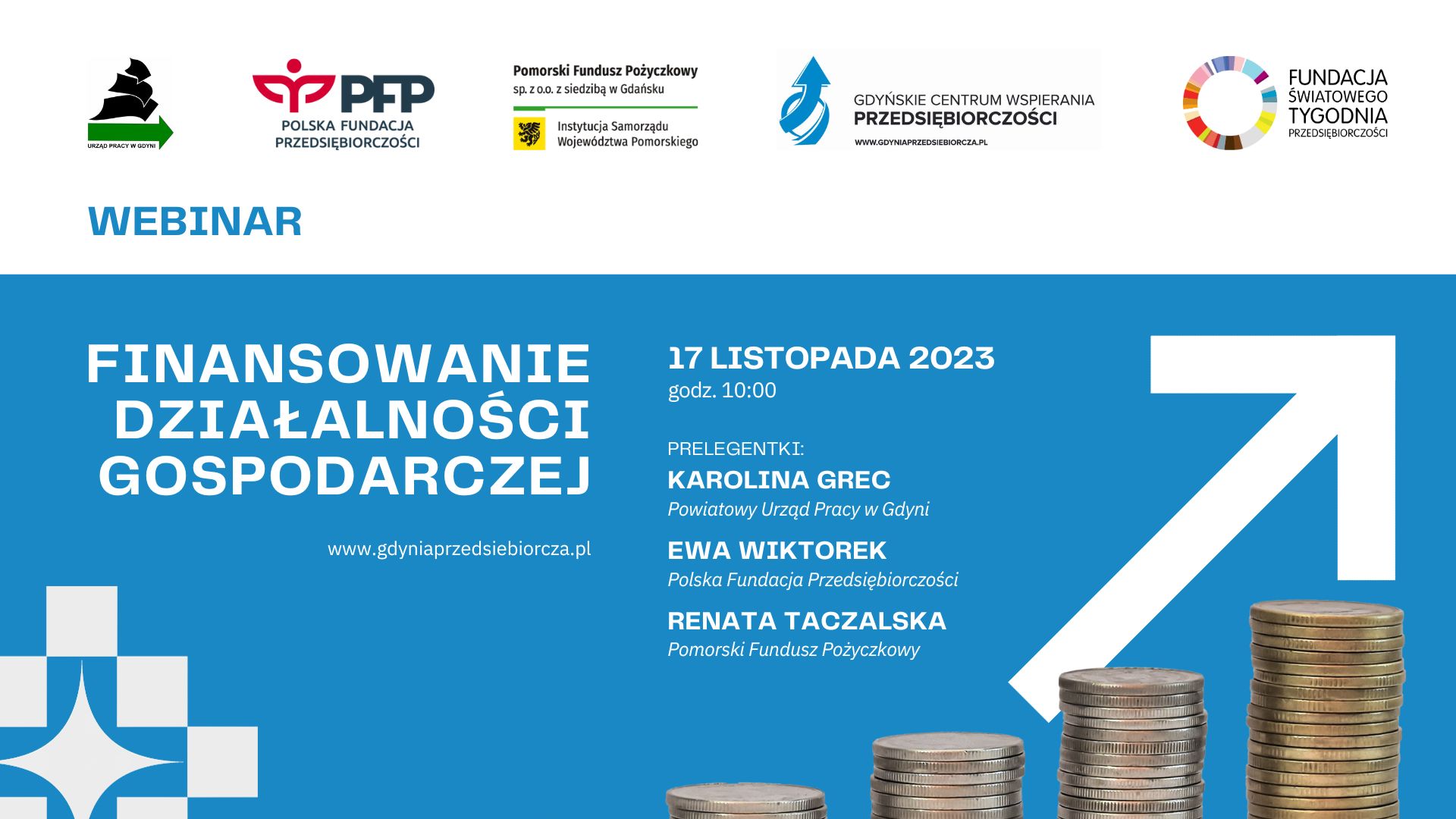 Zapraszamy na kolejne szkolenie, organizowane w ramach Światowego Tygodnia Przedsiębiorczości „Finansowanie działalności gospodarczej”. Wspólnie z ekspertkami z Powiatowego Urzędu Pracy, Polskiej Fundacji Przedsiębiorczości i Pomorskiego Funduszu Pożyczkowego odkryjemy dostępne formy wsparcia i źródła finansowania dla przedsiębiorców. Zapisy: https://finansowanie-tp2023-g-i.konfeo.com. Program szkolenia: 10:00 – Formy wsparcia dostępne w Powiatowym Urzędzie Pracy: dotacje dla osób bezrobotnych, wsparcie pracodawców w tworzeniu miejsc pracy i zatrudnianiu pracowników (prace interwencyjne, staże, doposażenie stanowiska pracy), wsparcie pracodawców w zakresie szkoleń dla pracowników (wsparcie w ramach Krajowego Funduszu Szkoleniowego). 10:35 – Oferta Polskiej Fundacji Przedsiębiorczości: zasady udzielania pożyczek, Wsparcie w Starcie, oferta wsparcia szkoleniowego dla przedsiębiorców i ich pracowników 11:00 – Pomorski Fundusz Pożyczkowy: wsparcie pomorskich przedsiębiorstw w formie pożyczek finansowanych ze środków unijnych oraz środków Województwa Pomorskiego, pożyczki udzielone w perspektywie budżetowej UE 2014-2020, aktualnie dostępne produkty oraz wsparcie planowane w ramach FEP 2021-2027. Prelegentki: Karolina Grec, Powiatowy Urząd Pracy w Gdyni Kierownik Działu Form Wsparcia w PUP Gdynia, zajmującego się udzielaniem wsparcia zarówno dla osób bezrobotnych w postaci jednorazowych środków na podjęcie działalności gospodarczej jak i pracodawców w zakresie organizacji zatrudnienia subsydiowanego, doposażenia stanowisk pracy oraz organizacji staży. Ewa Wiktorek, Polska Fundacja Przedsiębiorczości Menedżer ds. Finansowania Przedsiębiorstw w Polskiej Fundacji Przedsiębiorczości. Doradca w sprawach pozyskiwania środków na podjęcie i rozwój działalności gospodarczej oraz możliwości dokształcania dla przedsiębiorców i ich pracowników w ramach bezpłatnych szkoleń o tematyce branżowej i ogólnorozwojowej na wielu płaszczyznach. Renata Taczalska, Pomorski Fundusz Pożyczkowy Od 2016 r. Kierownik Projektów w Pomorskim Funduszu Pożyczkowym dla 12 instrumentów zwrotnych skierowanych dla pomorskich MŚP oraz inwestorów w obszarze OZE. Szkolenie odbędzie się online na platformie ZOOM. Link do szkolenia zostanie wysłany dzień przed wydarzeniem. Opublikowano: 10.11.2023 10:54 Autor: Paweł Jałoszewski (pawel.jaloszewski@gdynia.pl) Zmodyfikowano: 10.11.2023 11:44 Zmodyfikował: Paweł Jałoszewski