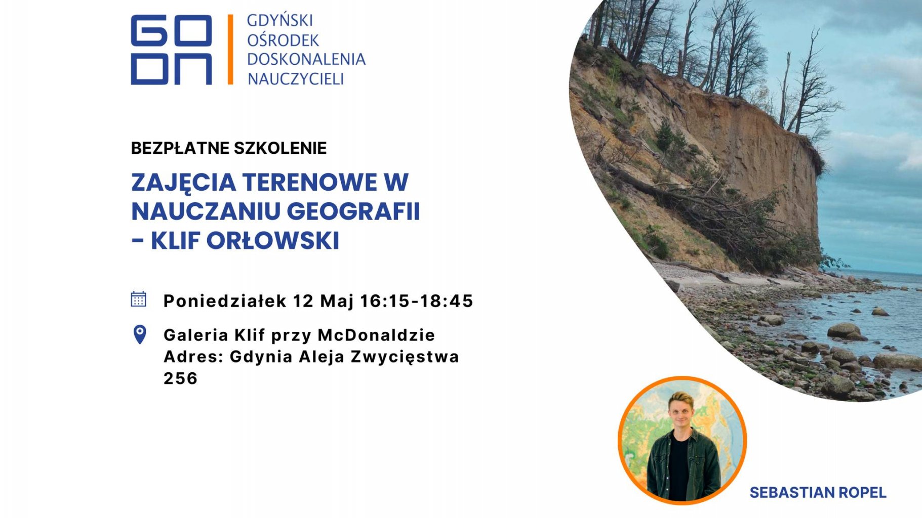 Gdyński Ośrodek Doskonalenia Nauczycieli zaprasza na bezpłatne szkolenie dla nauczycieli geografii! Wzmocnij swoje lekcje geografii i poznaj Klif Orłowski. Czego się nauczysz? Poznasz zalety i tajniki efektywnego nauczania geografii w terenie. Odkryjesz Klif Orłowski – jeden z najpiękniejszych klifów polskiego wybrzeża. Wymiana wiedzy i inspiracji z innymi nauczycielami. ️ Dla kogo? Szkolenie skierowane jest do nauczycieli geografii szkół podstawowych i ponadpodstawowych. Dlaczego warto? To niepowtarzalna okazja do połączenia teorii z praktyką. Poznasz nowe metody i narzędzia dydaktyczne. Zainspirujesz się do tworzenia ciekawych lekcji geografii. ️ Spędzisz czas w pięknym otoczeniu Klifu Orłowskiego. Zgłoś się już dziś na stronie: godn.eu.Liczba miejsc ograniczona. Kontakt Gdyński Ośrodek Doskonalenia Nauczycieli sekretariat@godn.eu 58 765 07 92 Opublikowano: 25.04.2025 09:01 Autor: Paweł Jałoszewski (pawel.jaloszewski@gdynia.pl) Zmodyfikowano: 25.04.2025 09:05 Zmodyfikował: Paweł Jałoszewski