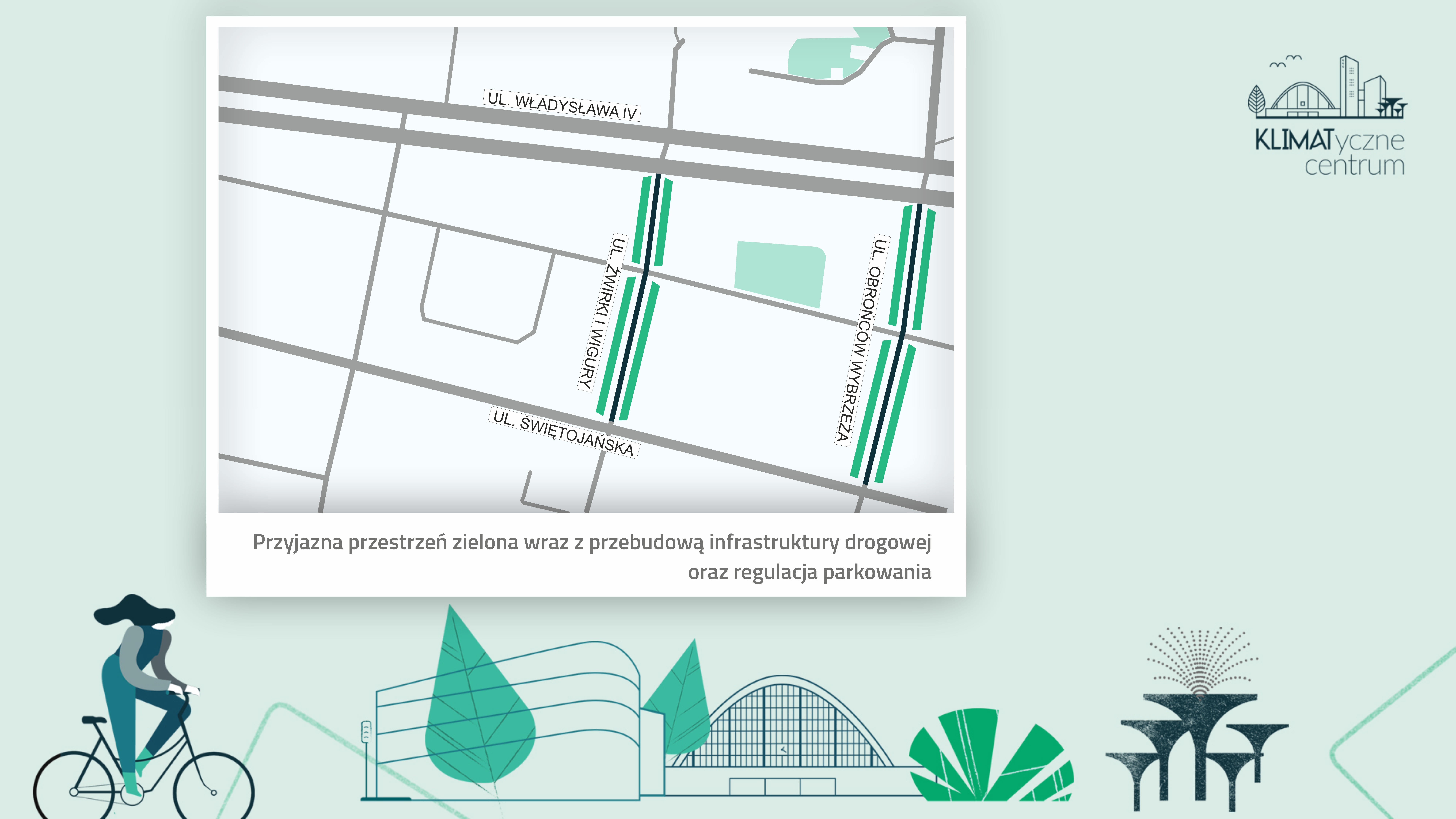 Ulice Żwirki i Wigury oraz Obrońców Wybrzeża, pomiędzy ulicami Świętojańską i Władysława IV, zmienią swój charakter. Zostaną całkowicie przebudowane zgodnie z założeniami projektu KLIMATyczne Centrum. Oznacza to nowe nasadzenia drzew, krzewów i kwiatów. Przestrzeń przyjazną pieszym dzięki nowym chodnikom, a także uporządkowanie parkowania z jednoczesnym uspokojeniem ruchu. Obecnie śródmieście Gdyni poddawane jest znaczącym zmianom. Niedawno rozpoczęte prace przy przebudowie ul. Starowiejskiej i Abrahama, budowa trzeciego i tym samym ostatniego etapu Parku Centralnego czy przygotowywane wzbogacenie małej architektury na uwielbianym Bulwarze Nadmorskim zmienią charakter bardzo popularnych miejsc w naszym mieście. To działania, których ostateczny efekt będzie efektem synergii szeregu działań inwestycyjnych i zmieniających nawyki i postrzeganie przestrzeni w ścisłym centrum miasta. Do takich zaliczają się przygotowywane zmiany ulic Żwirki i Wigury, a także Obrońców Wybrzeża. – Transformacja przestrzeni, szczególnie centrów miast, jest działaniem ciągłym. Zmieniająca się rzeczywistość i potrzeby potrafią redefiniować pierwotne założenia. Dzisiaj z pełnym przekonaniem wspieramy procesy, które są odpowiedzią na wyzwania klimatyczne. Infrastruktura i zmiany z nią związane to jeden z elementów, który buduje nasze zachowania – mówi Wojciech Szczurek, prezydent Gdyni. Zmiany w ostatnim roku to m.in. wdrożenie bez emisyjnego taboru elektrobusów, zachęta w postaci dotacji na zakup rowerów elektrycznych czy realizacja nowych buspasów. Wśród zmian infrastrukturalnych wewnątrz dzielnic kluczowe znaczenie będzie miała zieleń. – Projekt Klimatyczne Centrum jest działaniem wielowymiarowym, którego celem jest zmiana naszych codziennych nawyków, ale jest również odpowiedzią na wyzwania związane ze wzmacnianiem procesów ekologicznych. Tylko w przestrzeni dwóch fragmentów ulic planujemy nasadzenie niemal 60 nowych drzew, a także 700 krzewów i 1000 bylin. Wybór procedury „zaprojektuj i wybuduj” jest wynikiem wyzwań rynkowych, a także precyzyjnie przygotowanych wytycznych realizacyjnych – mówi Marek Łucyk, wiceprezydent Gdyni ds. rozwoju. Zmiany, które czekają dwie ulice, poza nowymi nasadzeniami zieleni to m.in.: przebudowa pasów jezdni do dwóch (jednym w każdym kierunku) o szerokości 2,75 m, stworzenie chodników o szerokości od 2,6 m do 4 m, odkrycie w ciągu historycznym ul. Abrahama kamiennej kostki, natomiast przejścia dla pieszych przez będą wykonane z kostki kamiennej ciętej, płomieniowanej - przyjaznej zarówno pieszym jak i osobom z niepełnosprawnością, zgodnie ze Standardami Dostępności. Przejścia dla pieszych wzdłuż ul. Świętojańskiej zostaną wyniesione do poziomu chodnika i zbudowane z nawierzchni chodnikowej dla podkreślenia pierwszeństwa pieszych. W wyznaczonych miejscach wykonane zostaną zatoki do parkowania równoległego. Zatoki wyznaczono z aktualnej jezdni, chodniki będą wolne od wystających fragmentów zaparkowanych pojazdów i wysiadanie będzie wygodniejsze.Ruch rowerowy na obu ulicach będzie odbywał się w ruchu ogólnym - po jezdni. Zaprojektowano wygodne i bezpieczne zjazdy z istniejących ciągów rowerowych wzdłuż ul. Władysława IV. Przestrzeń zostanie wzbogacona o szereg ławek i przestrzeni do odpoczynku. Za realizację odpowiada Wydział Inwestycji Urzędu Miasta, a oferta została umieszczona na Platformie Zamówień Publicznych UM. Projekt powstawał przy ścisłej współpracy z Wydziałem Ogrodnika Miasta. Zakończenie prac planowane jest na 2023 rok. Opublikowano: 15.07.2022 15:05 Autor: Dawid Kowalski (d.kowalski@gdynia.pl) Zmodyfikowano: 15.07.2022 15:28 Zmodyfikował: Agnieszka Janowicz