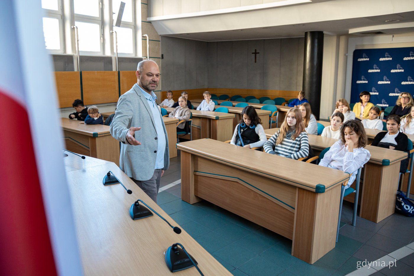 Tradycyjnie już, wyzyta rozpoczęła się od odwiedzin w sali obrad Rady Miasta, gdzie młodzi goście mieli okazję porozmawiać z Ireneuszem Trojanowiczem, wiceprzewodniczącym Rady Miasta. Uczniowie byli ciekawi nie tylko tajników zarządzania Gdynią, ale również tego, czy radny lubi swoją pracę, czy często jest rozpoznawany w mieście i w jakim wieku można radnym zostać.