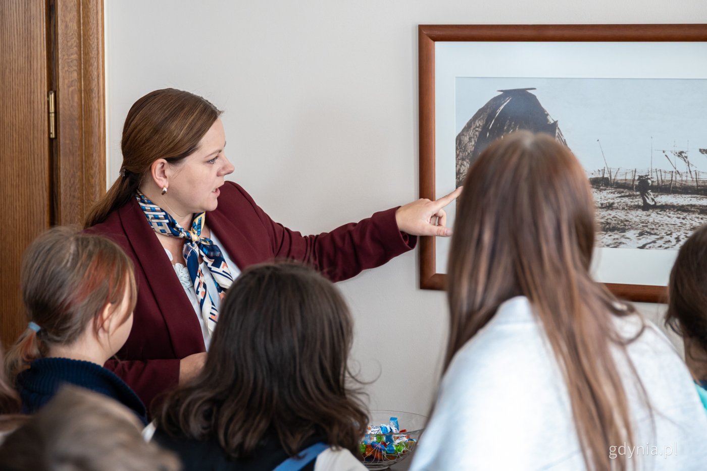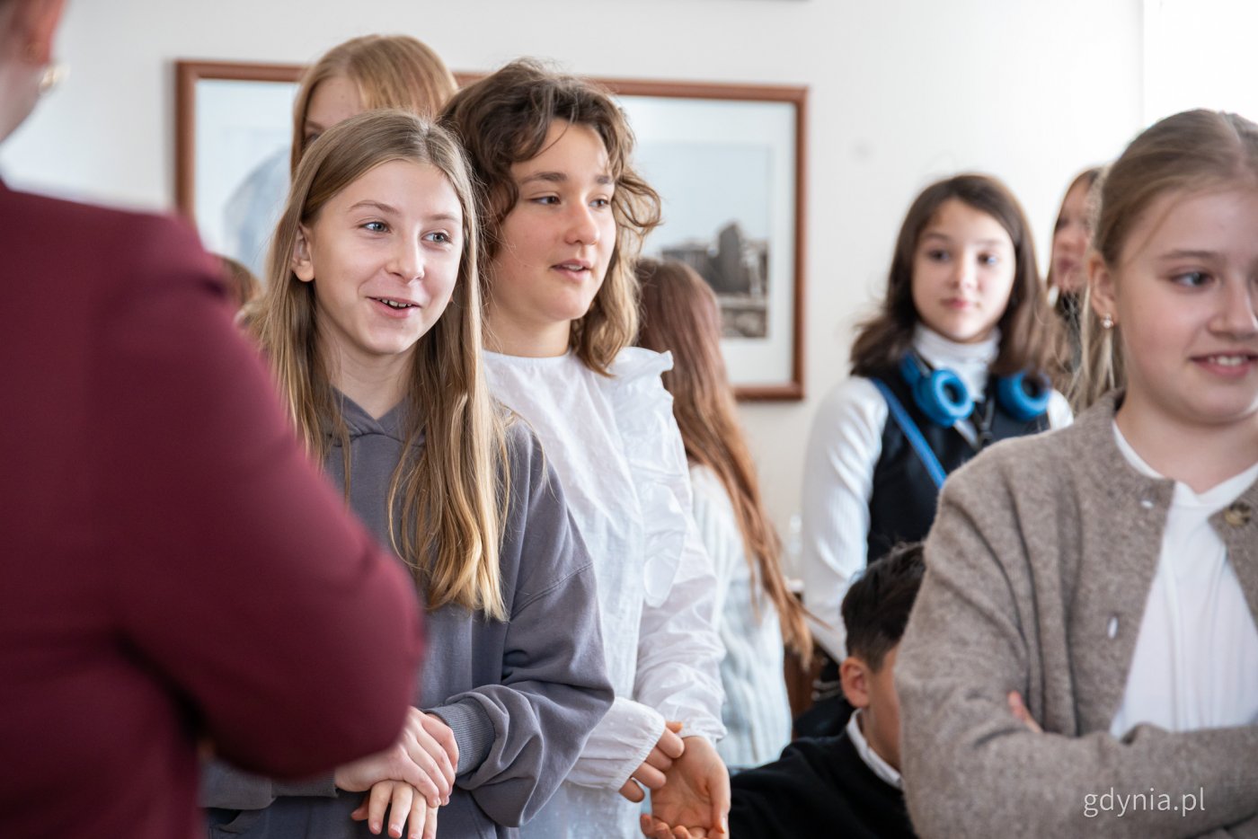 Uczniowie klasy 5a i ich wychowawczynie z Aleksandrą Kosiorek, prezydent Gdyni i Ireneuszem Trojanowiczem, wiceprzewodniczącym Rady Miasta (fot. Kamil Zoch).