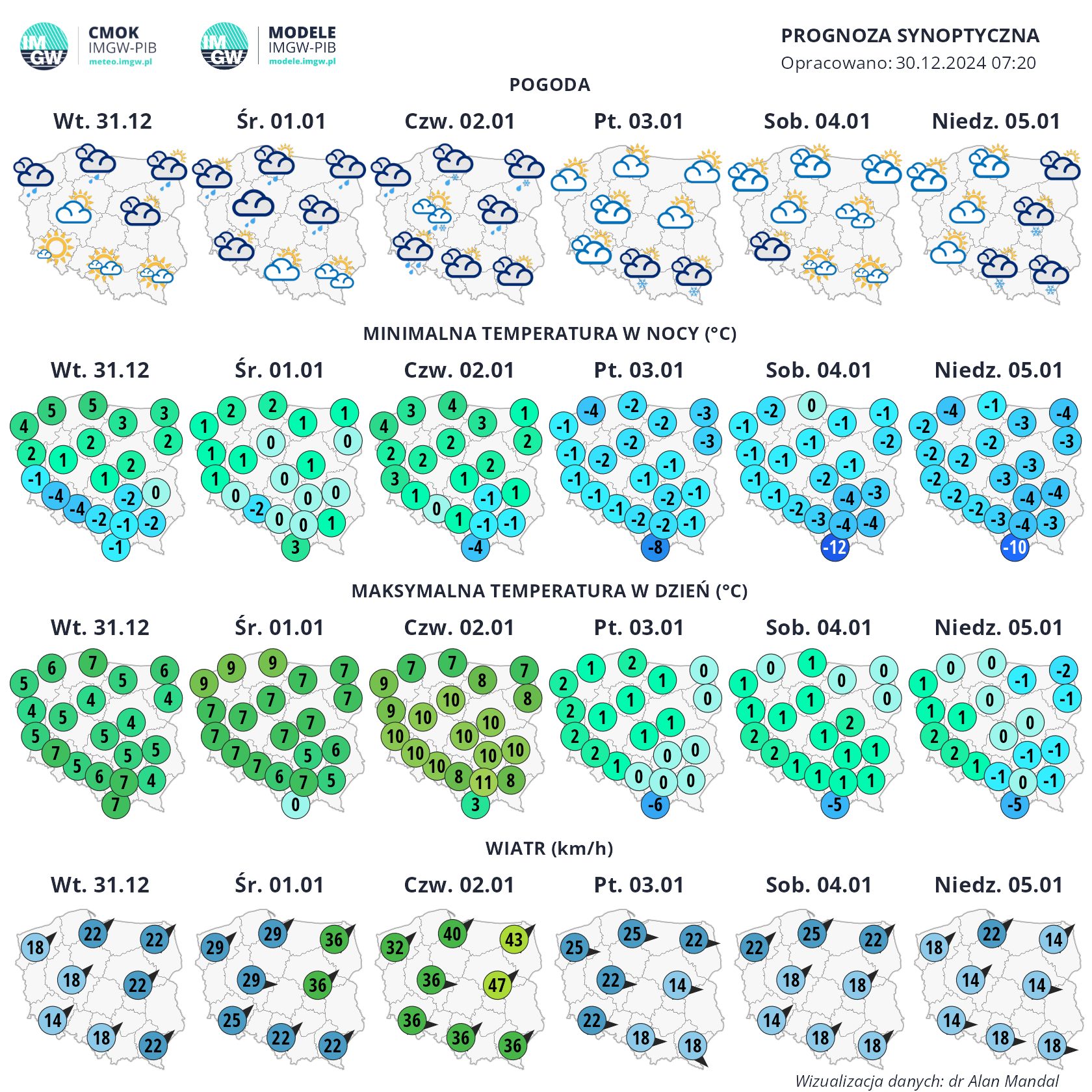 Koniec roku w Gdyni upłynie pod znakiem dynamicznych zmian pogodowych. O ile temperatury będą stosunkowo wysokie jak na tę porę roku, to intensywne wiatry i opady mogą popsuć sylwestrowe plany. Co nas czeka w najbliższych dniach? Ciepły początek z deszczemNa początku tygodnia do Trójmiasta napływać będzie ciepłe powietrze z zachodu. Temperatury wyniosą od 5 do 6 stopni Celsjusza – to wartości znacznie przekraczające normę dla przełomu grudnia i stycznia. Niestety, przyjemne ciepło będzie łączyć się z dużym zachmurzeniem oraz opadami deszczu. Zarówno w Sylwestra, jak i w Nowy Rok, nie zabraknie mżawki i słabego deszczu, zwłaszcza w godzinach wieczornych.Wietrznie i niebezpiecznieNajwiększym wyzwaniem najbliższych dni będzie jednak silny wiatr, który może utrudnić wiele codziennych aktywności. Prędkość wiatru osiągnie od 30 do 50 km/h, a w porywach przekroczy nawet 90 km/h. Szczególnie w nocy z 31 grudnia na 1 stycznia oraz w pierwszych dniach stycznia prognozuje się ekstremalne podmuchy, które mogą powodować uszkodzenia infrastruktury, przerwy w dostawach prądu oraz lokalne utrudnienia komunikacyjne.Chłód i pierwsze oznaki zimyPo stosunkowo ciepłym początku nowego roku do Trójmiasta zacznie napływać chłodne powietrze z północy. Już w piątek i sobotę termometry pokażą wartości ujemne, zwłaszcza nocą, kiedy temperatura spadnie do -3, a lokalnie nawet -5 stopni Celsjusza. Pojawią się też opady deszczu ze śniegiem oraz samego śniegu, zwiastując zimowy weekend.Ostrzeżenia meteorologiczneZe względu na silne wiatry i nieprzychylną aurę, Instytut Meteorologii i Gospodarki Wodnej wydał ostrzeżenia pierwszego i drugiego stopnia dla województwa pomorskiego, w tym dla Trójmiasta. Zaleca się zachowanie szczególnej ostrożności podczas wychodzenia na zewnątrz oraz zabezpieczenie lekkich konstrukcji i dekoracji sylwestrowych.Prognozy na dalszy okres są niepewne. Modele meteorologiczne sugerują, że ochłodzenie może potrwać do środy 8 stycznia, po czym istnieje szansa na ponowne ocieplenie. Bez względu na scenariusz, pierwsze dni stycznia będą należały do tych bardziej wymagających pod względem pogody. Opublikowano: 31.12.2024 10:10 Autor: Michał Sałata (michal.salata@gdynia.pl) Zmodyfikowano: 31.12.2024 12:19 Zmodyfikował: Małgorzata Omachel - Kwidzińska
