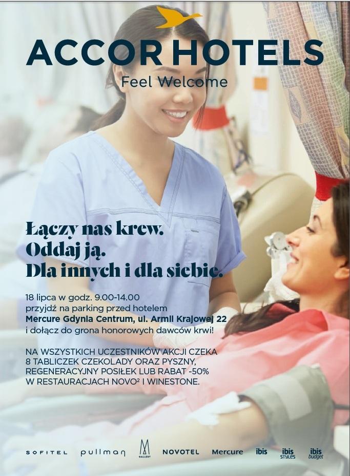 Grupa hotelowa Orbis organizuje akcję krwiodawstwa. Już 18 lipca, przed hotelem Mercure Gdynia Centrum, stanie specjalny autobus do poboru krwi. Każdy, kto weźmie udział w akcji otrzyma 8 tabliczek czekolady oraz posiłek regeneracyjny lub rabat do hotelowej restauracji.Krew będzie zbierana na rzecz pomorskich szpitali. Żeby wziąć udział w akcji należy przyjść 18 lipca na parking przed hotelem Mercure Gdynia Centrum (ul. Armii Krajowej 22). Tam od godz. 9.00 do godz.14.00 będzie stał autobus, w którym można oddać krew. – Mamy nadzieję, że zarówno nasi pracownicy, goście hotelowi, ale i mieszkańcy odpowiedzą na nasz apel. Nigdy nie wiemy, kiedy krew będzie potrzebna nam czy naszym bliskim. Warto ją oddać dla siebie i dla innych – mówi Marta Gostkowska, public relations manager hotelu Mercure Gdynia.Każdy krwiodawca otrzyma 8 tabliczek czekolady. Jednak to nie wszystko. Osoba, która odda krew, dostanie też kupon na posiłek regeneracyjny – pieczoną pierś z kurczaka podaną na pęczotto ze szpinakiem, orzechami oraz suszonymi pomidorami z sałatką ze świeżych warzyw i sernik z coulis malinowym lub będzie mogła skorzystać z 50% zniżki w hotelowej restauracji Winestone. Kupon jest ważny tylko 18 lipca.Krew mogą oddawać zdrowe osoby pełnoletnie. Wystarczy mieć przy sobie dokument potwierdzający tożsamość (np.: dowód osobisty, paszport, prawo jazdy). Na dzień przed planowanym oddaniem krwi nie można pić alkoholu, należy też ograniczyć palenie wyrobów tytoniowych. Natomiast przed samym zabiegiem trzeba zjeść lekkie śniadanie i nawodnić organizm pijąc wodę, herbatę czy soki. Oddawanie krwi jest całkowicie bezpieczne dla zdrowia. Wykorzystywany jest w nim sprzęt jednorazowego użytku. Krew pełną można oddawać w odstępach minimum co osiem tygodni. Kobiety maksymalnie cztery razy w roku, a mężczyźni maksymalnie sześć razy w roku.To już kolejna akcja krwiodawstwa organizowana przez trójmiejskie hotele Grupy hotelowej Orbis. Poprzednie odbyły się w zeszłym roku w Gdańsku i w Gdyni, a także w tym roku w Gdańsku. Opublikowano: 16.07.2018 11:30 Autor: Magdalena Czernek (magdalena.czernek@gdynia.pl) Zmodyfikowano: 16.07.2018 11:56 Zmodyfikował: Agnieszka Janowicz