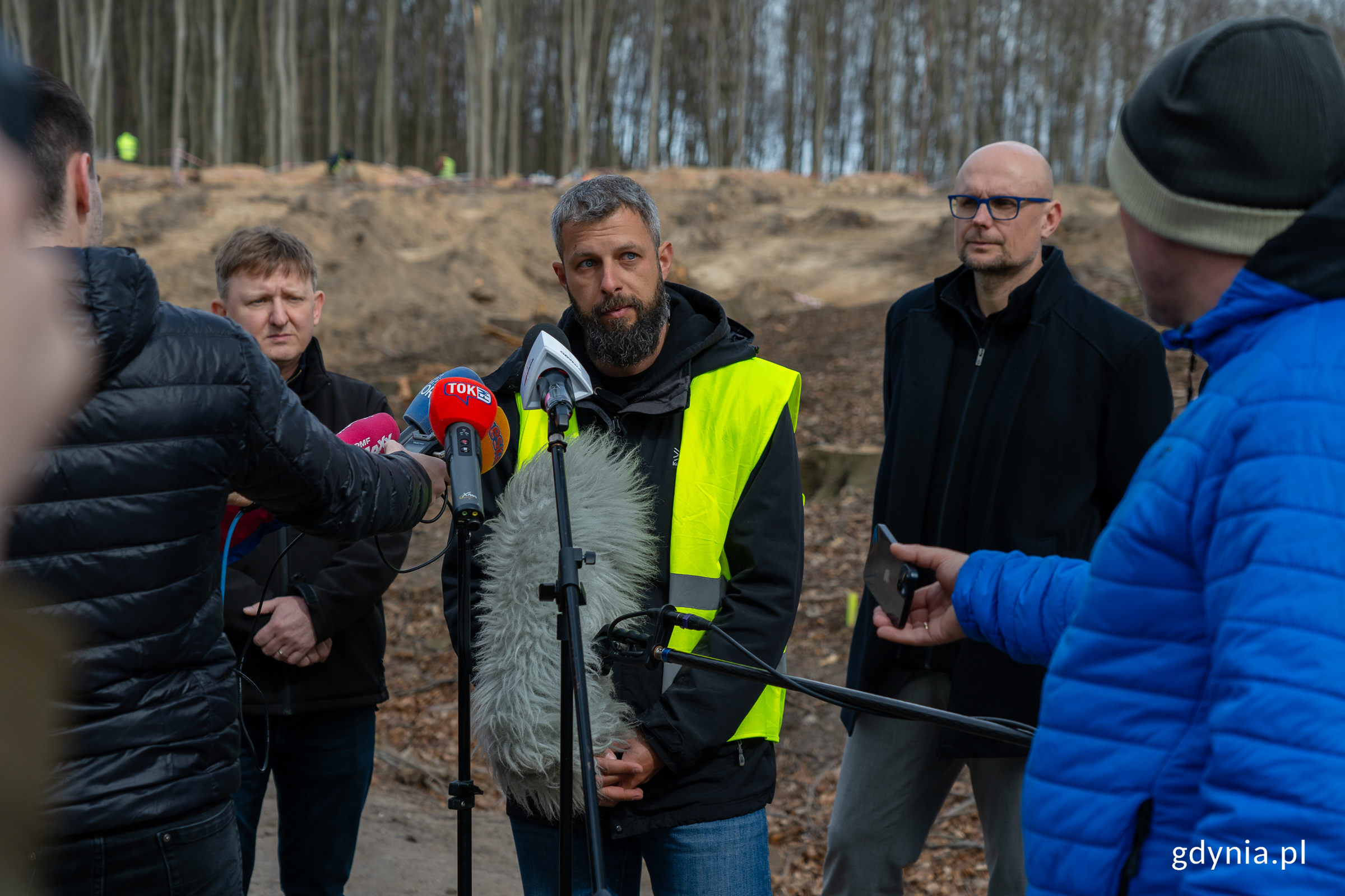 Prace przy obwodnicy Witomina nabierają tempa, chociaż wykonawca mierzy się z wyzwaniami wynikającymi z konieczności ochrony dziedzictwa historycznego i środowiska naturalnego. We wtorek na placu budowy obwodnicy Witomina odbyła się konferencja prasowa, na której przedstawiciele wykonawcy i władz miasta odnieśli się do bieżących postępów prac oraz trudności, jakie pojawiły się w trakcie realizacji inwestycji. Jak poinformował Adam Kisielewski, dyrektor kontraktu z firmy Polimex, na jednym z odcinków trasy odkryto pozostałości z czasów II wojny światowej, co skutkowało decyzją Pomorskiego Wojewódzkiego Konserwatora Zabytków o natychmiastowym wstrzymaniu prac. Na razie mamy tylko decyzję wstrzymującą roboty. Należy opracować program badań, przedłożyć go do konserwatora zabytków w celu jego zatwierdzenia, a następnie przeprowadzić same badania – wyjaśnił Adam Kisielewski. Wstrzymane zostały roboty na długości około 700–800 metrów jednak, jak podkreślił Kisielewski, prace przy obiektach mostowych mogą być kontynuowane, ponieważ omijają strefy objęte ochroną konserwatorską. Zdjęcia i montaż: Michał SałataTo nie pierwsze znaleziska archeologiczne na tym terenie. Wcześniej na obszarze budowy zidentyfikowano trzy kurhany. Prace archeologiczne w tych miejscach wciąż trwają, jednak nie wpływają znacząco na ogólny harmonogram budowy i są prowadzone równolegle z pozostałymi robotami. Tego rodzaju odkrycia nie są zaskoczeniem przy inwestycjach realizowanych na terenach o skomplikowanej historii. Ich odpowiednie zabezpieczenie i dokumentacja to standardowy element procesu budowlanego, szczególnie przy inwestycjach tej skali.Prace archeologiczne trwają, ale w sąsiedztwie trwają roboty budowlane (fot. Natalia Kawalerowicz) Ruszyła wycinka drzew Równolegle z działaniami archeologicznymi szczególny nacisk położono na kwestie środowiskowe. Bartłomiej Austen, wiceprezydent Gdyni, poinformował, że miasto 7 kwietnia zwróciło się do wykonawcy o wykonanie inwentaryzacji przyrodniczej i wskazanie obecności gatunków chronionych. Przy zachowaniu szczególnej ostrożności dzisiaj o godzinie 8 rano zaczęła się wycinka lasu na terenach miejskich tam, gdzie po drugiej stronie planowany jest obiekt mostowy - powiedział Bartłomiej Austen. Maciej Sękiewicz, ekspert ds. biologii środowiskowej, zapewnił, że wszystkie miejsca, w których mogą występować gatunki chronione, zostały oznaczone i zabezpieczone. Wszystkie miejsca, w których podejrzewamy, tudzież wiemy o obecności gatunków chronionych, zostały zabezpieczone i pozostaną niedotknięte. Pracownicy, którzy wykonują wycinkę wiedzą, co mają robić – podkreślił Maciej Sękiewicz. Na zdjęciu od lewej: naczelnik Wydziału Inwestycji Paweł Filar, ekspert ds. biologii środowiskowej Maciej Sękiewicz oraz wiceprezydent Gdyni Bartłomiej Austen (fot. Natalia Kawalerowicz)Zidentyfikowano około 10 takich miejsc, m.in. 2 gniazda, 4 dziuple oraz mrowiska. Wycinka jest prowadzona pod stałym nadzorem przyrodników.Grzegorz Dąbrowski, kierownik budowy, zapewnił, że na wielu jej odcinkach roboty toczą się zgodnie z planem. Prowadzone są roboty ziemne i budowane są nasypy pod przyszłą drogę. Trwają też prace przy dwóch przepustach dla zwierząt, a w najbliższym czasie planowane jest rozpoczęcie budowy kolejnego obiektu mostowego. Dąbrowski wspomniał również o przeprowadzonej dwa tygodnie temu akcji poszukiwawczej z udziałem około 40 osób wyposażonych w wykrywacze metalu. Do tej pory nie natrafiono na znaleziska, które mogłyby zainteresować archeologów.Plac budowy obwodnicy Witomina (fot. Natalia Kawalerowicz)Przypomnijmy, że obwodnica Witomina to kluczowy element większego planu usprawnienia układu komunikacyjnego Gdyni Zachód. Inwestycja domyka jeden z najważniejszych etapów zmian w tej części miasta i znacząco wpłynie na komfort codziennego przemieszczania się tysięcy mieszkanek i mieszkańców. Nowa trasa będzie liczyć 2 585 metrów długości i zostanie poprowadzona w układzie dwóch pasów ruchu w każdą stronę, z dodatkowymi buspasami. Projekt przewiduje także cztery obiekty inżynieryjne, w tym kładkę pieszo-rowerową przez teren leśny, dwa przepusty dla zwierząt oraz wiadukt nad ulicą Witomińską. Wartość całej inwestycji wynosi 78 549 311,39 zł, a za jej realizację odpowiada konsorcjum Polimex Infrastruktura sp. z o.o. oraz Polimex Mostostal S.A. Celem budowy jest nie tylko odciążenie lokalnego ruchu na Witominie, lecz także stworzenie nowego połączenia między Obwodnicą Trójmiasta a Śródmieściem Gdyni. Dzięki temu zmniejszy się również natężenie ruchu na Estakadzie Kwiatkowskiego i ulicy Morskiej. Galeria zdjęć Pobierz galerię Wiceprezydent Gdyni Bartłomiej Austen podczas konferencji prasowej (fot. Natalia Kawalerowicz) Pobierz zdjęcie Adam Kisielewski, dyrektor kontraktu z firmy Polimex, podczas konferencji prasowej (fot. Natalia Kawalerowicz) Pobierz zdjęcie Kierownik budowy Grzegorz Dąbrowski podczas konferencji prasowej (fot. Natalia Kawalerowicz) Pobierz zdjęcie Warunki pobierania Wszelkie prawa do zdjęć lub grafik prezentowanych w ramach portalu, należą do Prowadzącego portal lub do podmiotów z nim współpracujących i podlegają ochronie prawnej. Prowadzący portal zezwala na kopiowanie i przedstawianie utworów jedynie w celach niekomercyjnych oraz pod warunkiem zachowania go w oryginalnej postaci i zachowaniem kontekstu tematu, do którego zostało wykorzystaneprzez redakcję gdynia.pl. Opublikowane materiały powinny zawsze zawierać źródło, czyli adres strony www.gdynia.pl. Na publikowanie utworów w innych celach wymagana jest zgoda właściciela strony czyli Prowadzącego portal. Opublikowano: 09.04.2025 15:47 Autor: Natalia Kawalerowicz (natalia.kawalerowicz@gdynia.pl) Zmodyfikowano: 09.04.2025 19:36 Zmodyfikował: Jakub Winiewski