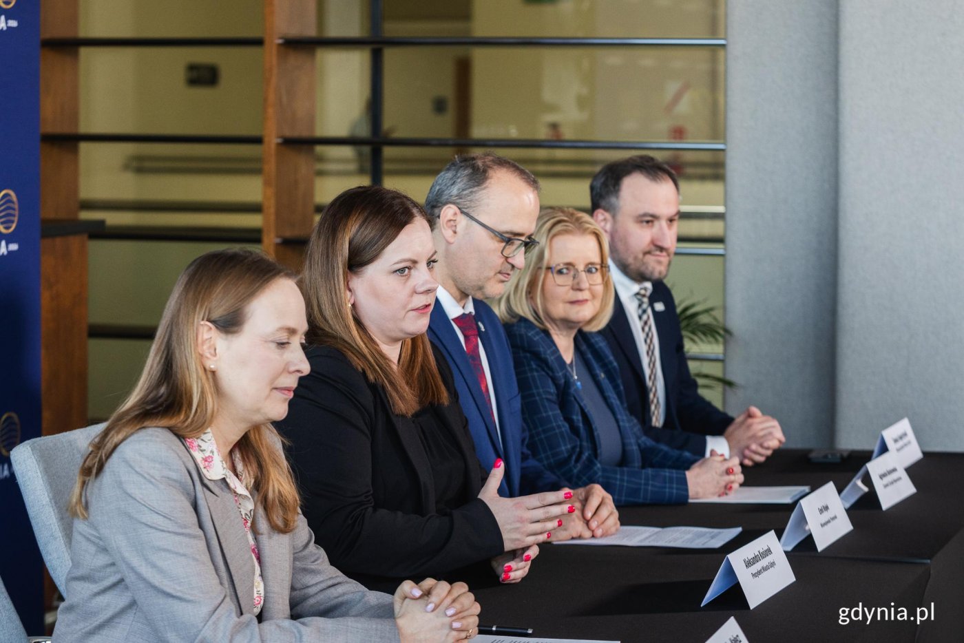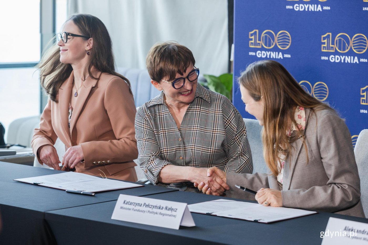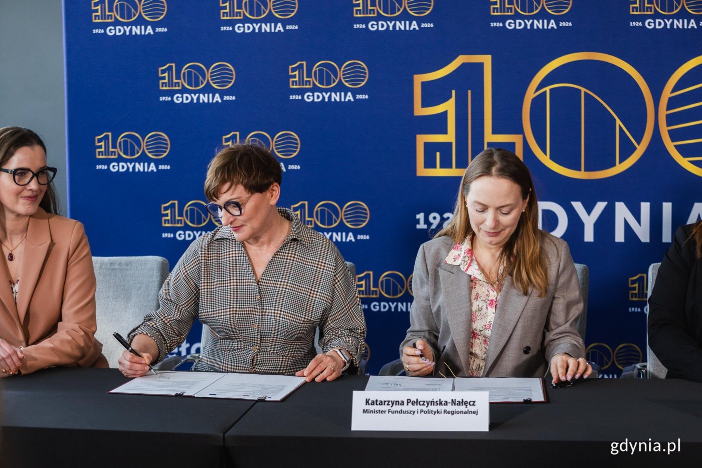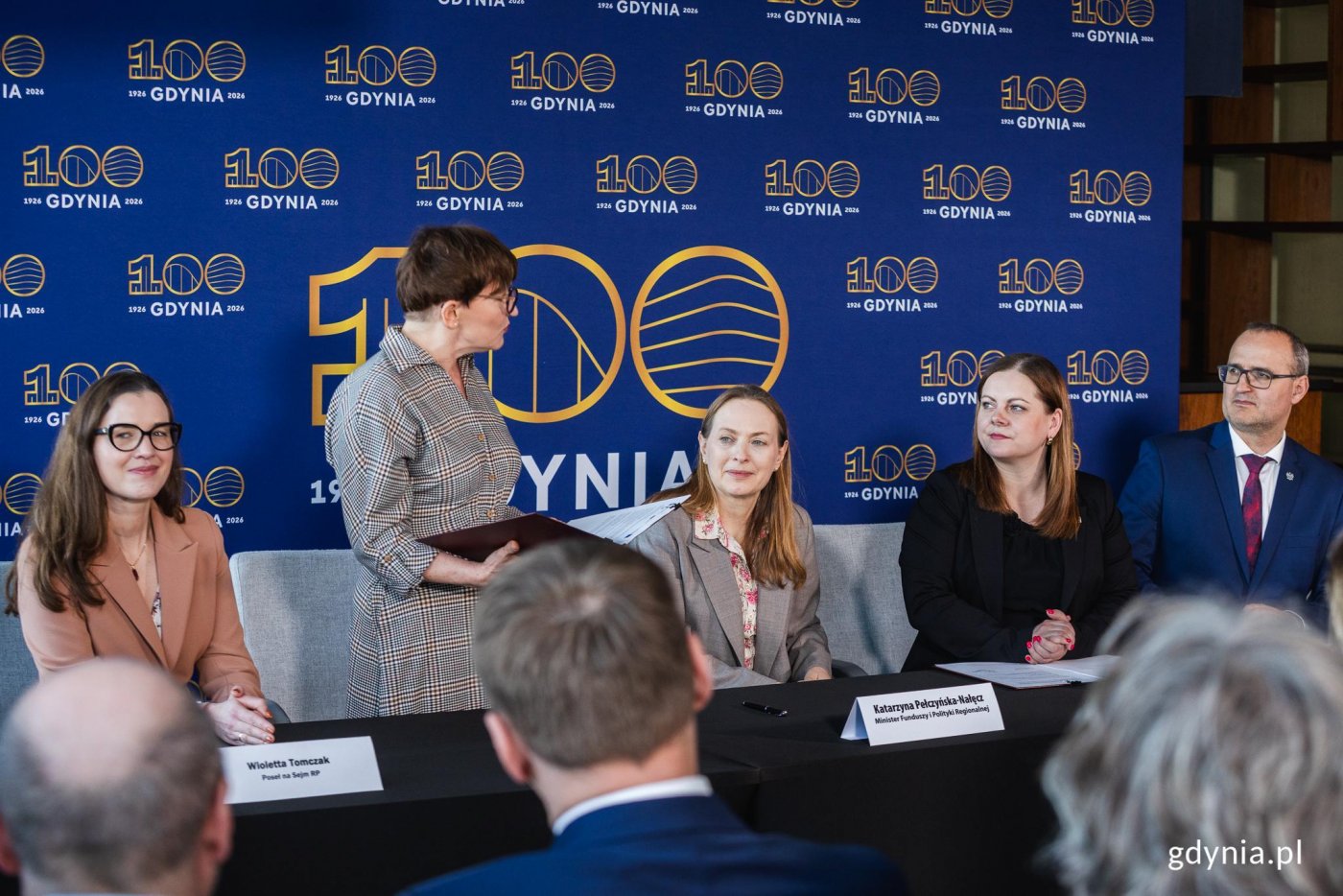 Podpisanie umowy o finansowanie projektu „SamoDZIELNI w Gdyni". Na zdjęciu od lewej: Wioleta Tomczak, posłanka, Marianna Sitek-Wróblewska, prezes Gdańskiej Fundacji Innowacji Społecznej, która w partnerstwie z Gdynią będzie realizować projekt, Katarzyna Pełczyńska-Nałęcz, minister Funduszy i Polityki Regionalnej, Aleksandra Kosiorek, prezydent Gdyni, Emil Rojek, wicewojewoda pomorski, Agnieszka Baranowska, członkini zarządu województwa pomorskiego, Tomasz Augustyniak, wiceprezydent Gdyni (fot. Karol Stańczak)