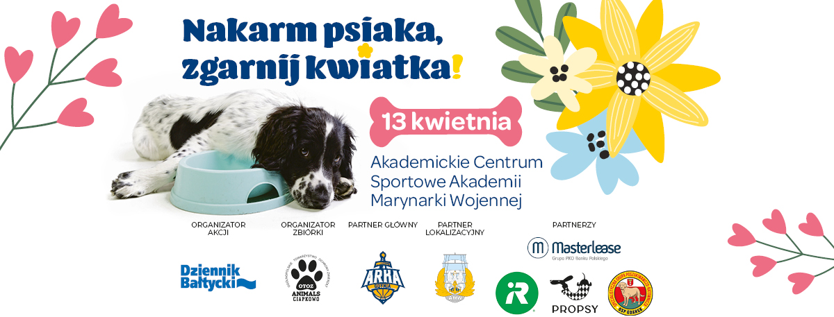 13 kwietnia schronisko OTOZ Animals „Ciapkowo” w Gdyni we współpracy z Krajową Grupą Spożywczą Arka Gdynia zaprasza do wzięcia udziału w akcji zbierania karmy i koców. Wszyscy, którzy podejmą się tego wyzwania, otrzymają sadzonki kwiatów oraz okolicznościowe certyfikaty. Wydarzenie odbędzie się w Akademickim Centrum Sportowym Akademii Marynarki Wojennej w Gdyni. W schronisku dla bezdomnych zwierząt OTOZ Animals Ciapkowo aktualnie mieszka 150 psów i 140 kotów. - Wiele z nich boryka się z problemami układu pokarmowego, dlatego zachęcamy do przynoszenia karmy wysokiej jakości, dedykowanej zwierzętom z delikatnym przewodem pokarmowym. Ponadto bardzo przydatne będą koce polarowe, legowiska, podkłady higieniczne, smycze oraz duże ręczniki – mówi Anna Elgert, OTOZ Animals "Ciapkowo" w Gdyni, organizatorka akcji.- Za każdy dar przekazany na rzecz naszych ukochanych czworonogów, każdy będzie obdarowany kwiatkiem przez Dziennik Bałtycki - dodaje. W zeszłym roku organizacja dokonała 5348 interwencji, ratując zwierzęta, których opiekunowie nie dbali o nie właściwie. Te dotknięte przemocą stworzenia potrzebują najlepszych warunków i wsparcia, dlatego postanowiliśmy im pomóc! Planujemy zorganizować zbiórkę karmy i koców, które przekażemy schronisku. Wsparcie będą nam służyć odważni wolontariusze - koszykarze Krajowej Grupy Spożywczej Arki Gdynia. Istnieje spora grupa zwierząt, która czeka na pomoc - mówią partnerzy wydarzenia. Plakat promujący wydarzenie "Nakarm psiaka, zgarnij kwiatka", fot. materiały prasowe wydarzenia. W imieniu organizatorów zapraszamy już w tą sobotę, 13 kwietnia w godzinach od 12.00 do 18.00 do Akademickiego Centrum Sportowego Akademii Marynarki Wojennej w Gdyni, ul. Grudzińskiego 1 (dolne Oksywie). Na każdego uczestnika czekać będzie sadzonka kwiatów, a w trakcie wydarzenia będzie można wziąć udział w wielu aktywnościach związanych z opieką nad ukochanymi pupilkami: nauka udzielania pierwszej pomocy zwierzętom podczas pokazów ratownictwa medycznego; spotkanie z behawiorystami; wystawy produktów dla czworonogów; pokazy fizjoterapii oraz podstawowych ćwiczeń dla naszych czworonożnych przyjaciół; Wstęp na wydarzenie jest bezpłatny. Opublikowano: 12.04.2024 11:00 Autor: Michał Sałata (michal.salata@gdynia.pl) Zmodyfikowano: 12.04.2024 15:44 Zmodyfikował: Redakcja portalu Gdynia.pl