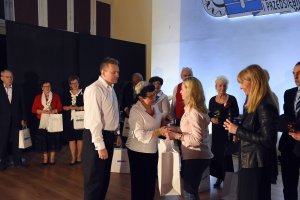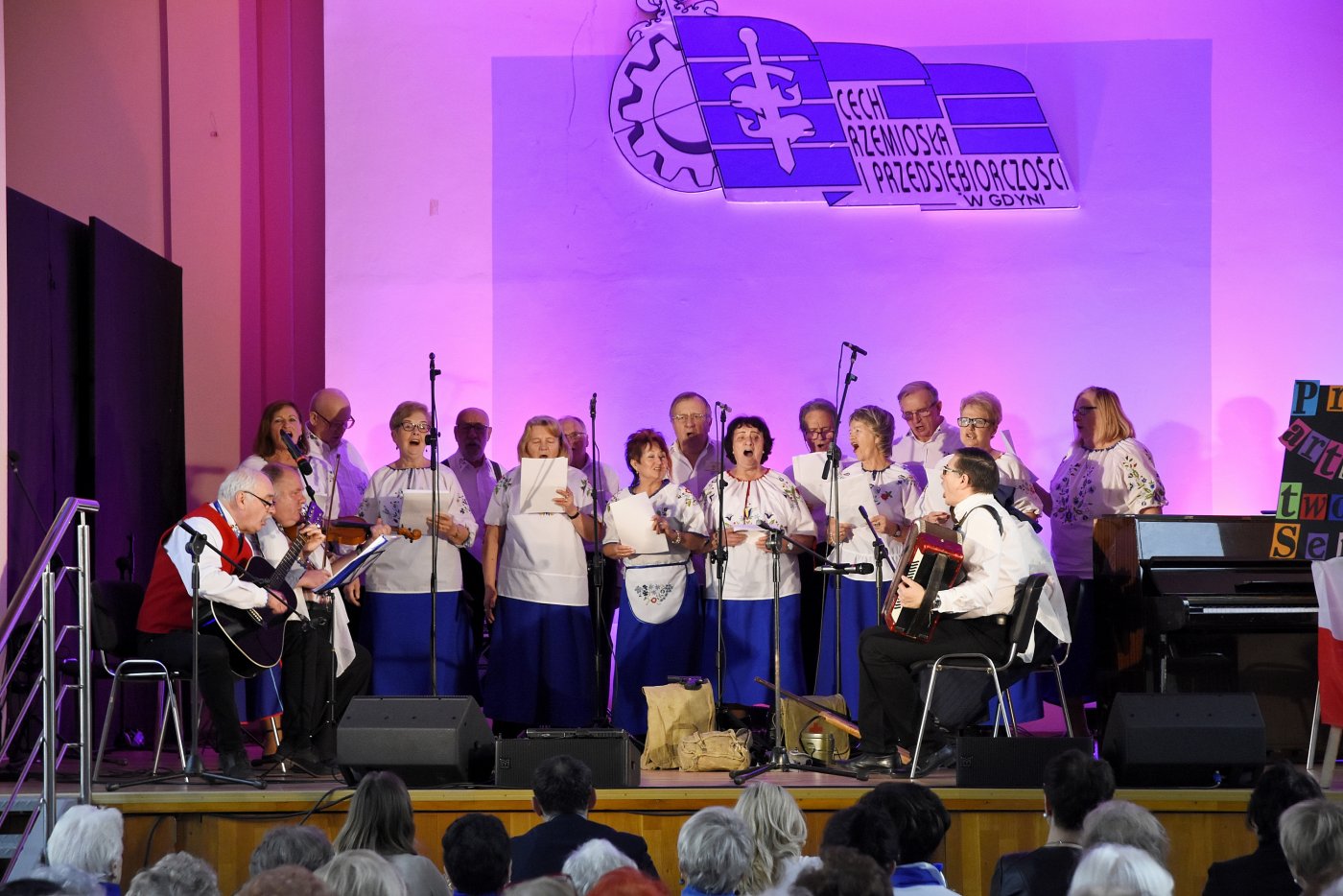 Niezwykłe wydarzenie muzyczne na długo pozostanie w pamięci gości, którzy 21 listopada tłumnie wypełnili aulę Cechu Rzemiosła w Gdyni. Odbył się tam Przegląd Twórczości Artystycznej Seniorów Gdynia 2018, w którym wzięło udział 11 zespołów. Główną nagrodę przyznano Miejskiemu Klubowi Seniora „Orłowo”.Przegląd zorganizowany przez Centrum Aktywności Seniora był skierowany do seniorów z Gdyni działających w uniwersytetach trzeciego wieku, klubach seniora, domach kultury i innych środowiskach senioralnych. Jego celem była nie tylko prezentacja dorobku artystycznego, ale też stworzenie możliwości integracji i wymiany doświadczeń między seniorami. To udało się z powodzeniem – wzajemna pomoc zespołów i po prostu chęć dobrej zabawy, wzięły górę nad rywalizacją konkursową. Sytuacje, w których grupę osłabił brak muzyka czy wokalisty, nie pozostawały bez odpowiedzi publiczności, która chętnie wspierała wszystkich występujących. Takie gesty dostrzegło jury, które tego dnia obradowało bardzo długo. - My dzisiaj wygraliśmy wszyscy. – powiedział Grzegorz Kuleta, przewodniczący jury. - Dzisiaj eksperci od życia społecznego mówią, że bardzo nam brakuje kapitału społecznego. Kapitał społeczny to jest właśnie umiejętność współpracy zespołowej, otwartość, poziom zaufania, jakim darzymy sąsiadów. To jest wielkie wyzwanie, jak sprawić, żebyśmy my jako społeczeństwo i nasze dzieci potrafiły nie rywalizować, ale współpracować. Dlatego bez względu na to, kto dzisiaj dostanie główne nagrody, to chciałbym powiedzieć, że państwo dołożyli poważną cegiełkę do budowy kapitału społecznego. To jest dla mnie największa wartość dzisiejszego dnia i największa wasza wygrana. Tegoroczny przegląd miał charakter patriotyczny ze względu na obchody 100. Rocznicy Odzyskania Niepodległości RP. Każdy z zespołów zaprezentował jeden utwór patriotyczny i jeden pod hasłem „przebój stulecia”. Znane szlagiery rozbrzmiewały raz po raz i pobudzały całą aulę do wspólnego śpiewu. Na uwagę zasługuje również oprawa wystąpień. Seniorzy mieli specjalne uszyte stroje i rekwizyty, jak np. kaszubskie motywy na koszulach, czy portret marszałka Piłsudskiego wniesiony na scenę. Wydarzenie prowadziła dyrektor Centrum Aktywności Seniora, Bożena Zglińska, która niemal przez cały czas przebywała na scenie, komunikując się z publicznością: - Najważniejsza jest pasja do śpiewania i tą radością należy dzielić się na co dzień. Nie tylko od święta, nie tylko na przeglądach. Bo piosenka jest dobra na wszystko. Dziękuję państwu za tę nutę radości i uśmiechu, ale też za postawę patriotyczną, która dzisiaj wybrzmiewała w waszych wystąpieniach. Widać, że wszystko robicie z wielką pasją i zaangażowaniem. Chcecie być po prostu najlepsi. I jesteście najlepsi! W oczekiwaniu na wyniki przeglądu, czas seniorom umiliły taneczne i wokalne występy utalentowanej młodzieży z Młodzieżowego Domu Kultury pod przewodnictwem Elżbiety Cupiał, która nie kryła wzruszenia z tej wizyty. – Ja sobie obiecałam proszę państwa, że znajdę swojej mamie grupę seniorów w mieście, do której będzie mogła dołączyć. – powiedziała ze sceny. Wydarzenie odbyło się pod patronatem prezydenta Gdyni Wojciecha Szczurka, senatora Sławomira Rybickiego oraz posłanki Małgorzaty Zwiercan.Wyniki Przeglądu Artystycznej Twórczości Seniorów Gdynia 2018I miejsce: Zespół z Miejskiego Klubu Seniora „Orłowo”II miejsce: Orkiestra „Retro Band”III miejsce: Zespół wokalny „Perełki” z Miejskiego Klubu Seniora „Witomino”Wyróżnienia: Chór Kamerton i Ryszard Korcz (harmonijka)Nagrody specjalne za pomoc w akompaniowaniu: pan Andrzej (skrzypce) i pan Ryszard (pianino) Galeria zdjęć Pobierz galerię Przegląd Twórczości Artystycznej Seniorów Gdynia 2018, fot. Michał Kowalski / UM Gdynia Pobierz zdjęcie Wiceprezydent Michał Guć i dyrektor CAS, Bożena Zglińska witają uczestników Przeglądu Twórczości Artystycznej Seniorów Gdynia 2018, fot. Michał Kowalski / UM Gdynia Pobierz zdjęcie Przegląd Twórczości Artystycznej Seniorów Gdynia 2018, fot. Michał Kowalski / UM Gdynia Pobierz zdjęcie Przegląd Twórczości Artystycznej Seniorów Gdynia 2018, fot. Michał Kowalski / UM Gdynia Pobierz zdjęcie Przegląd Twórczości Artystycznej Seniorów Gdynia 2018, fot. Michał Kowalski / UM Gdynia Pobierz zdjęcie Przegląd Twórczości Artystycznej Seniorów Gdynia 2018, fot. Michał Kowalski / UM Gdynia Pobierz zdjęcie Przegląd Twórczości Artystycznej Seniorów Gdynia 2018, fot. Michał Kowalski / UM Gdynia Pobierz zdjęcie Przegląd Twórczości Artystycznej Seniorów Gdynia 2018, fot. Michał Kowalski / UM Gdynia Pobierz zdjęcie Przegląd Twórczości Artystycznej Seniorów Gdynia 2018, fot. Michał Kowalski / UM Gdynia Pobierz zdjęcie Przegląd Twórczości Artystycznej Seniorów Gdynia 2018, fot. Michał Kowalski / UM Gdynia Pobierz zdjęcie Przegląd Twórczości Artystycznej Seniorów Gdynia 2018, fot. Michał Kowalski / UM Gdynia Pobierz zdjęcie Przegląd Twórczości Artystycznej Seniorów Gdynia 2018, fot. Michał Kowalski / UM Gdynia Pobierz zdjęcie Przegląd Twórczości Artystycznej Seniorów Gdynia 2018, fot. Michał Kowalski / UM Gdynia Pobierz zdjęcie Przegląd Twórczości Artystycznej Seniorów Gdynia 2018, fot. Michał Kowalski / UM Gdynia Pobierz zdjęcie Przegląd Twórczości Artystycznej Seniorów Gdynia 2018, fot. Michał Kowalski / UM Gdynia Pobierz zdjęcie Przegląd Twórczości Artystycznej Seniorów Gdynia 2018, fot. Michał Kowalski / UM Gdynia Pobierz zdjęcie Przegląd Twórczości Artystycznej Seniorów Gdynia 2018, fot. Michał Kowalski / UM Gdynia Pobierz zdjęcie Występ Młodzieżowego Domu Kultury podczas Przeglądu Twórczości Artystycznej Seniorów Gdynia 2018, fot. Michał Kowalski / UM Gdynia Pobierz zdjęcie