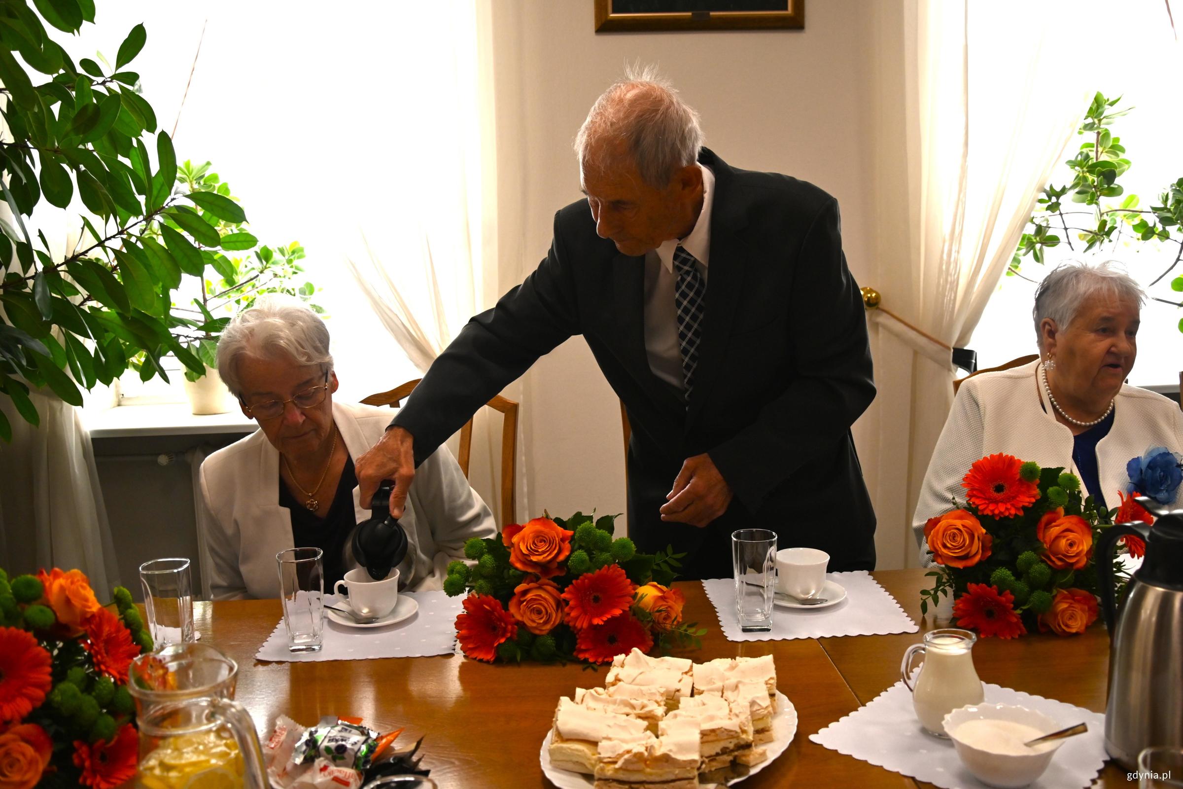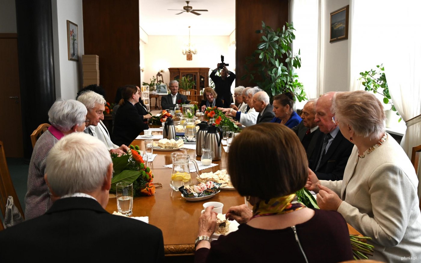 Ponad sześćdziesiąt lat wspólnej drogi – pełnej chwil szczęścia, wzajemnego wsparcia i pokonywania życiowych przeciwności – to piękna historia, jaką napisały pary małżeńskie spotykające się z prezydent Gdyni Aleksandrą Kosiorek. W ciepłej, niemal rodzinnej atmosferze uczczono ich niezwykłe jubileusze, którym towarzyszyły wzruszenie, wdzięczność i szczere emocje. W poniedziałek, 20 kwietnia w Urzędzie Stanu Cywilnego w Gdyni odbyła się wyjątkowa uroczystość poświęcona długoletnim małżeństwom, które przez dekady budowały swoje życie na miłości, szacunku i oddaniu. Zaproszenie prezydent Aleksandry Kosiorek przyjęło sześć par świętujących 60. rocznicę ślubu oraz jedna para mogąca poszczycić się imponującym jubileuszem 65-lecia wspólnego życia. W tym szczególnym dniu jubilatom towarzyszyły rodziny i najbliżsi, dzieląc z nimi radość oraz dumę z tak pięknego świadectwa miłości.Wśród uhonorowanych znaleźli się: Janina i Paweł Dmytrenkowie, Lidia i Jerzy Jabłońscy, Halina i Edwin Sitterleeowie, Genowefa i Włodzimierz Zachowie, Bernadeta i Edmund Liegmannowie Halina i Zbigniew Gwardiakowie, Maria i Lech Skrzyneccy. Jubilaci z prezydent Gdyni Aleksandrą Kosiorek oraz naczelnik Urzędu Stanu Cywilnego w Gdyni Inocentą Nycz (fot. Aneta Marczak) Prezydent Gdyni Aleksandra Kosiorek oraz naczelnik Urzędu Stanu Cywilnego w Gdyni Inocenta Nycz powitały jubilatów oraz ich bliskich, wręczyły kwiaty, dyplomy oraz upominki. Z całego serca gratuluję Państwu tak wyjątkowego i imponującego jubileuszu. To coś niezwykłego – przez całe życie iść obok drugiej osoby, ramię w ramię, dzieląc każdy dzień. Wiem, że była to podróż pełna pięknych chwil i emocji, ale z pewnością nie zabrakło na niej także wyzwań i trudniejszych momentów. Stanowicie Państwo wspaniały wzór dla nas i naszych dzieci – mówiła prezydent Aleksandra Kosiorek. Jubilaci w towarzystwie prezydent miasta i naczelnik wydziału mieli okazję zasiąść do popołudniowej herbaty, dzieląc się przy niej receptą na małżeńskie szczęście. Przekonywali, że wystarczy być blisko, dużo rozmawiać, ale jeszcze więcej słuchać, umieć wybaczać i wciąż odnajdywać się na nowo. Jubilaci na podwieczorku u prezydent miasta (fot. Aneta Marczak) Rozmawiano też o Gdyni, która zajmuje szczególne miejsca w sercach jubilatów, niezależnie czy urodzili się właśnie tu i dorastali w gdyńskich dzielnicach, czy też miasto z morza i marzeń było ich wyborem i spełnieniem pragnień o życiu w najnowocześniejszej metropolii regionu. Galeria zdjęć Pobierz galerię Jubilaci w trakcie podwieczorku (fot. Aneta Marczak) Pobierz zdjęcie Jubilaci w trakcie podwieczorku (fot. Aneta Marczak) Pobierz zdjęcie Jubilaci w trakcie podwieczorku (fot. Aneta Marczak) Pobierz zdjęcie Jubilaci w trakcie podwieczorku (fot. Aneta Marczak) Pobierz zdjęcie Prezydent Gdyni Aleksandra Kosiorek składa gratulacje jednej z jubilatek (fot. Aneta Marczak) Pobierz zdjęcie Prezydent Gdyni Aleksandra Kosiorek wręczyła bukiety kwiatów (fot. Aneta Marczak) Pobierz zdjęcie Jubilaci otrzymali również listy gratulacyjne (fot. Aneta Marczak) Pobierz zdjęcie Jedna z jubulatek pokazuje zdjęcia Aleksandrze Kosiorek (fot. Aneta Marczak) Pobierz zdjęcie Pary spotkały się na tradycyjnym podwieczorku (fot. Aneta Marczak) Pobierz zdjęcie Jubilaci w towarzystwie prezydent Gdyni (fot. Aneta Marczak) Pobierz zdjęcie Jubilaci w towarzystwie prezydent Gdyni (fot. Aneta Marczak) Pobierz zdjęcie Jubilaci w towarzystwie prezydent Gdyni (fot. Aneta Marczak) Pobierz zdjęcie Jubilaci w towarzystwie prezydent Gdyni (fot. Aneta Marczak) Pobierz zdjęcie Warunki pobierania Wszelkie prawa do zdjęć lub grafik prezentowanych w ramach portalu, należą do Prowadzącego portal lub do podmiotów z nim współpracujących i podlegają ochronie prawnej. Prowadzący portal zezwala na kopiowanie i przedstawianie utworów jedynie w celach niekomercyjnych oraz pod warunkiem zachowania go w oryginalnej postaci i zachowaniem kontekstu tematu, do którego zostało wykorzystaneprzez redakcję gdynia.pl. Opublikowane materiały powinny zawsze zawierać źródło, czyli adres strony www.gdynia.pl. Na publikowanie utworów w innych celach wymagana jest zgoda właściciela strony czyli Prowadzącego portal. Opublikowano: 21.04.2026 08:40 Autor: Aneta Marczak (aneta.marczak@gdynia.pl) Zmodyfikowano: 21.04.2026 09:41 Zmodyfikował: Aleksandra Dylejko