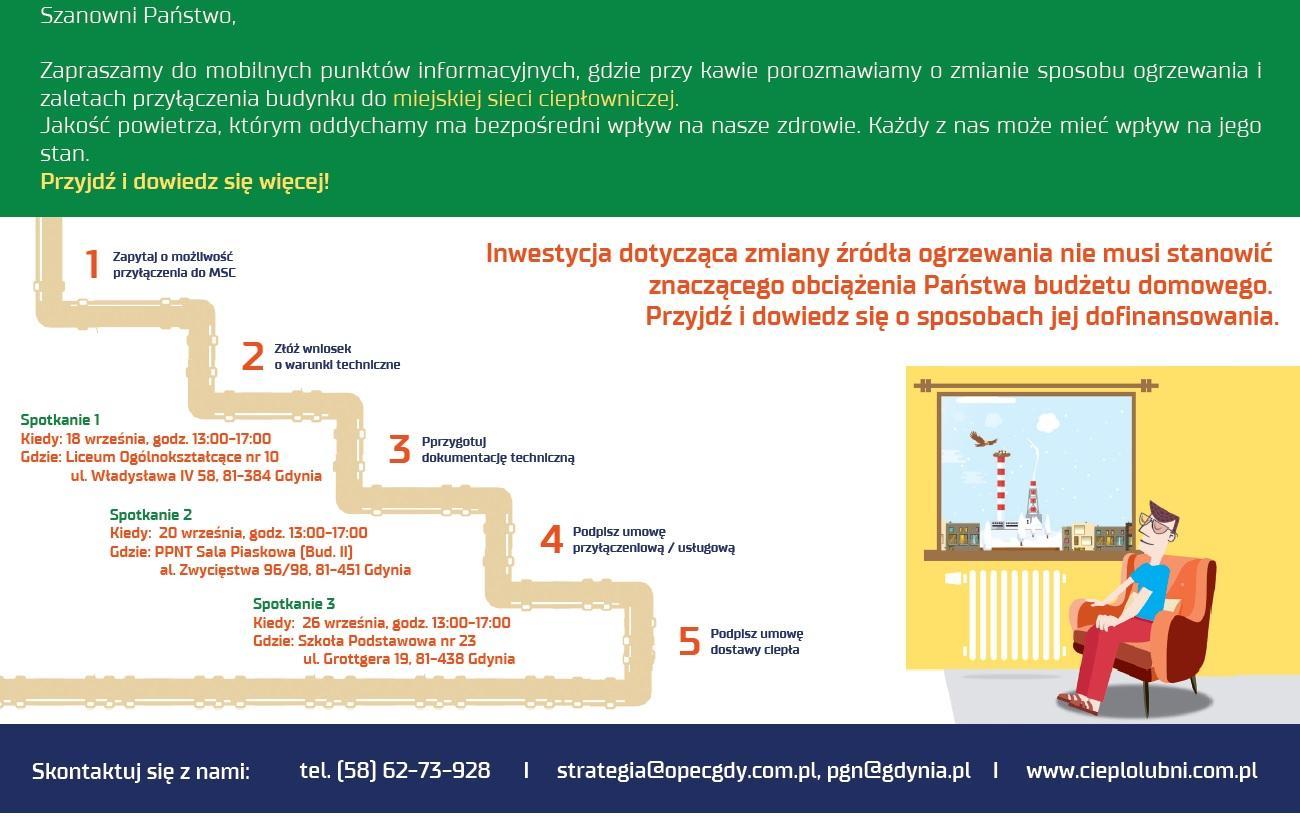 Był Mały Kack, teraz czas na Działki Leśne. To tam odbędzie się kolejne spotkanie informacyjne dla mieszkańców, którzy chcieliby otrzymać dofinansowanie na wymianę starych pieców węglowych na bardziej ekologiczne źródło ogrzewania. Uczestnicy dowiedzą się o tym, jakie dotacje mogą dostać i jak mogą się o nie ubiegać. Najbliższe spotkanie odbędzie się 5 września, o godz. 17.00, w budynku szkoły przy ul. Wolności 25. Kolejne zaplanowane są na 12, 13, 18, 20 i 26 września w różnych gdyńskich dzielnicach.W Gdyni szanujemy powietrze i dbamy o jego jakość. Zbliżają się chłodne dni i sezon grzewczy. Warto więc pomyśleć o sposobie ogrzewania swoje domu. Nierzadko mieszkańcy wciąż korzystają z pieców węglowych, które negatywnie wpływają na stan powietrza. W Gdyni działa już 13 czujników jakości powietrza, a ich wskazania można sprawdzać na mapie, dostępnej pod adresem: www.powietrze.gdynia.pl. Po uruchomieniu takiego narzędzia każdy mieszkaniec wie, jaki jest stan powietrza w jego najbliższym sąsiedztwie.Jednak wymiana pieca węglowego na piec gazowy lub podłączenie nieruchomości do miejskiej sieci ciepłowniczej oznacza realne koszty. A zatem warto przyjść na spotkanie i dowiedzieć się, na jakie wsparcie - dotację lub pożyczkę - można liczyć z różnych źródeł. Można je łączyć i nic nie stoi na przeszkodzie, by zmienić źródło ogrzewania i ograniczyć emisję pyłów do powietrza, którym wszyscy oddychają. Takie spotkania to jeden z najlepszych sposobów informowania mieszkańców.– Domy, ogrzewane piecami węglowymi, to przeważnie budynki starsze, w których od wielu lat nikt nie zmieniał źródła ogrzewania. Ich właściciele nie zawsze korzystają z internetu, a to właśnie do nich trzeba dotrzeć i odpowiedzieć na wszelkie pytania i wątpliwości. Musimy wyjść z urzędu i pójść tam, gdzie łatwiej jest dotrzeć mieszkańcom, szczególnie osobom starszym. Dlatego wspólnie z naszymi partnerami w kampanii „Ciepłolubni” i Wojewódzkim Funduszem Ochrony Środowiska zapraszamy na spotkania konsultacyjne, gdzie informacja będzie na wyciągnięcie ręki – mówi Michał Guć, wiceprezydent Gdyni ds. innowacji. Trwa propagowanie ogólnopolskiego programu „Czyste powietrze”, który ruszy we wrześniu. Jest on skierowany do osób, które chcą zlikwidować stary, nieekologiczny piec węglowy i zastąpić go np. piecem gazowym, z jednoczesnym przeprowadzeniem kompleksowej termomodernizacji budynku. Żeby móc dowiedzieć się więcej o tym programie, dla mieszkańców organizowane są specjalne spotkania. Pierwsze odbyło się pod koniec czerwca na Małym Kacku. We wrześniu zaplanowane są kolejne.Najbliższe spotkanie informacyjne odbędzie się 5 września, o godz. 17.00, w Szkole Podstawowej nr 26, która mieści się przy ul. Wolności 25. Na mieszkańców będą tam czekać przedstawiciele miasta i Wojewódzkiego Funduszu Ochrony Środowiska i Gospodarki Wodnej w Gdańsku, który jest operatorem programu w naszym województwie. Przybliżą oni założenia nowego programu „Czyste Powietrze”, który ruszy już we wrześniu. Ma on charakter ogólnopolski. Na jego realizację przeznaczono 103 miliardy złotych, zaś realizacja programu ma trwać do 2029 roku. Środki finansowe będą rozdzielane za pośrednictwem Wojewódzkich Funduszy Ochrony Środowiska i Gospodarki Wodnej, z czego prawie 62% tych środków zostanie przyznanych w formie dotacji. Dzięki uzyskanych z niego dotacji będzie można sfinansować nawet 90% kosztów wymiany pieca i termomodernizacji budynku. Doradcy energetyczni powiedzą, jak można starać się o dofinansowanie. Wielkość dotacji będzie uzależniona od dochodu netto na osobę w rodzinie. Informacje na temat programu dostępne są też tutaj. Od prawie dwudziestu lat dotacje na zmianę źródła ogrzewania przyznaje też miasto. W tym przypadku można uzyskać dofinansowanie nawet w wysokości 3000 złotych. Jeśli ktoś zdecyduje się podłączyć dom do miejskiej sieci, to dodatkowo może liczyć na sfinansowanie 75 procent kosztów przyłącza od OPEC-u. A PGE przyzna dotację nawet w wysokości 5000 złotych. Tak wysokie dofinansowanie jest przyznawane tylko mieszkańcom Gdyni. W innych miastach te kwoty są niższe. W związku z planami rozbudowy sieci ciepłowniczejprzez OPEC na terenie Gdyni, kolejne spotkania będą się odbywać się w formule – „Przyjdź o dowolnej godzinie, zapytaj, dowiedz się”. O możliwościach podłączenia do sieci ciepłowniczej i programie swoich dotacji opowiedzą pracownicy OPEC i PGE Energia Ciepła, a przedstawiciele miasta przekażą informacje na temat dotacji przyznawanych przez urząd oraz innych, dostępnych w ramach programu rządowego. Kolejne spotkania odbędą się: 12 i 13 września, w godz. 11.00-16.00, na Placu Górnośląskim (stoiska informacyjne w namiotach); 18 września – od godz. 13.00 do godz. 17.00 – w X Liceum Ogólnokształcącym (ul. Władysława IV 58); 20 września, w godz. 13.00-17.00, w sali piaskowej w budynku II w Pomorskim Parku Naukowo-Technologicznym oraz 26 września – od godz. 13.00 do godz. 17.00 – w Szkole Podstawowej nr 23 (ul. Grottgera 19). Galeria zdjęć Pobierz galerię Plakat informacyjny programu "Czyste powietrze" Pobierz zdjęcie Warunki pobierania Wszelkie prawa do zdjęć lub grafik prezentowanych w ramach portalu, należą do Prowadzącego portal lub do podmiotów z nim współpracujących i podlegają ochronie prawnej. Prowadzący portal zezwala na kopiowanie i przedstawianie utworów jedynie w celach niekomercyjnych oraz pod warunkiem zachowania go w oryginalnej postaci i zachowaniem kontekstu tematu, do którego zostało wykorzystaneprzez redakcję gdynia.pl. Opublikowane materiały powinny zawsze zawierać źródło, czyli adres strony www.gdynia.pl. Na publikowanie utworów w innych celach wymagana jest zgoda właściciela strony czyli Prowadzącego p