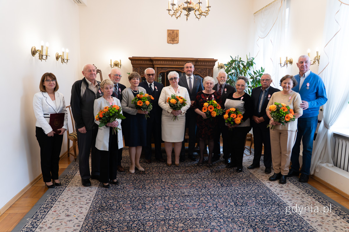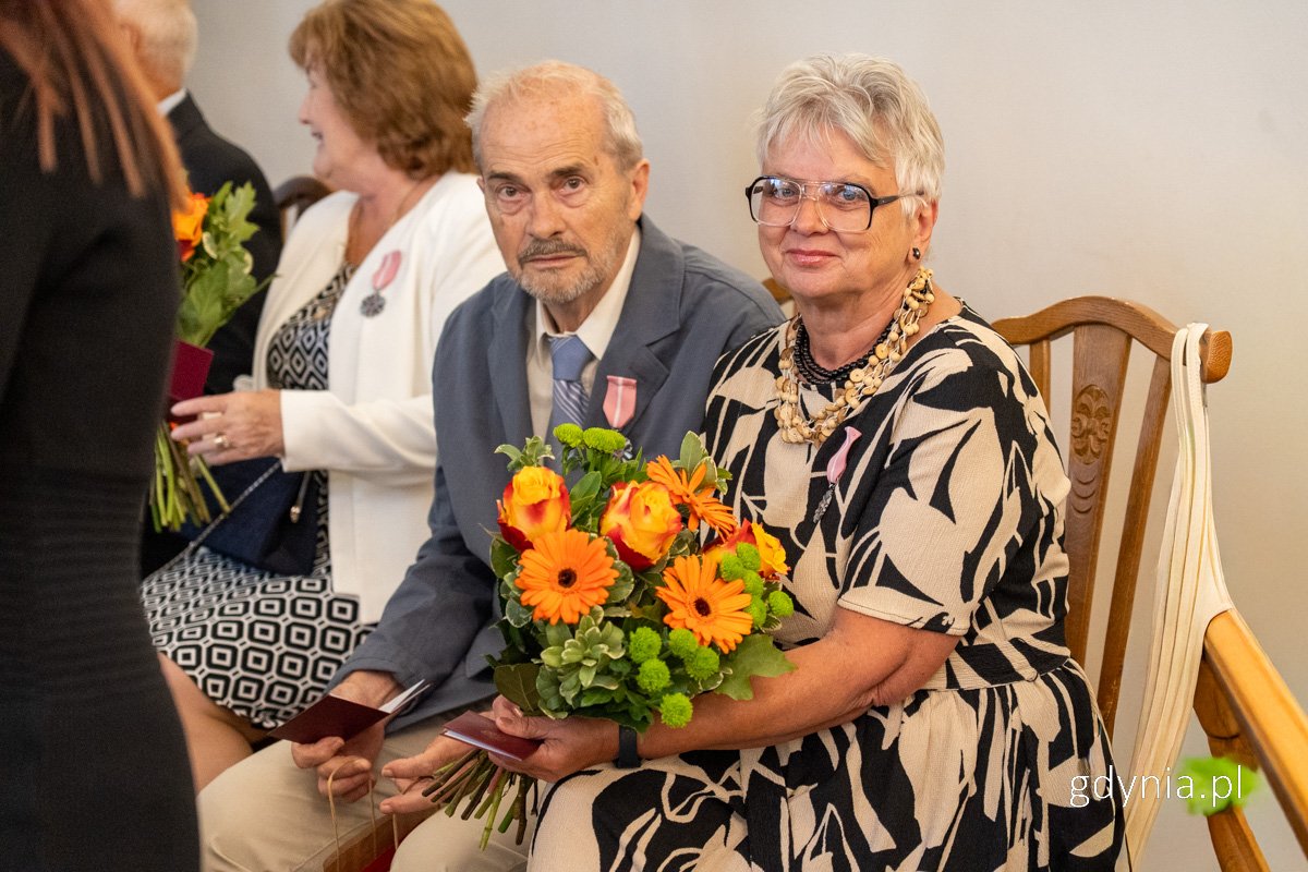 Pół wieku temu przyrzekali, że uczynią wszystko, aby ich małżeństwo było zgodne, szczęśliwe i trwałe. Przyrzeczenia dotrzymali – gdyńskie pary, które przeżyły razem co najmniej 50 lat, otrzymały z rąk Tomasza Augustyniaka, wiceprezydenta Gdyni, Medale za Długoletnie Pożycie Małżeńskie. Medal za Długoletnie Pożycie Małżeńskie nadaje Prezydent Rzeczypospolitej Polskiej można otrzymać tylko raz w życiu, pod warunkiem, że się przeżyło w jednym związku małżeńskim co najmniej 50 lat. Takich par w Gdyni nie brakuje, spotykają się w Urzędzie Stanu Cywilnego kilka razy w roku. W poniedziałek, 22 września, miała miejsce kolejna uroczystość, w trakcie której odznaczenia z rąk Tomasza Augustyniaka, wiceprezydenta Gdyni, odebrało dwadzieścia jubileuszowych par. Składamy Państwu najserdeczniejsze gratulacje tej wspólnej drogi. Z podziwem patrzymy na imponującą miłość, która jej towarzyszy, która stanowi dla nas przykład – mówił do jubilatów Tomasz Augustyniak, wiceprezydent Gdyni. O godz. 13:00 medale odebrali: Krystyna i Lech Banasiakowie, Barbara i Romuald Czesnowscy, Gabriela i Marian Dobrolińscy, Ewa i Janusz Dziubińscy, Krystyna Hellich-Ilijewa i Nikoła Ilijew, Felicja i Witold Jagiełkowie, Ewa i Bogusław Jakubowscy. Jubilaci z godz. 13.00 wraz z wiceprezydentem Tomaszem Augustyniakiem i Iwoną Tyczyńską, zastępcą kierownika USC w Gdyni (fot. Michał Sałata) O godz. 14:00 medale odebrali: Irena i Jarosław Kaławie, Krystyna i Janusz Langowie, Wita Ludwichowska-Pawłowska i Roman Pawłowski, Iwona i Jacek Matuszewscy, Grażyna i Andrzej Pietkiewiczowie, Barbara i Jerzy Ronkowscy. Jubilaci z godz. 14.00 wraz z wiceprezydentem Tomaszem Augustyniakiem i Iwoną Tyczyńską, zastępcą kierownika USC w Gdyni (fot. Michał Sałata) O godz. 15:00 medale odebrali: Elżbieta i Zenon Rosińscy, Zofia i Jerzy Sobczykowie, Elżbieta i Piotr Szutenbergowie, Teresa i Jan Topyłowie, Wiesława i Stanisław Tudkowie, Krystyna i Stanisław Waszniewscy, Elżbieta i Edward Wionczkowie. Jubilaci z godz. 15.00 wraz z wiceprezydentem Tomaszem Augustyniakiem i Iwoną Tyczyńską, zastępcą kierownika USC w Gdyni (fot. Michał Sałata)Jubileusz uświetnił krótki koncert uczennicy Szkoły Muzycznej w Gdyni, Kaliny Twarowskiej przy akompaniamencie Macieja Gałązki.Wszystkim parom serdecznie gratulujemy jubileuszu i życzymy wielu wspólnych, pięknych lat w zdrowiu i szczęściu!Zgłoszenia jubileuszu wraz z wnioskiem o nadanie medali dokonują zainteresowani. Procedura i wniosek znajdują się w Biuletynie Informacji Publicznej. Galeria zdjęć Pobierz galerię Tomasz Augustyniak, wiceprezydent Gdyni i Iwona Tyczyńska, zastępca kierownika USC w Gdyni w trakcie uroczytości (fot. Michał Sałata) Pobierz zdjęcie Medale za Długoletnie Pożycie Małżeńskie małżonkowie odbierali z rąk Tomasza Augustyniaka, wiceprezydenta Gdyni (fot. Michał Sałata) Pobierz zdjęcie Medale otrzymują pary, które przeżyły wspólnie co najmniej 50 lat (fot. Michał Sałata) Pobierz zdjęcie Medale otrzymują pary, które przeżyły wspólnie co najmniej 50 lat (fot. Michał Sałata) Pobierz zdjęcie To wyjątkowa chwila w życiu gdyńskich par (fot. Michał Sałata) Pobierz zdjęcie Medale otrzymują pary, które przeżyły wspólnie co najmniej 50 lat (fot. Michał Sałata) Pobierz zdjęcie Warunki pobierania Wszelkie prawa do zdjęć lub grafik prezentowanych w ramach portalu, należą do Prowadzącego portal lub do podmiotów z nim współpracujących i podlegają ochronie prawnej. Prowadzący portal zezwala na kopiowanie i przedstawianie utworów jedynie w celach niekomercyjnych oraz pod warunkiem zachowania go w oryginalnej postaci i zachowaniem kontekstu tematu, do którego zostało wykorzystaneprzez redakcję gdynia.pl. Opublikowane materiały powinny zawsze zawierać źródło, czyli adres strony www.gdynia.pl. Na publikowanie utworów w innych celach wymagana jest zgoda właściciela strony czyli Prowadzącego portal. Opublikowano: 23.09.2025 09:15 Autor: Aneta Marczak (aneta.marczak@gdynia.pl) Zmodyfikowano: 23.09.2025 10:22 Zmodyfikował: Paweł Jałoszewski