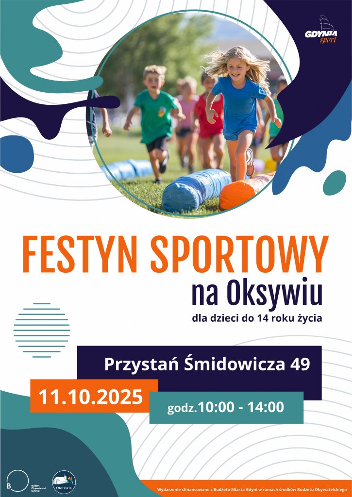 Zapraszamy wszystkie dzieci do 14 roku życia na pełen radości i ruchu Festyn sportowy. Wydarzenie odbędzie się 11 października 2025 r. (sobota), w godz. 10:00–14:00 na terenie Przystani Śmidowicza 49. W programie m.in.: sportowe tory przeszkód wesołe zabawy i konkurencje zawody sportowe Wstęp wolny – zabierz ze sobą przyjaciół, rodziców i dużo uśmiechu! Koordynatorem wydarzenia jest Gdyńskie Centrum Sportu, festyn sfinansowany ze środków Gdyńskiego Budżetu Obywatelskiego.Do zobaczenia na sportowo! Opublikowano: 06.10.2025 14:37 Autor: Joanna Majchrowska (joanna.majchrowska@gdynia.pl) Zmodyfikowano: 07.10.2025 13:10 Zmodyfikował: Paweł Jałoszewski