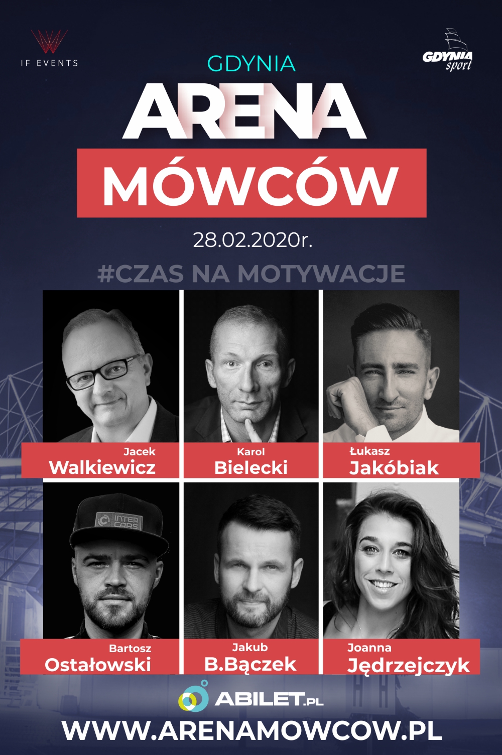 Często, myląc pojęcia, szukamy metod do zmotywowania się, gdy w rzeczywistości brakuje nam determinacji. Zainspirowani staramy się przełożyć inspirację na konkretne działania i wyniki, co wcale nie jest takie proste, jak się nam wydaje.Arena Mówców to połączenie sportowców i mówców motywacyjnych, symbioza wiedzy i metod sprawdzonych w praktyce, której celem jest pokazanie szerszej perspektywy i odnalezienia w sobie tego odpowiedniego czynnika, który przybliży nas do celu.Wydarzenie kierowane jest zarówno do osób zainteresowanych tematyką rozwoju osobistego, ludzi ze świata biznesu i aktywnych zawodowo, ale także sportowców, młodego pokolenia i licznych „fanów” i obserwatorów zaproszonych gości.Jest to kilka godzin pełnych inspiracji, konkretnych historii z życia, wymiany doświadczeń i cennych wskazówek. Arenę Mówców wyróżnia specjalny dobór prelegentów o wysokim poziomie prezentowanych treści i doświadczenia. PRELEGENCI Jacek WalkiewiczPsycholog, absolwent Uniwersytetu Warszawskiego, jeden z najbardziej rozpoznawalnych polskich mówców. Członek Stowarzyszenia Profesjonalnych Mówców. Od dwudziestu pięciu lat aktywnie uczestniczy w rozwoju edukacji dorosłych. Autor programów szkoleniowych i wykładów dla ponad 500 firm. Ceniony za wiedzę merytoryczną i inspirujący , narracyjny, pełen humoru sposób prowadzenia spotkań. Jego wykłady na TEDx umieszczone na YouTube mają ponad 5 milionów odsłon. Autor książek: „Rozmyślnik Jacka Walkiewicza”, „Pełna MOC życia” i „Pełna MOC możliwości”. Ta ostatnia została nagrodzona w konkursie miesięcznika Charaktery ( nagroda Teofrasta ) za najpopularniejsza książkę psychologiczną napisaną w 2013 roku. W 2019 za całokształt dokonań i za działanie na rzecz wspierania kobiet otrzymał w konkursie Polish Businesswoman Awards magazynu „Businesswoman & life” statuetkę w kategorii Wybitna Osobowość.Karol BieleckiPolski piłkarz ręczny, grający na pozycji lewego rozgrywającego, reprezentant Polski, uczestnik Igrzysk Olimpijskich, wicemistrz świata z 2007, brązowy medalista Mistrzostw Świata 2009, brązowy medalista z Mistrzostw Świata 2015 w Katarze.W 2010 roku, podczas meczu z Chorwacją , w wyniku wypadku stracił oko. Jest jedynym na świecie zawodnikiem który grał w piłkę ręczną bez oka odnosząc sukcesy nieporównywalne z innymi.W 2016 roku pełnił rolę chorążego reprezentacji Polski podczas Igrzysk Olimpijskich w Rio de Janeiro, podczas których został także Królem Strzelców rzucając 55 bramek.Po sezonie klubowym 2017/2018 zakończył karierę sportową. Obecnie zajmuje się wystąpieniami motywacyjnymi, bazując na swoich doświadczeniach i historii.Łukasz JakóbiakZasłynął wywieszeniem gigantycznego CV przed firmą w której chciał pracować. Otrzymał nominację do nagrody Wiktora w kategorii Odkrycie Telewizyjne Roku 2012. W 2014 roku znalazł się w rankingu 50 Najbardziej Kreatywnych w Biznesie magazynu Brief.W 2013, 2014, 2015 i 2016 roku zrealizował swój cykl wykładów na terenie całej Polski. Prowadził wykłady razem z Jackiem Walkiewiczem. Był gościem seminarium „Go Big Or Go Home” z Randy Gagem, gdzie wysłuchało go ponad pół tysiąca uczestników. Wykładał jako jeden z 12 najlepszych mówców na Festiwalu Inspiracji w 2014, 2015 i 2016 roku. W marcu 2015 wystąpił na Uniwersytetach: Greenwich i Oxford i na prestiżowej konferencji TEDx. Prelegent jednego z największych eventów motywacyjnych w Europie – Życie bez Ograniczeń – z Nickiem Vujicicem i Lesem Brownem. W 2016 roku ze swoim wykładem był gościem Sebastiana Kotowa na evencie Efekt Domina. W styczniu 2017 roku wystąpił na jednym z największych eventów dla kobiet Queens of Life. Do września 2017 roku wysłuchało go podczas wystąpień na żywo ponad 65 000 osób. Gość i prelegent wielu konferencji, m. in. „Łódź JungleWeb”, „Like us, TOO” na Uniwersytecie Jagiellońskim, „Creative Mornings” w Warszawie czy „XX Forum Gospodarczego” w Toruniu. Brał udział w pierwszej polskiej edycji National Achievers Congress w Polsce, na której wystąpił m.in. Robert Kiyosaki, brał też udział w seminarium Jacka Canfielda oraz szkoleniach Briana Tracy, a także w The Way Ahead z Tonym Robbinsem. W 2013 roku został członkiem Stowarzyszenia Profesjonalnych Mówców w Polsce. W swoich talk-show gościł m.in. Jacka Canfielda i Brian’a Tracy. Aktualnie możemy oglądać go w programie Azja Express w telewizji TVN.Rocznie daje blisko 100 wykładów motywacyjnych. Wykładał dla firm takich jak Allianz, PZU, Coca Cola, Loreal, W.Kruk, Pracuj.pl, 3M, Bacardi, BZ WBK, Orange, Aviva, UBS, Beko, Avon, Gedeon Richter, GSK, Microsoft, iSpot, Siemens, Lekam, ING, PLAY, PEPSICO.Bartosz OstałowskiJedyny na świecie profesjonalny kierowca sportowy, który nie ma obu rąk i samochód prowadzi stopą. Posiada międzynarodową licencję wyścigową FIA i z sukcesami rywalizuje na równych zasadach ze sprawnymi kierowcami w Driftingowych Mistrzostwach Polski oraz ligach europejskich. Jest mówcą motywacyjnym występującym na konferencjach i spotkaniach biznesowych. Stara się wspierać ludzi w osiąganiu sukcesów, a także w rozwoju osobistym. Bartosz prowadzi autorski kanał na YouTube – „Pasja na Krawędzi”, w którym testuje wyjątkowe, ekskluzywne samochody i rozmawia z inspirującymi ludźmi o ich pasjach. Ponadto jest artystą i członkiem Wydawnictwa VDMFK, które zrzesza osoby malujące stopami i ustami.Jakub B.BączekTrener mentalny, mówca inspiracyjny, przedsiębiorca, autor, podróżnik, człowiek wolny finansowo. Zachęca do bardzo konkretnego działania, nie pozostawiając Cię z teorią. Łatwo mu uczyć czegoś, co sam osiągnął. Jest bardzo szczery, ale też wymagający. Mówi o sprawach, o których inni boją się powiedzieć. Zachęca słuchaczy do wychodzenia ze strefy komfortu, do ryzykowania i działania 
