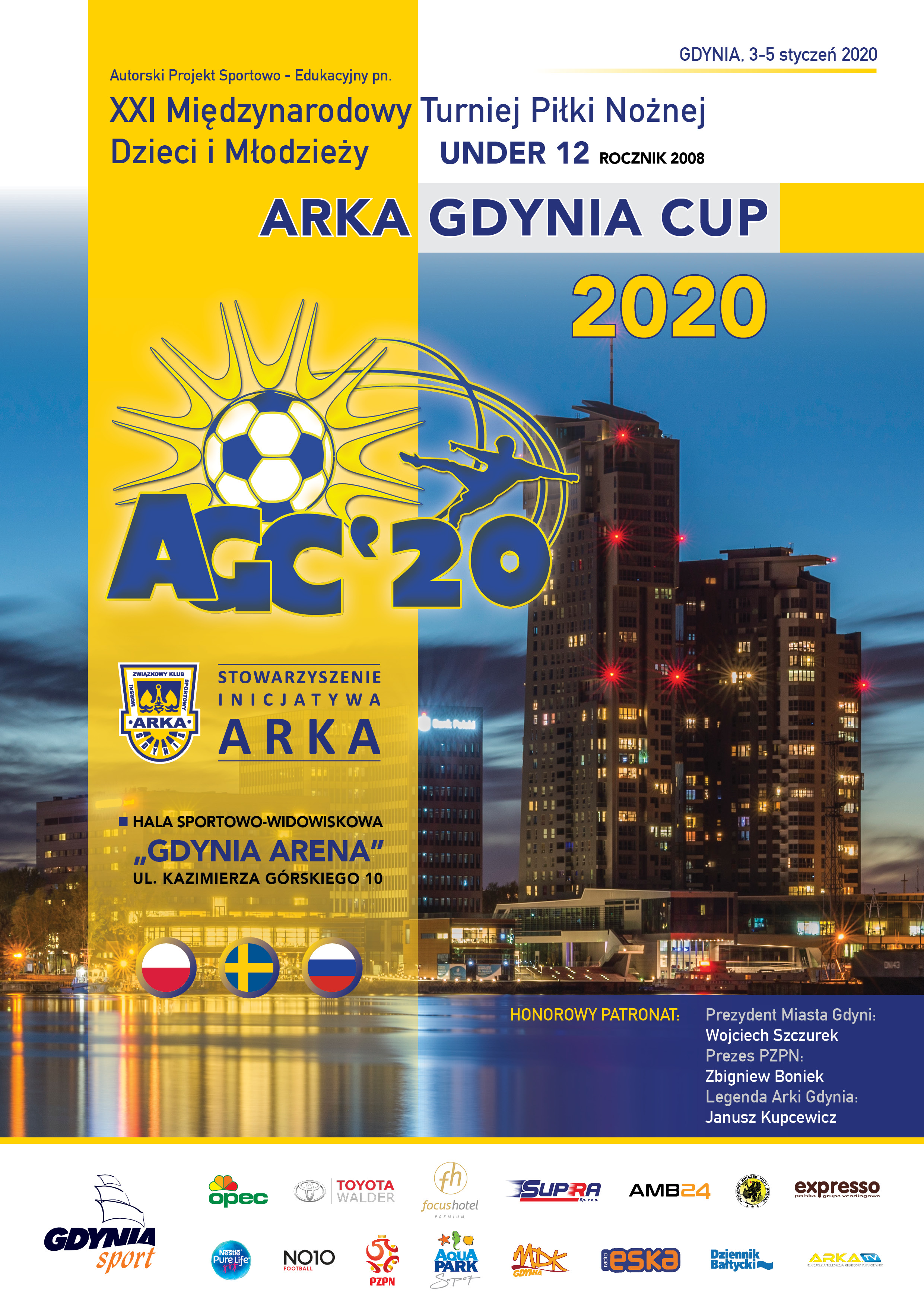Przed nami 21. edycja międzynarodowego turnieju piłki nożnej dzieci i młodzieży do lat 12 „Arka Gdynia Cup 2019”. Impreza pod patronatem prezydenta Gdyni Wojciecha Szczurka, prezesa Polskiego Związku Piłki Nożnej Zbigniewa Bońska oraz byłego piłkarza żółto-niebieskich i reprezentacji Polski Janusza Kupcewicza odbędzie się w dniach 4-5 stycznia w Gdynia Arenie. Wstęp wolny.W turnieju wystąpi 16 drużyn, które zostały podzielone na cztery grupy. Nie zabraknie zwycięzców letniej edycji imprezy, a więc Królewskich Płock, ekip takich jak m. in.: Śląsk Wrocław, Górnik Łęczna i Lechia Gdańsk, a także gości z zagranicy. W przeszłości Gdynię odwiedzały takie słynne akademie piłkarskie jak: Bayer 04 Leverkusen, Borussia Dortmund czy Everton FC. W tym roku w mieście z morza i marzeń zameldują się piłkarze IFK Haninge Stockholm. Na starcie nie zabraknie również lokalnych talentów. Arka Gdynia wystawi dwie drużyny, które zagrają w grupach A i B. Początek rywalizacji sportowej nastąpi w sobotę o godzinie 10:00. Tego dnia młodzi zawodnicy będą grali do wieczora, z godzinną przerwą na oficjalne rozpoczęcie imprezy (godz. 14:00). W niedzielę piłkarze wybiegną na parkiet Gdynia Areny jeszcze szybciej. Od 9:00 do 16:30 rozgrywane będą mecze fazy play-off oraz starcia o konkretne lokaty. Po nich nastąpi dekoracja medalowa oraz oficjalne zakończenie. Amatorów talentu młodych graczy na pewno ucieszy fakt, że podczas dwudniowej rywalizacji, będą mogli obejrzeć 52 spotkania! Po więcej informacji na temat turnieju zapraszamy na jego oficjalną stronę internetową.GRUPA A1. Chojnik Jelenia Góra2. Górnik Łęczna3. Arka II Gdynia 4. Arkonia SzczecinGRUPA B 1. IFK Haninge Stockholm2. Arka Gdynia 3. Rona Ełk4. Gwardia KoszalinGRUPA C 1. Królewscy Płock2. Lechia Gdańsk3. Jeziorak Iława4. Jedynka RedaGRUPA D 1. Śląsk Wrocław2. Radunia Stężyca 3. Dragon Bojano 4. Olimpia Elbląg Opublikowano: 03.01.2020 14:00 Autor: Michał Kozłowski (m.kozlowski@gdynia.pl)
