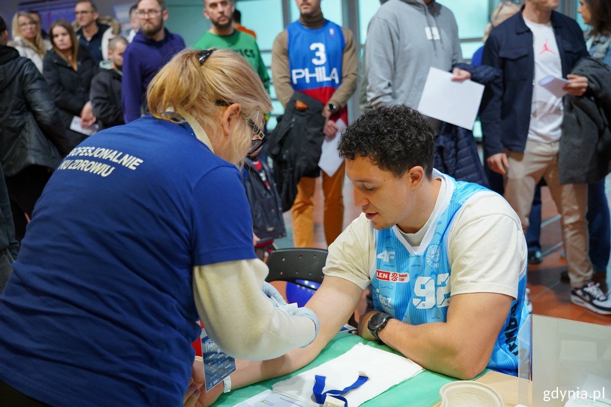 Niedziela, 16 listopada upływa w Gdyni pod znakiem sportowych emocji i badań profilaktycznych dla mężczyzn. Wszystko to dzięki akcji „AMW Arka Dla Jaj”. Podczas ligowego starcia żółto-niebieskich z Górnikiem Zamek Książ Wałbrzych – z końcowym wynikiem 85:69 dla naszej ekipy trenera Česnauskisa – wszyscy panowie mogli się za darmo przebadać. Dobry przykład dali obecni na meczu między innymi gdyńscy samorządowcy, przedstawiciele klubu i sportowcy. Choć niedzielna (16 listopada) pogoda nas nie rozpieszcza, w Polsat Plus Arenie Gdynia było gorąco. Temperaturę podgrzały sportowe emocje podczas spotkania 8. kolejki Orlen Basket Ligi między AMW Arką Gdynia i Górnikiem Zamek Książ Wałbrzych. Mecz zakończył się zwycięstwem żółto-niebieskich z wynikiem 85:69.Zawodnicy AMW Arki – dzięki wsparciu Gdyńskiego Centrum Zdrowia – wystąpili w specjalnych niebieskich strojach meczowych symbolizujących solidarność z mężczyznami walczącymi z nowotworami jąder i prostaty. Jedną z takich symbolicznych koszulek ze swoim nazwiskiem z rąk prezesa klubu Bartłomieja Wołoszyna otrzymała prezydent Aleksandra Kosiorek.Na zdjęciu: prezes klubu AMW Arka Bartłomiej Wołoszyn wręcza prezydent Aleksandrze Kosiorek meczową koszulkę z jej nazwiskiem (fot. Mateusz Słodkowski) Dobry przykład Listopad to również miesiąc profilaktyki męskich nowotworów. Dlatego głównym przesłaniem niedzielnego meczu był finał akcji „AMW Arka Dla Jaj”, w ramach trwającej kampanii Movember. Podczas wydarzenia panowie mogli skorzystać z licznych bezpłatnych badań profilaktycznych. Wideo i montaż: Michał Sałata Trwa Movember, więc w Gdyni też mówimy o męskiej profilaktyki raka jąder. Dzisiaj specjalne wydarzenie – mecz AMW Arki Gdynia z Górnikiem Zamek Książ Wałbrzych, a przy okazji panowie, którzy przychodzą dopingować naszej drużynie, mogą przebadać się. Cały październik i listopad powtarzam, że profilaktyka jest najważniejsza i kosztuje tylko chwilę czasu – mówi Aleksandra Kosiorek, prezydent Gdyni.Nasi koszykarze stale są pod kontrolą medyczną, przed każdym sezonem, praktycznie co chwilę są badania, żeby byli w 100% zdrowi. Bo ich zdrowie przekłada się na wyniki sportowe, a z drugiej strony ich organizm jest ich narzędziem pracy. Musimy zrozumieć, że my jako ludzie jesteśmy jak maszyny i żeby ta maszyna funkcjonowała dobrze, czy to na co dzień, czy to w pracy, musi być sprawna – dodaje Bartłomiej Wołoszyn, prezes AMW Arki Gdynia. Podczas spotkania AMW Arki z Górnikiem dobry przykład, aby dbać o siebie i swoje zdrowie dali również m.in.: przewodniczący Rady Miasta Gdyni Tadeusz Szemiot, wiceprezydent Maciej Zielonka, prezes PLK Łukasz Koszarka, prezes klubu AMW Arka Gdynia Bartłomiej Wołoszyn i Marek Drygas, kanclerz Akademii Marynarki Wojennej. W wydarzeniu wzięła też udział Teresa Bysewska, przewodnicząca Komisji Sportu, Turystyki i Rekreacji Rady Miasta Gdyni. Oczywiście nie tylko mężczyzna, ale każdy powinien o siebie dbać i badać się. Przede wszystkim robić to dla swoich najbliższych, żebyśmy mogli z nimi spędzić jak najwięcej czasu w zdrowiu. Sam jestem bardzo ciekawy, co będzie słychać u moich córek za 20-30 lat i chciałbym to na własne oczy zobaczyć – informuje Tadeusz Szemiot, przewodniczący Rady Miasta Gdyni.Ja też się dziś zbadałem, bo profilaktyka jest bardzo ważna. Wszyscy się badajmy – apeluje Maciej Zielonka, wiceprezydent Gdyni. Na zdjęciu: Tadeusz Szemiot, przewodniczący Rady Miasta Gdyni podczas badania PSA (fot. Magda Śliżewska)Do samorządowców dołączył również znany polski youtuber z branży fitness – AJ, czyli Adam Josef Modzelewski. Wideo i montaż: Michał SałataStrefę Zdrowia w Polsat Plus Arenia Gdynia przygotowali m.in.: Szpitale Pomorskie, Miejski Ośrodek Pomocy Społecznej, Narodowy Fundusz Zdrowia, Powiatowa Stacja Sanitarno-Epidemiologiczna, Pomorski Dom Nadziei oraz Fundacja Gdyński Most Nadziei (kampania „Odważni Wygrywają”). Na miejscu można było m.in. nauczyć się samobadania piersi i jąder, zrobić badanie PSA, zmierzyć poziom cukru we krwi, sprawdzić ciśnienie oraz zrobić test na HIV/HCV/kiłę. Galeria zdjęć Pobierz galerię Na zdjęciu: wiceprezydent Gdyni Maciej Zielonka podczas badania PSA (fot. Magda Śliżewska) Pobierz zdjęcie Na zdjęciu m.in. (od lewej): prezydent Aleksandra Kosiorek, prezes PLK Łukasz Koszarka i prezes klubu AMW Arka Gdynia Bartłomiej Wołoszyn (fot. Magda Śliżewska) Pobierz zdjęcie Na zdjęciu: prezes PLK Łukasz Koszarka podczas badania PSA (fot. Magda Śliżewska) Pobierz zdjęcie Akcja „AMW Arka Dla Jaj” (fot. Magda Śliżewska) Pobierz zdjęcie Na zdjęciu: Marek Drygas, kanclerz Akademii Marynarki Wojennej podczas badania PSA (fot. Magda Śliżewska) Pobierz zdjęcie Na zdjęciu: AJ, czyli Adam Josef Modzelewski podczas badania PSA (fot. Magda Śliżewska) Pobierz zdjęcie Akcja „AMW Arka Dla Jaj” (fot. Magda Śliżewska) Pobierz zdjęcie Na zdjęciu m.in. (od lewej): prezydent Aleksandra Kosiorek, wiceprezydent Maciej Zielonka, Bartłomiej Wołoszyn, prezes AMW Arki Gdynia i AJ (fot. Magda Śliżewska) Pobierz zdjęcie Akcja „AMW Arka Dla Jaj” (fot. Magda Śliżewska) Pobierz zdjęcie Mecz AMW Arka Gdynia vs. Górnik Zamek Książ Wałbrzych (fot. Magda Śliżewska) Pobierz zdjęcie Na trybunach m.in. prezydent Aleksandra Kosiorek i prezes klubu AMW Arka Gdynia Bartłomiej Wołoszyn (fot. Magda Śliżewska) Pobierz zdjęcie Mecz AMW Arka Gdynia vs. Górnik Zamek Książ Wałbrzych (fot. Magda Śliżewska) Pobierz zdjęcie Na trybunach m.in. przewodniczący RMG Tadeusz Szemiot, wiceprezydent Maciej Zielonka i radna miasta Teresa Bysewska (fot. Magda Śliżewska) Pobierz zdjęcie Na zdjęciu m.in. AJ w oczekiwaniu na badanie PSA (fot. Magda Śliżewska) Pobierz zdjęcie Mecz AMW Arka Gdynia vs. Górnik Zamek Książ Wałbrzych (fot. Magda Śliżew