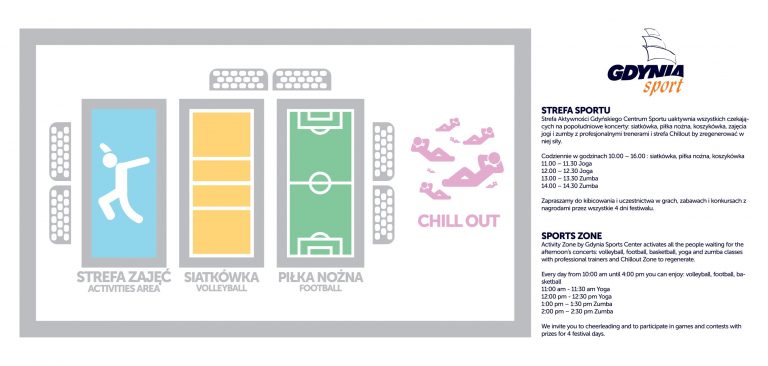 Zapraszamy do Strefy Aktywności Gdyńskiego Centrum Sportu, która w ciągu dnia uaktywni uczestników rozpoczynającego się w przyszłym tygodniu Open’era. Boiska do siatkówki i piłki nożnej, zajęcia jogi i zumby z profesjonalnymi trenerami, to tylko nieliczne sportowe atrakcje na miejscu.Animatorzy zadbają o aktywny wypoczynek w godzinach 10.00 – 16.00, a przed kolejnymi koncertami będzie można odpocząć i zregenerować siły w specjalnie przygotowanej Strefie Chilloutu.W punkcie informacyjnym dostępne będą informacje o Gdyni oraz o nadchodzących imprezach w naszym mieście. Zapraszamy do kibicowania i uczestnictwa w grach, zabawach i konkursach z nagrodami przez wszystkie 4 dni festiwalu.Godziny zajęć z trenerem:11.00 – 11.30 Joga12.00 – 12.30 Joga13.00 – 13.30 Zumba14.00 – 14.30 Zumba Opublikowano: 27.06.2018 11:02 Autor: Michał Kozłowski (m.kozlowski@gdynia.pl) Zmodyfikowano: 28.06.2018 13:00 Zmodyfikował: Agnieszka Janowicz