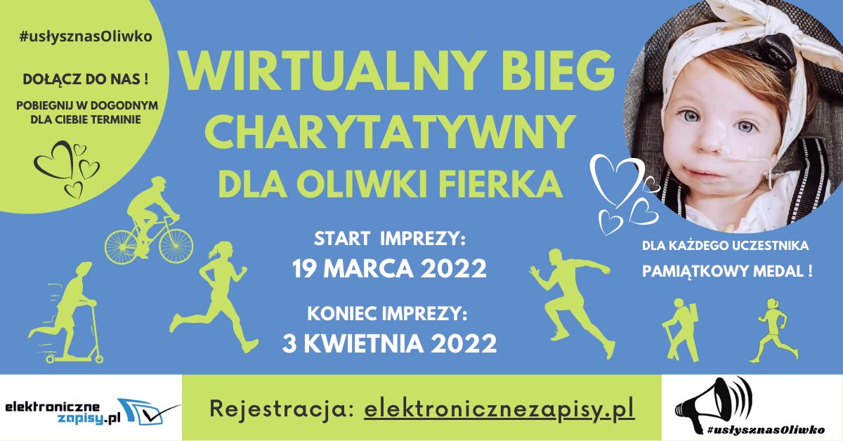 Zapraszamy do wzięcia udziału w charytatywnym biegu w wirtualnej formule dla Oliwii Fierka. Dziewczynka ma zaledwie 17 miesięcy, a przeszła więcej niż niejeden dorosły. Oliwka urodziła się z szeregiem wad wrodzonych między innymi z niewykształconymi małżowinami usznymi, makrostomią prawostronną, jedną nerką oraz wadą serca VSD. Celem biegu jest zbiórka pieniędzy na operację rekonstrukcji małżowin usznych oraz wszczepienia implantu. Operację, którą przeprowadzić będzie można w USA kosztuje ponad 600 000 zł.Zasady udziału w biegu są proste. Wystarczy wejść na stronę charytatywnego biegu, wybrać zakładkę „Zapisz się” i wpłacić darowiznę w kwocie min. 30 zł. Zbiórka dla Oliwii prowadzona jest za pośrednictwem Fundacji Siepomaga poprzez dedykowaną skarbonkę na stronie www.Podczas wpłaty należy podać imię i nazwisko osoby zapisanej na bieg lub uczynić to anonimowo. Następnie potwierdzenie wpłaty wraz z danymi należy przesłać na adres mailowy. W terminie od 19 marca do 3 kwietnia należy pokonać dystans 5 kilometrów w dowolnym miejscu i formule. Może to być bieg, spacer, jazda na rowerze czy hulajnodze.Wszystkim, którzy podadzą adres do korespondencji w formularzu zgłoszeniowym, wysłane zostaną dyplom uczestnictwa oraz medale zaprojektowane i wykonane specjalnie na tę okazję przez firmę drewnianemedale.pl. Zachęcamy także do chwalenia się wynikiem lub samym udziałem w biegu poprzez udostępnienie zdjęcia, zrzutu ekranu z aplikacji lub po prostu przez zamieszczenie informacji z podaniem numeru startowego na stronie wydarzenia na Facebooku dodając hasztag #usłysznasOliwko.Dla Oliwki w grudniu ubiegłego roku organizowane były koncerty, z których dochód ze sprzedaży biletów przeznaczony został na operację. Podczas występów można było posłuchać gdyńskiej formacji Kiev Office, pięcioosobowego projektu multimedialnego ROD, a także zespołów THE FERRULES oraz Golden Life. Opublikowano: 23.02.2022 14:49 Autor: Marek Urbaniak (m.urbaniak@gdyniasport.pl) Zmodyfikowano: 23.02.2022 14:58 Zmodyfikował: Agnieszka Janowicz