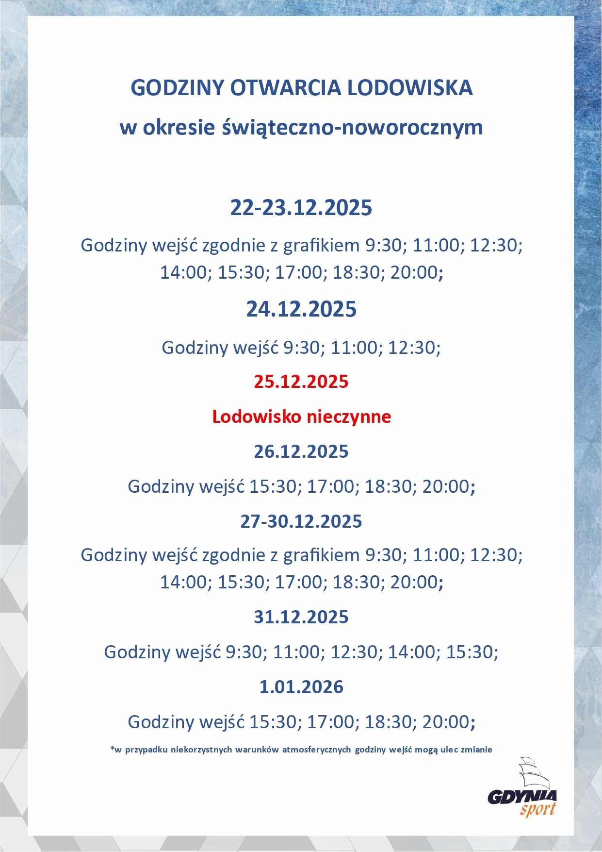 W okresie świąt i nowego roku zmienia się harmonogram lodowiska w Gdyni. Serdecznie zapraszamy do korzystania z gdyńskiego lodowiska w tym wyjątkowym okresie. Przyjdźcie i dołączcie do zabawy w tym magicznym czasie, spalając jednocześnie świąteczne kalorie podczas aktywnej zabawy na lodzie. To doskonała okazja, aby spędzić przyjemne chwile na świeżym powietrzu, doskonaląc swoje umiejętności łyżwiarskie czy po prostu bawiąc się z rodziną i przyjaciółmi. STRONA INTERNETOWA LODOWISKA Opublikowano: 23.12.2025 08:45 Autor: Piotr Suchenia (p.suchenia@gdyniasport.pl) Zmodyfikowano: 23.12.2025 15:47 Zmodyfikował: Jakub Winiewski