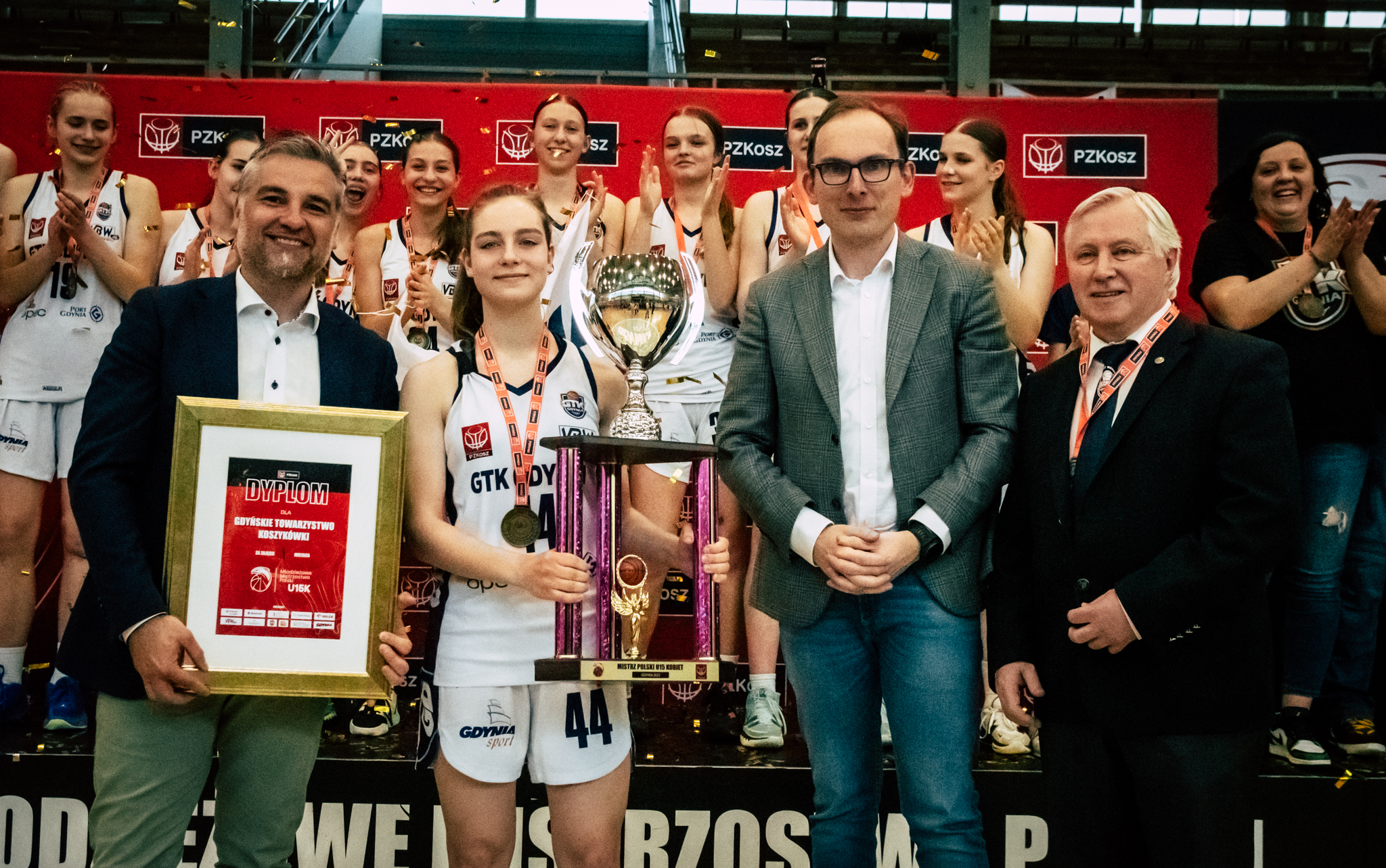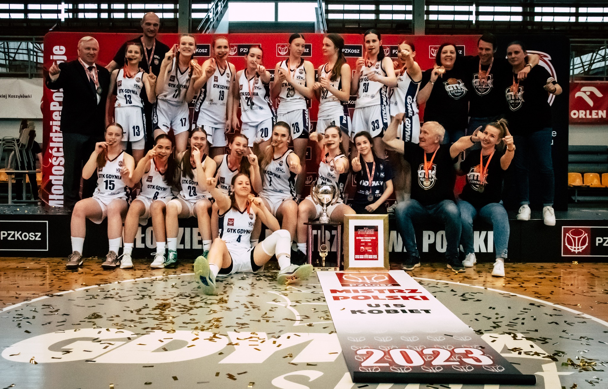GTK Gdynia kończy sezon 2022/2023 w kategorii do lat 15 ze złotym medalem! Gdynianki w meczu finałowym pokonały Zagłębie Sosnowiec 81:79 i obroniły tytuł mistrzowski dla rocznika 2008. MVP turnieju finałowego została wybrana Victoria Rocka. To był trzeci z turniejów finałowych rozgrywanych w hali gier GCS w ciągu ostatniego miesiąca. Po rozgrywkach kobiet i mężczyzn do lat 17, przyszedł czas na zmagania najlepszych zespołów dziewcząt do lat 15. Pięć dni rywalizacji i 18 rozegranych meczów pozwoliło wyłonić kluby, które stanęły na podium Młodzieżowych Mistrzostw Polski.Gdyńskie Towarzystwo Koszykówki w grupie B rozegrało 3 spotkania, wszystkie zakończyły się na korzyść podopiecznych trenerki Katarzyny Kurkowskiej. Po trzech dniach było już jasne, że gdynianki powalczą o medale – do meczu półfinałowego awansowały z 1. miejsca. 1KS Ślęza BFD Wrocław 86:62 ( MVP: Victoria Rocka), MUKS Poznań 57:48 (MVP: Rozalia Sznajder), PTK ABM Jędraszek Pabianice 93:48 (MVP: Oliwia Lipińska). W meczu półfinałowym GTK podejmowało Szkołę Gortata Politechnikę Gdańsk, która sensacyjnie przegrała jedno spotkanie w grupie i uplasowała się na 2. pozycji. Gdynianki bardzo dobrze znają rywalki, gdyż rywalizowały z nimi niejednokrotnie. W rozgrywkach centralnych obie drużyny spotkały się w turnieju półfinałowym, wtedy górą były gdańszczanki. Sobotni półfinał przyniósł wiele emocji i wyrównanej gry, ostatecznie to gospodynie turnieju zwyciężyły i awansowały do wielkiego finału. Szkoła Gortata Politechnika Gdańsk 68:59 ( MVP: Victoria Rocka) W niedzielę, równo o 12:30 rozpoczął się wielki finał Młodzieżowych Mistrzostw Polski. GTK Gdynia podejmowało Zagłębie Sosnowiec. Sosnowiczanki na Mistrzostwach spisywały się bardzo dobrze. Do meczu finałowego, podobnie jak gdynianki awansowały bez porażki. Emocji w finale nie brakowało, wynik zmieniał się kilkukrotnie, a każda drużyna mogła przechylić szalę zwycięstwa na swoją korzyść niemal do ostatniego gwizdka. Ostatecznie to GTK wygrało dwoma punktami i cieszyło się z mistrzostwa Polski. Zagłębie Sosnowiec 81:79 ( MVP: Zuzanna Czurgiel) fot. Agnieszka Modelska / Polski Związek Koszykówki Po finale odbyło się uroczyste zakończenie turnieju i wręczenie nagród. Najważniejsza nagroda indywidualna – MVP turnieju – trafiła w ręce Victori Rockiej. Do pierwszej piątki wybrano Rozalię Sznajder, a MVP drużyny ogłoszono Oliwię Lipińską. To drugi tytuł zdobyty przez koszykarki z Gdyni w ostatnim czasie. Przed dwoma tygodniami zawodniczki GTK Gdynia U17 zdobyły srebro mistrzostw Polski. Z kolei przed tygodniem po najwyższe laury sięgnęli młodzi koszykarze GAK Gdynia, którzy zdobyli złoto w kat. U17. fot. Agnieszka Modelska / Polski Związek Koszykówki Opublikowano: 15.05.2023 10:06 Autor: Paweł Stasiak (p.stasiak@gdyniasport.pl) Zmodyfikowano: 18.05.2023 13:02 Zmodyfikował: Agnieszka Janowicz
