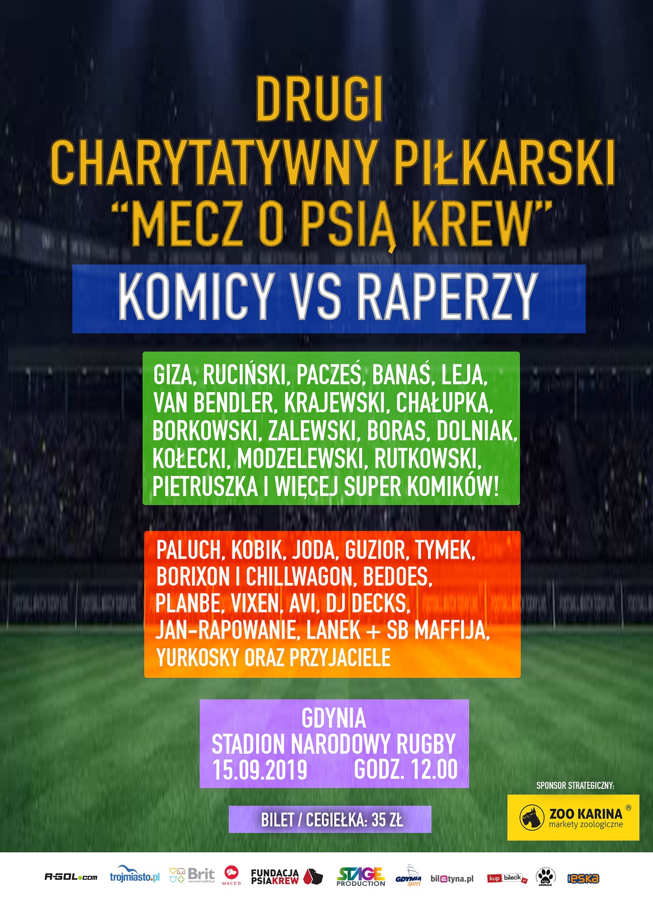 To będzie wyjątkowe wydarzenie sportowe – prawdziwa bomba łącząca fanów stand-upu, rapu oraz miłośników zwierząt. 15 września o godzinie 12 na Stadionie Narodowym Rugby odbędzie się Drugi Charytatywny Piłkarski Mecz o Psią Krew. Czołowi polscy stand-uperzy zmierzą się z raperami. Bilet kosztuje 35 zł. Dochód z imprezy przeznaczony będzie na pomoc schroniskom dla bezdomnych psów i kotów w całej Polsce. W ubiegłym roku, dzięki spotkaniu piłkarskiemu oraz Charytatywnej Gali Stand-up Comedy udało się zebrać aż ponad 160 000 zł!Są mecze piłkarskie, które na długo zostają w pamięci. We wrześniu zeszłego roku na murawie Narodowego Stadionu Rugby stanęły zespoły: komików i raperów. Kapitanem tych pierwszych był Adam Van Bendler, pomysłodawca i organizator wydarzenia, który do swojej drużyny zaprosił takie gwiazdy mikrofonu jak: Rafał Pacześ, Abelard Giza, Łukasz „Lotek” Lotkowski czy Kacper Ruciński. Ich przeciwnikami byli czołowi polscy raperzy. W bramce jak w ukropie uwijał się Eldo, a w polu swoje piłkarskie umiejętności prezentowali m. in.: Solar, Białas, Lanek, Radek i Jarek z duetu Dwa Sławy czy Zbuku. Arbitrem spotkania była przeurocza Karolina Bojar. – Co ciekawe, publiczność nie faworyzowała żadnej z drużyn, równomiernie nagradzając brawami akcje obu ekip. Nie zabrakło przepięknych bramek, śmiesznych kiksów, czy zabawnego komentarza ze strony spikera. W meczu zobaczyliśmy aż 12 goli, a rozstrzygnięcie padło dopiero po rzutach karnych, w których nieznacznie lepsi okazali się raperzy – wspomina Van Bendler.Fenomenalne gole Błażeja Krajewskiego czy Yurkoskiego, a także precyzyjne podania i strzały na bramkę Lotka wprowadzały fanów w coraz większe zdumienie. Po końcowym gwizdku, ponad półtora tysiąca kibiców zebranych na trybunach nagrodziło wszystkich zawodników owacją na stojąco.Kilka godzin później w Gdynia Arenie odbyła się Charytatywna Gala Stand-up Comedy. Na scenie pojawiło się 12 komików, których żarty oklaskiwało ponad trzy tysiące osób.– Nie umiałem ukryć łez wzruszenia. Wszystko udało się tak, jak pracowałem na to przez kilka miesięcy – wyznaje Van Bendler. I dodaje: – Dzięki obu imprezom udało się zebrać ponad 160 000 zł! To kwota zawrotna, zważywszy na fakt, że była to pierwsza tego typu impreza nie tylko w Gdyni, ale też w całej Polsce. Spodziewałem się raczej sumy pięciokrotnie niższej, która była jedynie cichym marzeniem.Dochód z imprez przeznaczony został na działania Fundacji Psia Krew.– Jako założyciel tej fundacji, przez niemal cały rok zwiedziłem wiele schronisk w większości województw i uczciwie starałem się dobierać wsparte placówki dla bezdomnych psów i kotów. Do tej pory były to schroniska w Wejherowie, Gdyni, Ostródzie, Pasłęku, Jamrozowiźnie i Zielonej Górze. Wciąż wyłaniane jest siódme miasto, które otrzyma pomoc. W tym roku planuję zwiększenie liczby schronisk. Wierzymy, że to się uda, dlatego serdecznie zapraszamy – dodaje gdyński komik.W tym roku sytuacja jest jeszcze ciekawsza, ponieważ w każdej z drużyn zobaczymy nowe twarze. W ekipie komików wystąpią: Giza, Ruciński, Pacześ, Van Bendler, Krajewski, Michał Leja czy Paweł Chałupka. Wśród raperów nie zabraknie czołowych reprezentantów sceny z Paluchem i Borixonem na czele. Swój udział zapowiedzieli również: Tymek, Jan-Rapowanie, PlanBe oraz Lanek i SB MAFFIJA. Za skład raperów odpowiada w tym roku Yurkosky.Mecz odbędzie się 15 września o godzinie 12 na Narodowym Stadionie Rugby. Osiem godzin później w Gdynia Arenie odbędzie się druga Charytatywna Gala Stand-up Comedy z udziałem śmietanki polskiej sceny stand-upowej. Bilety do kupienia na portalach kupbilecik.pl oraz na biletyna.pl. Charytatywna Gala Stand-up Comedy to wydarzenie dla osób pełnoletnich, ale na Narodowy Stadion Rugby zapraszamy wszystkich chętnych! Opublikowano: 11.09.2019 09:00 Autor: Michał Kozłowski (m.kozlowski@gdynia.pl)