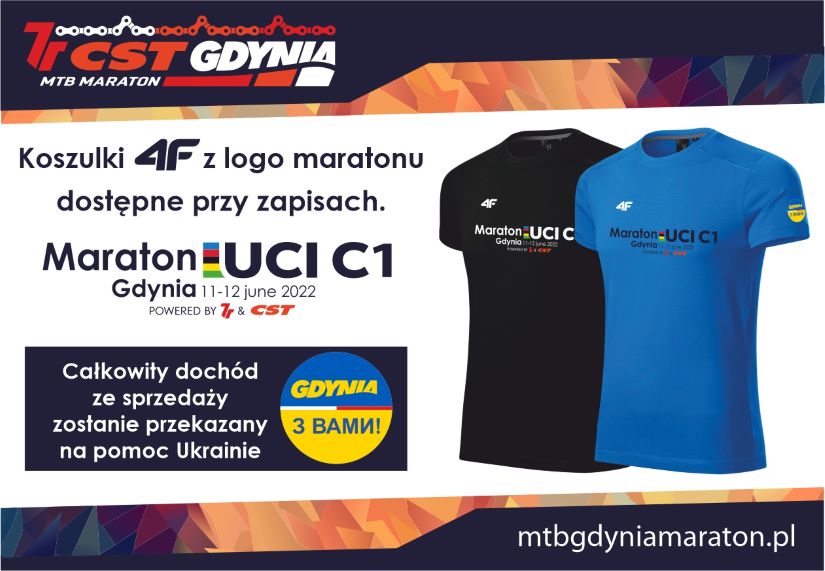 Organizatorzy tegorocznej edycji 7R CST MTB Gdynia Maratonu przygotowali dla uczestników wyjątkowe koszulki marki 4F. Cały dochód z ich sprzedaży zostanie przeznaczony na wsparcie dla Ukrainy. Zawodnicy mogą nabyć koszulki przez system rejestracyjny - podczas wypełniania formularza zgłoszeniowego. Po wyborze dystansu wyświetlą się dostępne opcje. Trykoty są w kolorze niebieskim i czarnym w kroju dla pań (S, M, L) oraz panów (S, M, L, XL). Ich cena wynosi 59 zł brutto. Odbiór koszulek możliwy będzie w biurze zawodów wraz z odbiorem pakietu startowego.Koszulki zawierają logo tegorocznej edycji na klatce piersiowej oraz specjalne żółto-niebieskie logo „Gdynia z Wami” z biało-czerwonym akcentem na wzór flagi Polski na lewym rękawku. Na piersi i tylnym barku znajduje się zaś logo producenta.Przypomnijmy, że już wcześniej w związku z napaścią zbrojną przeciwko wolnej i suwerennej Ukrainie, jako wyraz solidarności oraz wielkiego szacunku dla bohaterskiej postawy społeczeństwa ukraińskiego, Organizator wykluczył możliwość udziału w imprezie obywateli Rosji i Białorusi. Osoby takie zostaną usunięte z listy startowej i nie mogą wziąć udziału w rywalizacji.Trwają zapisy do w głównej imprezy, która odbędzie się 12 czerwca na dystanse 28, 49 i 76 kilometrów. Rejestracja otwarta jest do 7 czerwca. Nie warto zwlekać jednak do końca rejestracji bowiem od 12 maja cena rośnie o 20 zł. Rejestracja dla dzieci i młodzieży rozpocznie się w terminie późniejszym. Szczegóły dostępne są na stronie www.mtbgdyniamaraton.pl w zakładce „Rejestracja”.Organizatorem wydarzenia jest stowarzyszenie B-Active. Opublikowano: 31.03.2022 13:30 Autor: Marek Urbaniak (m.urbaniak@gdyniasport.pl) Zmodyfikowano: 31.03.2022 16:08 Zmodyfikował: Karolina Szypelt