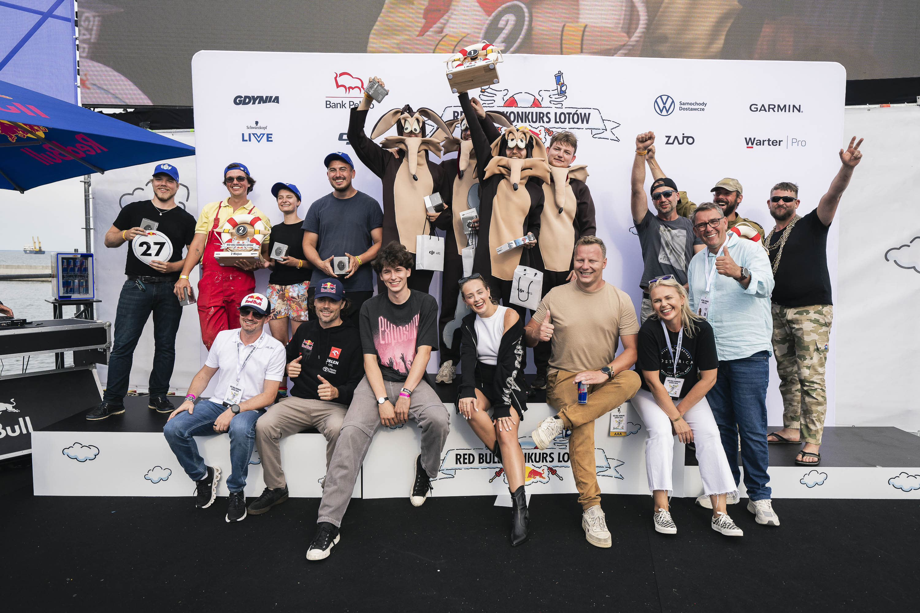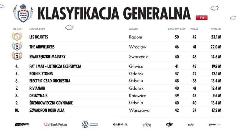 Do Gdyni przyjechali fani lotów niekoniecznie samolotowych, chociaż i dla nich przygotowano wyśmienitą podniebną ucztę! Z prawami grawitacji mierzyły się drużyny z całej Polski w ramach Konkursu Lotów Red Bull. Impreza co roku przyciąga tłumy mieszkańców, jedynych w swoim rodzaju konstruktorów i śmiałków, którzy nie boją się latać na wytworach ich wyobraźni. I tak też było w tym roku. Kto nie chciałby poczuć się jak Ikar? A tak na pewno czuli się zawodnicy i konstruktorzy, którzy przyjechali do Gdyni, aby wypróbować swoje szalone maszyny. Może nie były najtrwalsze, może nie ze stali, ale na pewno były wytworem kreacji swoich oryginalnych twórców. I zostały wypróbowane na specjalnej rampie, która posłużyła za start konkursowych lotów Red Bull. To jedna z topowych imprez wakacyjnej Gdyni. - Jesteśmy z Warszawy i Wrocławia, niektórzy z Mazur i jesteśmy debiutantami! Trochę nam stroje nie wyszły, ale i tak jest moc! Nasza lotnia trzyma się na taśmie to i my wytrzymamy – żartowali uczestnicy jednej z grup, jeszcze przed krótkim, za to spektakularnym lotem. – Jesteśmy studentami budownictwa, więc konstrukcja jest dla nas najważniejsza. A latamy na bananie. Najpierw ona potem dopiero performance – deklarowali Łukasz, Daniel, Kuba i Karol. Może na ostatnią chwilę, może pierwszy raz w życiu, ale podobno nie ostatni - szaleni konstruktorzy na starcie (fot. Małgorzata Kaliszewska)Nie inaczej było z Flinstonami z Warszawy. Duch walki był w nich wielki, ostatecznie polecieli nie za daleko za to z klasą. - Pierwsze koty za płoty i do wody. Wytrzymamy do końca, a lot będzie maksymalnie długi! Lecimy po zwycięstwo! Super impreza, fajni ludzie, świetna atmosfera, przygoda życia! – cieszyli się uczestnicy z drużyny Flinstonów. Jak na rodzinę przystało, Flinstonowie stanęli na starcie z przekonaniem, że w rodzinie siła! (fot. Małgorzata Kaliszewska)Żeby wygrać, trzeba złożyć w całość kilka rzeczy. Na wynik końcowy wpływa długość lotu, a także oceny od jurorów za kreatywność i show. Jurorom przewodził tym roku sam Adam Małysz. W Red Bull Konkursie Lotów od lat niepobity pozostaje rekord świata inżynierów z Palo Alto, wynoszący ponad 78 metrów. Na niewiele mniejszą sławę i uznanie może liczyć zespół, któremu uda się pobić rekord Polski (28,8 m).W tym roku można było liczyć na lotniczą śmietankę towarzyską! (fot. Małgorzata Kaliszewska)Zwycięzcy! Zwycięzcą tegorocznej edycji została drużyna Les Kojotes z Radomia, która wykonała imponujący lot 23 m i zdobyła mnóstwo punktów za swoje show. Na podium znaleźli się też grupa The Airwelders z Wrocławia, a trzecie miejsce zajęli Swarzędzkie Majstry.Zwycięzcy i jurorzy konkursu lotów Red Bull (fot. Bartek Woliński) Galeria zdjęć Pobierz galerię Podium i jury Red Bull Konkurs Lotów fot. Bartek Woliński Pobierz zdjęcie Święto latania w Gdyni fot. Lukas Nazdraczew Pobierz zdjęcie Red Bull Konkurs Lotów 2024 (fot. Małorzata Kaliszewska) Pobierz zdjęcie Red Bull Konkurs Lotów 2024 (fot. Mikołaj Janowicz) Pobierz zdjęcie Red Bull Konkurs Lotów 2024 (fot. Mikołaj Janowicz) Pobierz zdjęcie Red Bull Konkurs Lotów 2024 (fot. Małorzata Kaliszewska) Pobierz zdjęcie Red Bull Konkurs Lotów 2024 (fot. Małorzata Kaliszewska) Pobierz zdjęcie Red Bull Konkurs Lotów 2024 (fot. Małorzata Kaliszewska) Pobierz zdjęcie Red Bull Konkurs Lotów 2024 (fot. Małorzata Kaliszewska) Pobierz zdjęcie Red Bull Konkurs Lotów 2024 (fot. Małorzata Kaliszewska) Pobierz zdjęcie Red Bull Konkurs Lotów 2024 (fot. Małorzata Kaliszewska) Pobierz zdjęcie Red Bull Konkurs Lotów 2024 (fot. Małorzata Kaliszewska) Pobierz zdjęcie Red Bull Konkurs Lotów 2024 (fot. Małorzata Kaliszewska) Pobierz zdjęcie Red Bull Konkurs Lotów 2024 (fot. Małorzata Kaliszewska) Pobierz zdjęcie Red Bull Konkurs Lotów 2024 (fot. Małorzata Kaliszewska) Pobierz zdjęcie Red Bull Konkurs Lotów 2024 (fot. Małorzata Kaliszewska) Pobierz zdjęcie Warunki pobierania Wszelkie prawa do zdjęć lub grafik prezentowanych w ramach portalu, należą do Prowadzącego portal lub do podmiotów z nim współpracujących i podlegają ochronie prawnej. Prowadzący portal zezwala na kopiowanie i przedstawianie utworów jedynie w celach niekomercyjnych oraz pod warunkiem zachowania go w oryginalnej postaci i zachowaniem kontekstu tematu, do którego zostało wykorzystaneprzez redakcję gdynia.pl. Opublikowane materiały powinny zawsze zawierać źródło, czyli adres strony www.gdynia.pl. Na publikowanie utworów w innych celach wymagana jest zgoda właściciela strony czyli Prowadzącego portal. Opublikowano: 18.08.2024 17:14 Autor: Małgorzata Kaliszewska (malgorzata.kaliszewska@gdynia.pl) Zmodyfikowano: 19.08.2024 09:26 Zmodyfikował: Małgorzata Kaliszewska