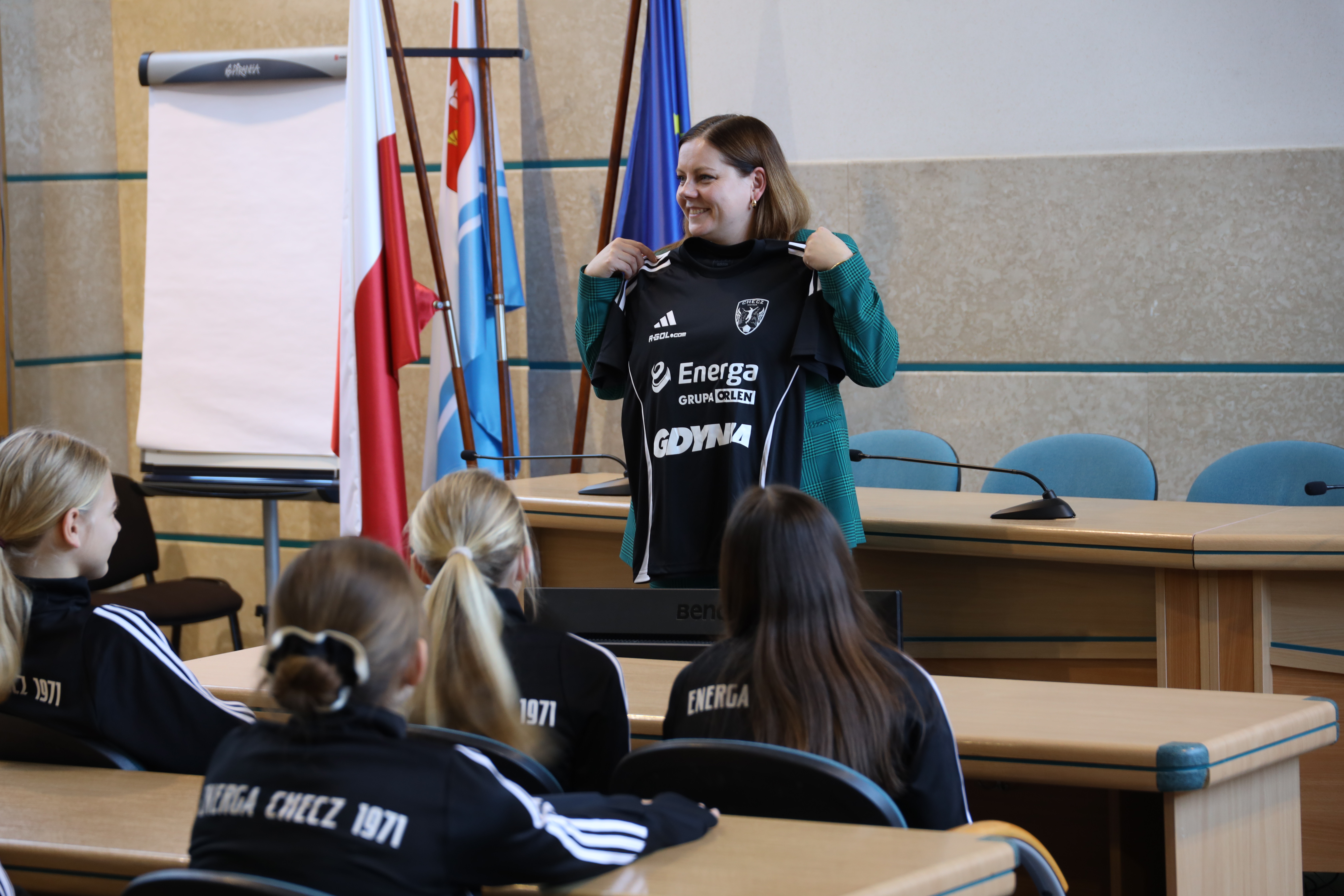 Prezydent Gdyni Aleksandra Kosiorek prezentuje koszulkę piłkarską podczas spotkania z piłkarkami Checzy Gdynia (fot. Magda Śliżewska)