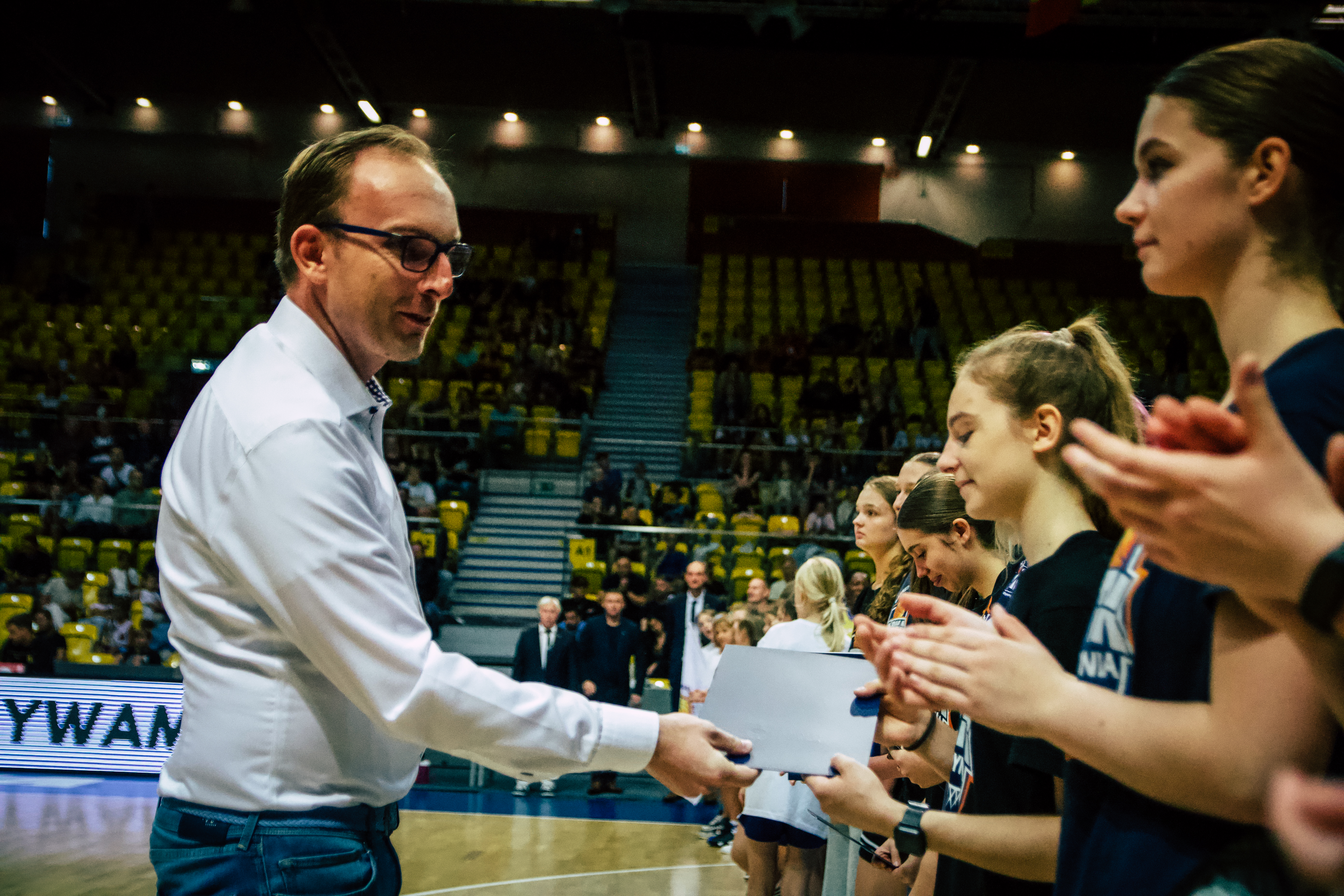 Gdyńskie koszykarki VBW Arki Gdynia wielkimi krokami zbliżają się do inauguracji Orlen Basket Ligi oraz rozgrywek europejskich EuroCup. W sobotę, 23 września, rozegrały spotkanie towarzyskie z belgijskim Royal Castors Brain. Przed meczem wręczono listy gratulacyjne od Prezydenta Miasta Gdyni Wojciecha Szczurka dla zawodniczek drużyn GTK Gdynia, które w minionym sezonie otrzymały powołanie do młodzieżowych reprezentacji Polski. To było prawdziwe święto żeńskiej koszykówki w Polsat Plus Arenie Gdynia. Spora rzesza sympatyków kobiecego basketu zdecydowała się obejrzeć starcie VBW Arki Gdynia z belgijskim Royal Castors Brain. Dla kibiców była to możliwość obserwacji nowych zawodniczek, a przede wszystkim trenera Philipa Mestdagha, który od tego sezonu będzie prowadził gdynianki.Rzut sędziowski na rozpoczęcie meczu. (fot. Agnieszka Modelska) VBW Arka nie zawiodła swoich fanów i pewnie wygrała 88:52, tym samym zostawiając kibiców z optymizmem przed pierwszym meczem o stawkę. Inauguracja Orlen Basket Ligi Kobiet dla gdynianek odbędzie się w niedzielę 8 października o 16:00. Koszykarska Arka podejmie na starcie Enea AZS Politechnikę Poznań. – Koszykówka w Gdyni ma bogate tradycje i jest jedną z jego wizytówek. Wierzę w to, że VBW Arka Gdynia w nowym sezonie udowodni, że jest najlepszą drużyną w Polsce. Cieszy fakt, że nasza młodzież osiąga również ogromne sukcesy, a zawodnicy otrzymują powołania do Kadr Polski. GTK Gdynia od wielu lat konsekwentnie realizuje swój program szkolenia i robi to bardzo dobrze, dlatego też nasze miasto często nazywane jest stolicą młodzieżowej koszykówki. Obserwując sukcesy młodych zawodniczek GTK wierzę, że ta opinia pozostanie aktualna również w przyszłości – komentuje Jakub Ubych, wiceprzewodniczący Rady Miasta Gdyni. Przed pierwszym gwizdkiem była okazja do wręczenia gratulacji dla zawodniczek GTK Gdynia, które w minionym sezonie 2022/2023 otrzymały powołania do młodzieżowych Kadr Polski. Listy gratulacyjne w imieniu Prezydenta Miasta Gdyni Wojciecha Szczurka wręczał Jakub Ubych, wiceprzewodniczący Rady Miasta Gdyni. Jakub Ubych, wiceprzewodniczący Rady Miasta Gdyni wręczający listy gratulacyjne dla zawodniczek GTK Gdynia. (fot. Agnieszka Modelska)Łącznie gratulacje otrzymało 14 młodych zawodniczek GTK, które występowały z orzełkiem na piersi w poprzednim sezonie w kategoriach wiekowych od U14 do U20: Zofia Białobrzewska U14, Martyna Wasilewska U14, Marcelina Wołowiec U14, Oliwia Lipińska U15, Victoria Rocka U15, Rozalia Sznajder U15, Zuzanna Wtulich U15, Patrycja Socha U16, Julia Kobiella U18, Wiktoria Stasiak U18, Nikola Tomasik U18, Julia Wysocka U18, Agata Gilmajster U20, Weronika Zalewska U20. – Jestem dumny, że 14-ście naszych zawodniczek otrzymało listy gratulacyjne od Prezydenta Miasta Gdyni Wojciecha Szczurka za powołanie do kadry Polski w kategoriach młodzieżowych: U14, U15, U16, U18 oraz U20. To ogromne wyróżnienie wskazuje na skuteczność naszej piramidy opierającej się na szkoleniu dziewczynek już od najmłodszych klas szkoły podstawowej – mówi Bogusław Witkowski, prezes VBW Arka Gdynia. List otrzymała również trenerka GTK Anna Talarczyk, która pełni dodatkowo funkcje selekcjonera w młodzieżowych Reprezentacjach Polski. – Możliwość prowadzenia młodzieżowej reprezentacji Polski jest wielkim wyzwaniem, ale i wyróżnieniem. Cieszę się, że moja dotychczasowa praca została doceniona. Celem każdego trenera jest pomóc młodej zawodniczce w rozwoju koszykarskim. Dla Kadry rocznika 2009 wakacje były bardzo pracowite, które zakończyły się udziałem w międzynarodowym turnieju Slovenian Cup, gdzie zajęliśmy 2 miejsce - komentuje Anna Talarczyk. Opublikowano: 23.09.2023 19:54 Autor: Paweł Stasiak (p.stasiak@gdyniasport.pl) Zmodyfikowano: 23.09.2023 21:17 Zmodyfikował: Agnieszka Janowicz