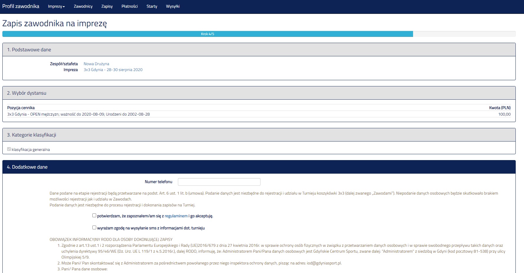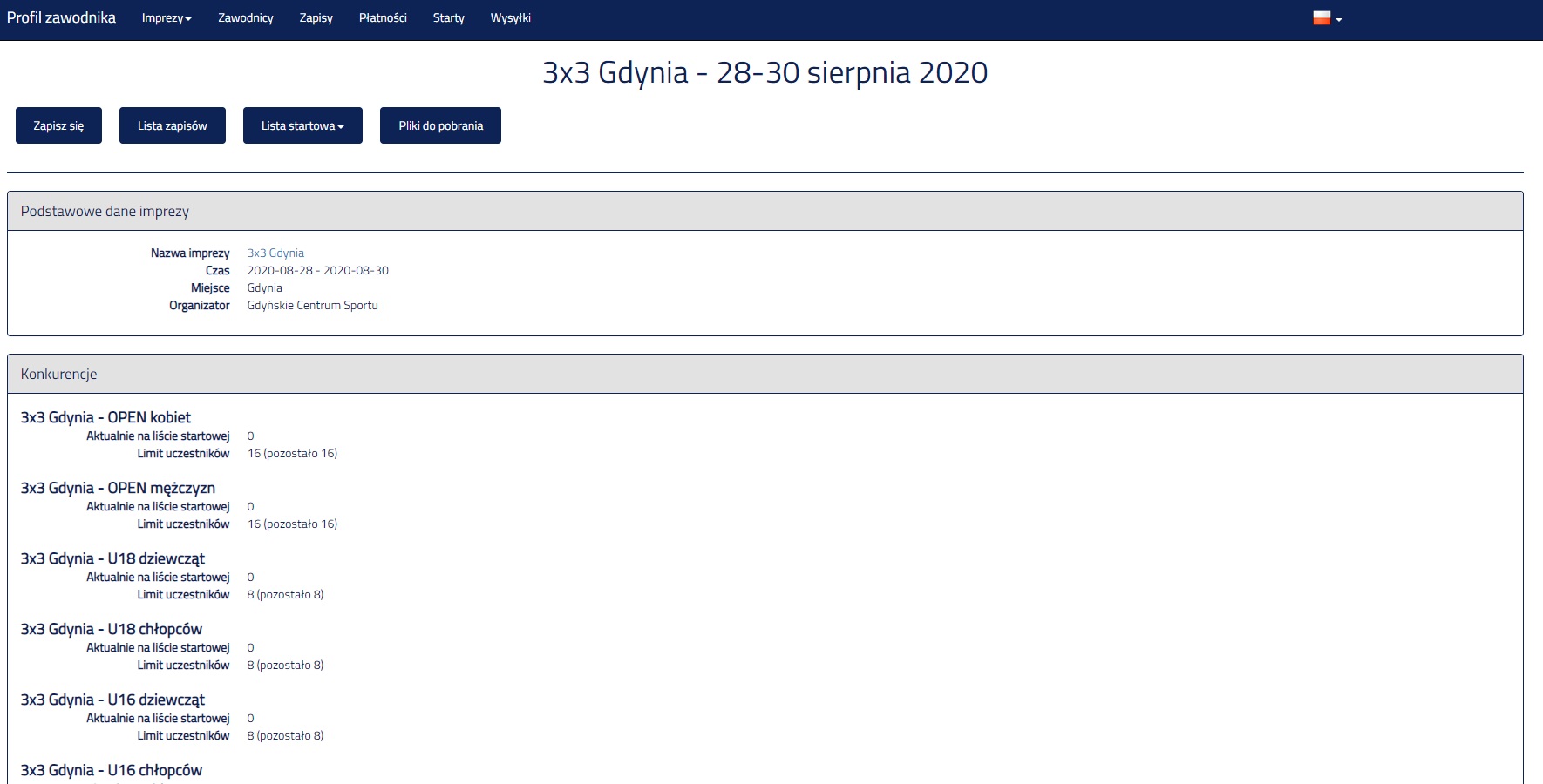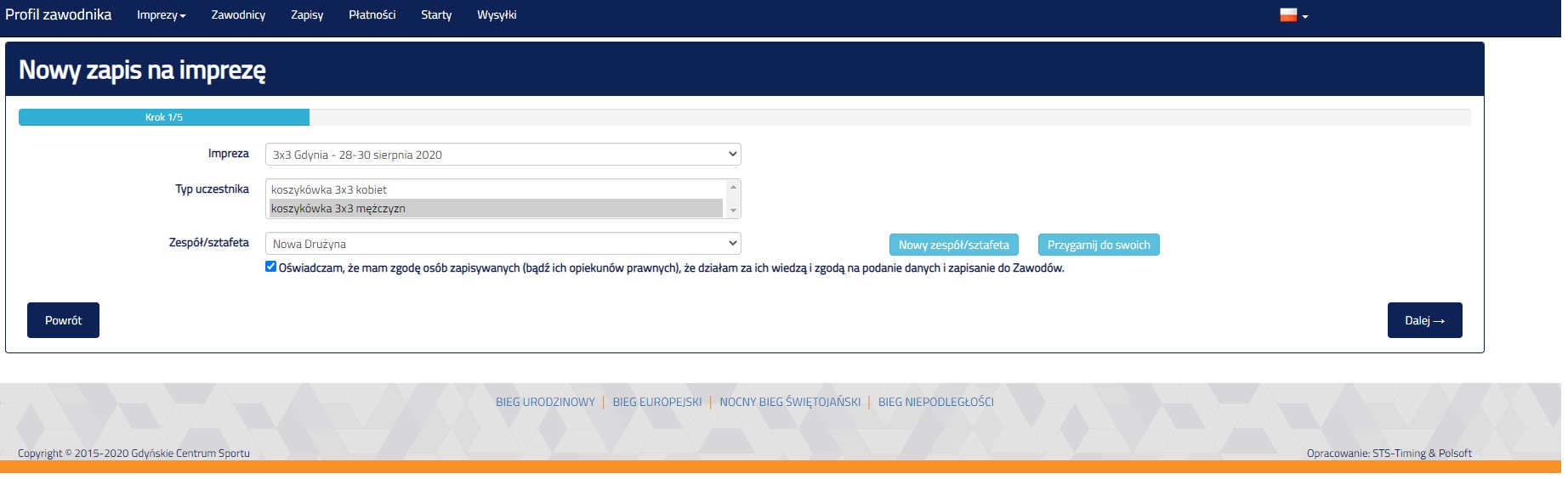 W ostatni weekend wakacji 28-30 sierpnia Gdynią zawładnie koszykówka. Turniej ulicznego basketu 3x3 Gdynia zgromadzi 800 zawodników, pojawią się też gwiazdy seniorskiego basketu i zawodnicy gdyńskich klubów. Ruszają zapisy do największej tego typu imprezy w Polsce.Na dwunastu specjalnie przygotowanych, pełnowymiarowych boiskach odbędą się pojedynki drużyn żeńskich i męskich w swoich kategoriach – od U12 do Open. Oznacza to, że każdy będzie mógł zgłosić swoją drużynę i zmierzyć się o miano najlepszej. Zobaczymy także rywalizacje o Młodzieżowe Mistrzostwo Polski do lat 17 oraz 23.By zostać częścią koszykarskiego święta, wystarczy zebrać czteroosobową drużynę i się zapisać. Jak to zrobić?INSTRUKCJA ZAPISÓW1. Należy wejść na stronę elektronicznych zapisów STS-live, zalogować się i kliknąć Turniej koszykówki 3x3 28-30 sierpnia 2020.2. Następnie Zapisz się.3. Na tym etapie decydujemy, czy zakładamy nową drużynę: Nowy zespół/sztafeta, czy dołączamy do istniejącej: Przygarnij do swoich.4. Zakładając nowy zespół, należy wpisać jego nazwę (z zachowaniem poprawności słowa i kultury językowej), uzupełnić dane czterech zawodników, w tym kapitana: Nowy zawodnik.5. Jeśli natomiast klikniemy Przygarnij do swoich, będziemy mieli możliwość wyszukania drużyny po frazie.6. Wypełniając dane, w tym datę urodzenia, system automatycznie przypisze zespół do odpowiedniej kategorii wiekowej.7. Drużyna skompletowana? Klikamy Dodaj.8. Następnym krokiem jest zaznaczenie punktu Oświadczam, że działam za wiedzą i zgodą osób zapisywanych.9. Już prawie wszystko mamy! W zależności od kategorii, system poinformuje o konieczności uiszczenia opłaty startowej. Kategoria OPEN - 100 zł, pozostałe - 50 zł. Klikamy Dalej.10. Pozostaje już tylko podanie kontaktowego numeru telefonu, zaakceptowanie regulaminu oraz zaznaczenie wymaganych zgód.11. Klikając Zapłać dokonamy wszelkich formalności finansowych.12. Gotowe! Teraz wystarczy szlifować formę. Widzimy się 28 sierpnia na parkingu przy Gdynia Arenie! Nie zapomnijcie, że podczas odbioru pakietów startowych, należy dostarczyć oświadczenia i zgody, które są zamieszczone do pobrania poniżej. Do pobrania Formularz dla dorosłych pdf324kb Formularz dla niepełnoletnich pdf344kb Formularz dla Państwowej Stacji Sanitarno-Epidemiologicznej pdf317kb Opublikowano: 31.07.2020 12:45 Autor: Michał Kozłowski (m.kozlowski@gdynia.pl) Zmodyfikowano: 31.07.2020 12:51 Zmodyfikował: Agnieszka Janowicz