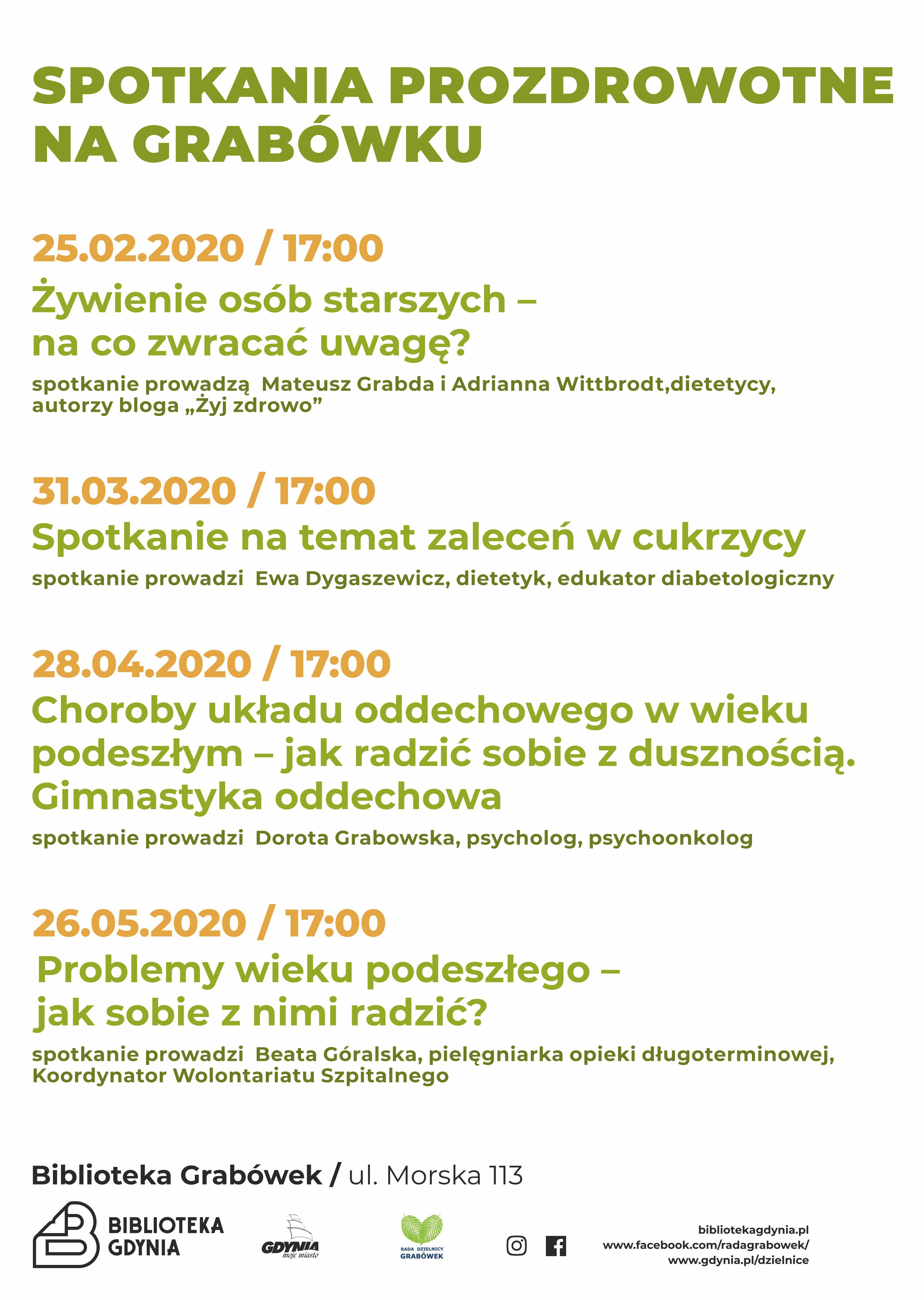 Od 25 lutego Rada Dzielnicy Grabówek wspólnie z Biblioteką Gdynia zapraszają na cykl spotkań poświęconych żywieniu, samopoczuciu i zdrowiu seniorów. Podczas prelekcji uczestnicy spotkają się z dietetykami, diabetologiem, psychologiem, psychoonkologiem oraz pielęgniarką opieki długoterminowej i koordynatorem wolontariatu szpitalnego. - Tematyka cyklu wykładów z zakresu zdrowego odżywania oraz świadomości prozdrowotnej skierowana jest przede wszystkim, chociaż nie tylko do seniorów, którzy chcą pogłębić wiedze z zakresu zdrowego stylu życia, przede wszystkim ma na celu zwiększenie świadomości i wzrostu aktywności społecznej osób starszych – mówią Aleksandra Hołomej, wiceprzewodnicząca Rady Dzielnicy oraz Beata Góralska, radna Grabówka i inicjatorka spotkań. Spotkania to cztery wykłady, od 25 lutego do 26 maja 2020 r. Cały cykl wykładów odbywać się będzie w Bibliotece Miejskiej na Grabówku przy ul. Morskiej 113. Wstęp wolny. Galeria zdjęć Pobierz galerię Spotkania prozdrowotne na Grabówku //mat.promocyjne Pobierz zdjęcie Warunki pobierania Wszelkie prawa do zdjęć lub grafik prezentowanych w ramach portalu, należą do Prowadzącego portal lub do podmiotów z nim współpracujących i podlegają ochronie prawnej. Prowadzący portal zezwala na kopiowanie i przedstawianie utworów jedynie w celach niekomercyjnych oraz pod warunkiem zachowania go w oryginalnej postaci i zachowaniem kontekstu tematu, do którego zostało wykorzystaneprzez redakcję gdynia.pl. Opublikowane materiały powinny zawsze zawierać źródło, czyli adres strony www.gdynia.pl. Na publikowanie utworów w innych celach wymagana jest zgoda właściciela strony czyli Prowadzącego portal. Opublikowano: 11.02.2020 13:56 Autor: Dorota Matejczyk (dorota.matejczyk@gdynia.pl) Zmodyfikowano: 24.02.2020 14:37 Zmodyfikował: Dorota Matejczyk-Waletko