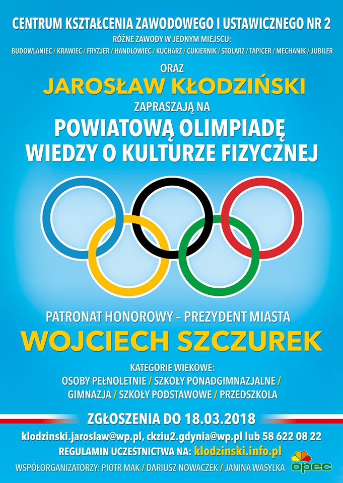 Rywalizacja będzie sportowa, choć nie na boisku czy bieżni, ale zasady fair play będą obowiązywać. Już 22 marca w Gdyni startują eliminacje do Powiatowej Olimpiady Wiedzy o Kulturze Fizycznej. Zgłoszenia są przyjmowane do 18 marca. Olimpiada organizowana będzie dla uczniów szkół i osób pełnoletnich. Celem, który przyświeca organizatorom, jest propagowanie wiedzy o sporcie i ruchu olimpijskim. Pytania dotyczyć będą kultury fizycznej w Polsce – w tym w Gdyni – oraz ruchu olimpijskiego. A co rozumiemy przez kulturę fizyczną? Mała podpowiedź: sport, turystykę, rekreację, wychowanie fizyczne i rehabilitację. Więcej podpowiedzi nie będzie, ale organizatorzy zapewniają, że pytania, przynajmniej w części eliminacyjnej, nie będą trudne.– Test eliminacyjny będzie testem wyboru zawierającym 20 pytań. I każdy, kto interesuje się kulturą fizyczną, powinien sobie z nimi poradzić. Schody zaczną się później – ostrzega Jarosław Kłodziński, gdyński radny, współorganizator konkursu. – W półfinale trzeba będzie już odpowiedzieć na 100 pytań. Patronat honorowy na Olimpiadą objął Prezydent Gdyni Wojciech Szczurek, a w przygotowanie pytań włączyli się między innymi: Marek Łucyk, dyrektor Gdyńskiego Centrum Sportu, Janusz Różalski, prezes Okręgowego Przedsiębiorstwa Energetyki Cieplnej, Natalia Gromow, dyrektor Miejskiej Biblioteki Publicznej, Bożena Zglińska, dyrektor Centrum Aktywności Seniora, Lech Żurek, prezes Przedsiębiorstwa Komunikacji Miejskiej, Cezary Staniszewski, trener polskiej kadry olimpijskiej w strzelectwie, Arkadiusz Sobieraj, prezes Wojskowego Klubu Sportowego „Flota” Gdynia, Marek Gutteter, prezes Gdyńskiego Towarzystwa Piłki Ręcznej, Tomasz Bobryk, dyrektor sportowy Stowarzyszenia Inicjatywa „Arka". Uczestnicy będą walczyć o Puchar Przewodniczącego Komisji Sportu Rady Miasta Gdyni. Najlepsi finaliści zostaną nagrodzeni medalami, sprzętem sportowym i turystycznym. Regulamin olimpiady jest dostępny na stronie klodzinski.info.pl Zgłoszenia przyjmowane są do 18 marca 2018 roku telefonicznie 58 622 26 22 lub mailowo klodzinski.jaroslaw@wp.plEliminacje odbędą się 22 marca, półfinał 6 kwietnia i jeszcze w kwietniu planowany jest finał. Olimpiada odbędzie się w Centrum Kształcenia Zawodowego i Ustawicznego Nr 2 (ul. Dąbka 207). Opublikowano: 15.03.2018 09:00 Autor: Lechosław Dzierżak (lechoslaw.dzierzak@gdynia.pl) Zmodyfikowano: 15.03.2018 10:00 Zmodyfikował: Karolina Szypelt