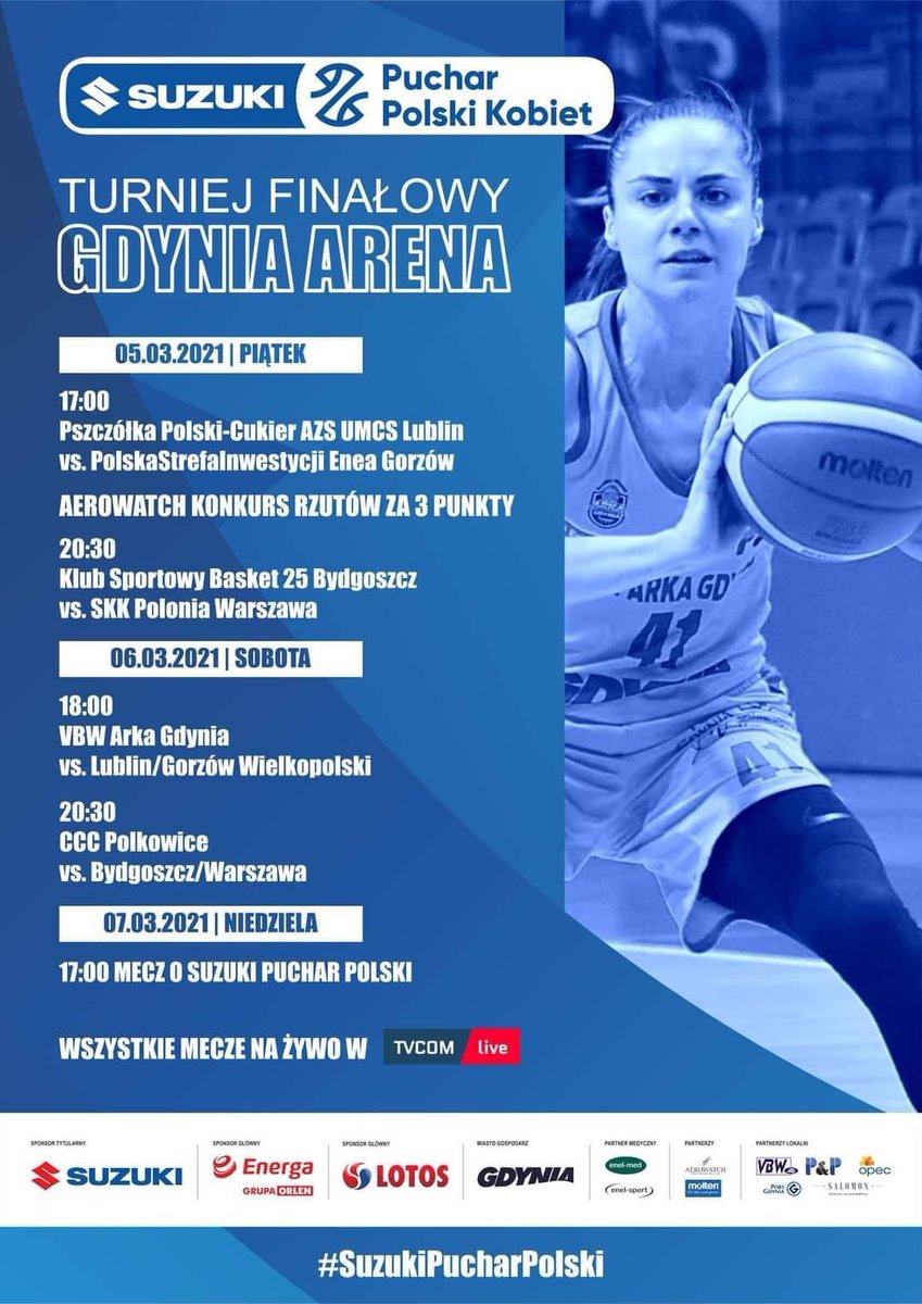 W dniach 5-7 marca w Gdynia Arenie będzie się toczyć walka o Suzuki Puchar Polski w koszykówce kobiet. W zawodach weźmie udział sześć drużyn. W piątek cztery zespoły zagrają w ćwierćfinałach, natomiast dwa kolejne - uczestnik EuroLeague Women i drużyna najwyżej sklasyfikowana w tabeli Energa Basket Ligi Kobiet po 11. rozegranych kolejkach rundy zasadniczej - dołączą w sobotę w fazie półfinałów.Przypomnijmy, że losowanie par odbyło się 8 lutego w Gdynia Arenie w obecności wiceprezydenta miasta Gdyni Marka Łucyka, prezesa VBW Arki Bogusława Witkowskiego, członka zarządu PZKosz Marcina Korpolewskiego oraz dyrektora marketingu Suzuki Motor Poland Mikołaja Matsumoto. – Dodatkową atrakcją będą rozgrywki Młodzieżowego Pucharu Polski, w których powalczą cztery zespoły U19, awansujące bezpośrednio z ćwierćfinałowych turniejów Mistrzostw Polski U19. Pokazując, jakim mocnym graczem w każdej grupie wiekowej na arenie polskiej koszykówki kobiecej jest Gdynia – dodaje Paweł Brutel, zastępca dyrektora Gdyńskiego Centrum Sportu. Mecze drużyn młodzieżowych odbędą się w sobotę i w niedzielę, warto więc zarezerwować sobie czas w oba dni i zasiąść przed ekranami komputerów, gdyż wszystkie spotkania będzie można zobaczyć online na platformie www.tvcom.pl, do czego gorąco zachęcamy.W pierwszym ćwierćfinale Suzuki Puchar Polski drużyna Pszczółka Polski-Cukier AZS-UMCS Lublin zmierzy się z PolskąStrefąInwestycji Eneą Gorzów Wlkp., natomiast w drugim meczu wicemistrz Polski KS Basket 25 Bydgoszcz podejmie najlepszą drużynę po pierwszej rundzie sezonu zasadniczego w I lidze – SKK Polonię Warszawa.Zespołami rozstawionymi są VBW Arka Gdynia oraz CCC Polkowice, które swoją rywalizację rozpoczną w sobotę od półfinałów. Mistrz Polski zagra ze zwycięzcą pary Pszczółka Polski-Cukier AZS-UMCS Lublin lub PolskaStrefaInwestycji Enea Gorzów Wlkp., a CCC Polkowice z KS Basket 25 lub SKK Polonia.Przypomnijmy najważniejsze sukcesy drużyn, które wezmą udział w Suzuki Pucharze Polski.VBW Arka Gdynia – to jedna z najbardziej utytułowanych drużyn w Polsce, dwunastokrotny mistrz Polski, dziewięciokrotny zdobywca Pucharu Polski oraz dwukrotny wicemistrz Euroligi i klubowy wicemistrz świata.Pszczółka Polski-Cukier AZS-UMCS Lublin – to drużyna, która nieprzerwanie od 2014 roku występuje w najwyższej klasie rozgrywkowej w Polsce. Największym dokonaniem lubelskich „Pszczółek” było wywalczenie Pucharu Polski w 2016 roku.CCC Polkowice – rozgrywa obecnie swój dwudziesty sezon w Ekstraklasie. W ciągu tego czasu klub trzykrotnie sięgał po mistrzostwo Polski, a także po 3 srebrne i brązowe medale. Są także trzy Puchary Polski i szansa na kolejny. Polkowicka drużyna wielokrotnie reprezentowała polską koszykówkę w europejskich rozgrywkach, dwukrotnie awansując do najlepszej ósemki Euroligi.PolskaStrefaInwestycji Enea Gorzów Wielkopolski – w ostatnich sezonach EBLK sięgnęła po srebrny i brązowy medal.KS Basket 25 Bydgoszcz - klub istniejący od 1994 roku, plasujący się w czołówce rozgrywek Ekstraklasy od 2013 roku. W swoim dorobku ma 6 medali – 4 srebrne oraz 2 brązowe.SKK Polonia Warszawa – drużyna z Warszawy świętuje w bieżącym roku 96. urodziny istnienia sekcji żeńskiej koszykówki.Suzuki Puchar Polski - terminarz:5 marca (piątek) 17.00 Pszczółka Polski-Cukier AZS UMCS Lublin - PolskaStrefaInwestycji Enea Gorzów Wielkopolski, AEROWATCH Konkurs rzutów za 3 punkty, 20.30 Klub Sportowy Basket 25 Bydgoszcz - SKK Polonia Warszawa. 6 marca (sobota) 17.45 VBW Arka Gdynia - Pszczółka Polski-Cukier AZS UMCS Lublin/PolskaStrefaInwestycji Enea Gorzów Wielkopolski, 20.30 CCC Polkowice - Klub Sportowy Basket 25 Bydgoszcz/SKK Polonia Warszawa. 7 marca (niedziela) 17.00 finał. Młodzieżowy Puchar Polski - terminarz6 marca (sobota) 12.30 Enea AZS AJP Gorzów Wielkopolski - Enea AZS Szkoła Gortata Poznań, 15.00 GTK Gdynia - UKS Lider Swarzędz. 7 marca (niedziela) 12.00 mecz o 3. miejsce, 14.30 finał. Opublikowano: 05.03.2021 09:19 Autor: Marek Urbaniak (m.urbaniak@gdyniasport.pl) Zmodyfikowano: 05.03.2021 10:12 Zmodyfikował: Redakcja portalu Gdynia.pl