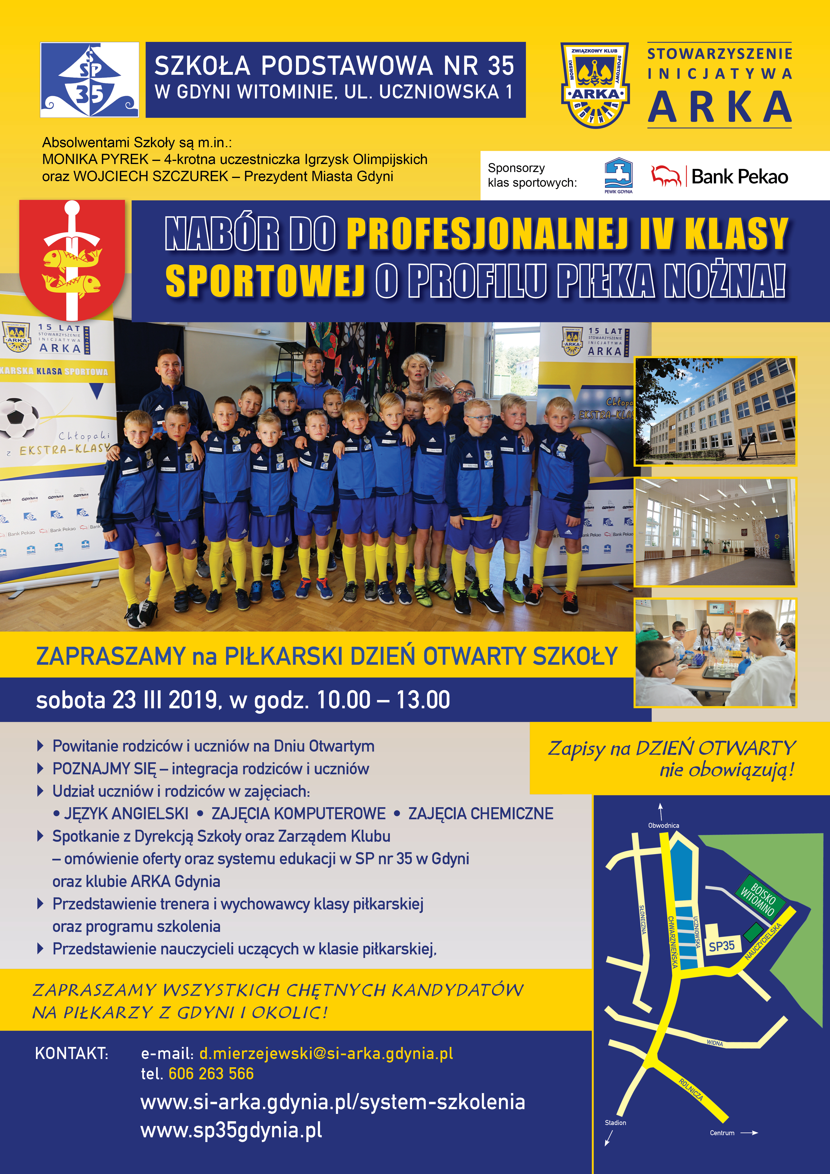 Stowarzyszenie Inicjatywa Arka Gdynia rok temu wystartowało z projektem, który okazał się wielkim sukcesem. Od roku szkolnego 2018/2019 w Szkole Podstawowej nr 35 funkcjonuje klasa piłkarska na poziomie IV. Nabór do kolejnego rocznika rusza w poniedziałek 25 marca, dlatego w sobotę, o godzinie 10:00 władze placówki zapraszają na Dzień Otwarty. Wstęp wolny.To propozycja dla dzieci, które chcą kandydować do statusu ucznia-zawodnika w piłkarskiej klasie IV w roku szkolnym 2019/2020.– To doskonała okazja, by rodzice przekonali się o zaletach placówki, do której mogą zapisać swoje pociechy – mówi Marek Łucyk, wiceprezydent Gdyni. I dodaje: – Stale rozwijamy gdyńską ofertę edukacyjną. Klasa piłkarska to obustronna korzyść: klub rozwija potencjalne talenty, a młodzi zawodnicy dobrą formę i nietuzinkowe umiejętności.Szkoła Podstawowa nr 35 przygotowała autorski projekt prowadzenia klas sportowych, w oparciu o optymalizację uzyskiwania wysokiego poziomu wiedzy przez uczniów – zawodników, w ramach podstawy programowej i zajęć pozalekcyjnych. Placówka znajduje się przy ul. Uczniowskiej 1 na Witominie. Jej absolwentami są m. in. prezydent Gdyni Wojciech Szczurek czy wielokrotna medalistka mistrzostw świata i Europy w skoku o tyczce Monika Pyrek.Dzieci uczące się w klasie sportowej mogą liczyć na sześć treningów piłkarskich (45 minut każdy), jeden pływacki oraz dziesięć godzin zajęć wychowania fizycznego tygodniowo. Co ważne, aby zgłosić się do naboru nie trzeba być zawodnikiem klubowym.Każdy z obecnych na Dniu Otwartym SP 35 będzie miał okazję lepiej poznać placówkę, jej nauczycieli, ale przede wszystkim szczegółowe założenia programu nauczania oraz systemu sportowego szkolenia w oparciu o porozumienie organizacyjne i merytoryczne z klubem Arka Gdynia.Podczas trzygodzinnego wydarzenia nie zabraknie pokazów lekcji informatyki, chemii oraz j. angielskiego, spotkanie z dyrekcją szkoły, a także przedstawienie wychowawców, nauczycieli oraz trenera, którzy będą sprawować pieczę nad nauką młodych piłkarzy.– Miasto sukcesywnie inwestuje w infrastrukturę sportową oraz szkolenie dzieci i młodzieży. Jednym z priorytetów, jeśli chodzi o sport, jest budowanie profesjonalnych struktur w gdyńskich klubach. Żółto-niebieska piramida szkoleniowa już od lat funkcjonuje na bardzo wysokim poziomie – zauważa dyrektor Gdyńskiego Centrum Sportu Rafał Klajnert.Początek procesu rekrutacyjnego zaplanowany jest na poniedziałek 25 marca i potrwa do 26 kwietnia bieżącego roku. Jego kolejnymi etapami będą testy sprawności piłkarskiej (7-13 maja) oraz ogłoszenie listy przyjętych do klasy sportowej SP 35 (31 maja). Opublikowano: 21.03.2019 12:17 Autor: Paweł Marszałkowski (pawel.marszalkowski@gdyniasport.pl) Zmodyfikowano: 22.03.2019 08:27 Zmodyfikował: Aleksandra Rzewuska